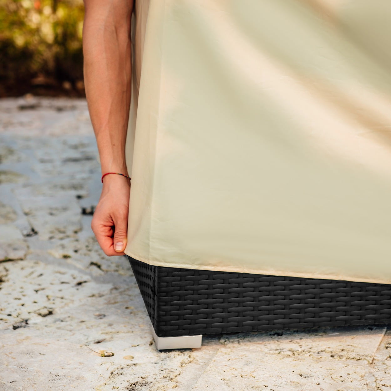Features: Galvanized steel construction Durable polyrattan wicker Steel center cover Electronic ignition 3kgs lava rocks Back access door with magnetic latch Weatherproof protective cover Runs on propane fuel (not included) Dimensions: 28” W x 28” D x 24.8” H