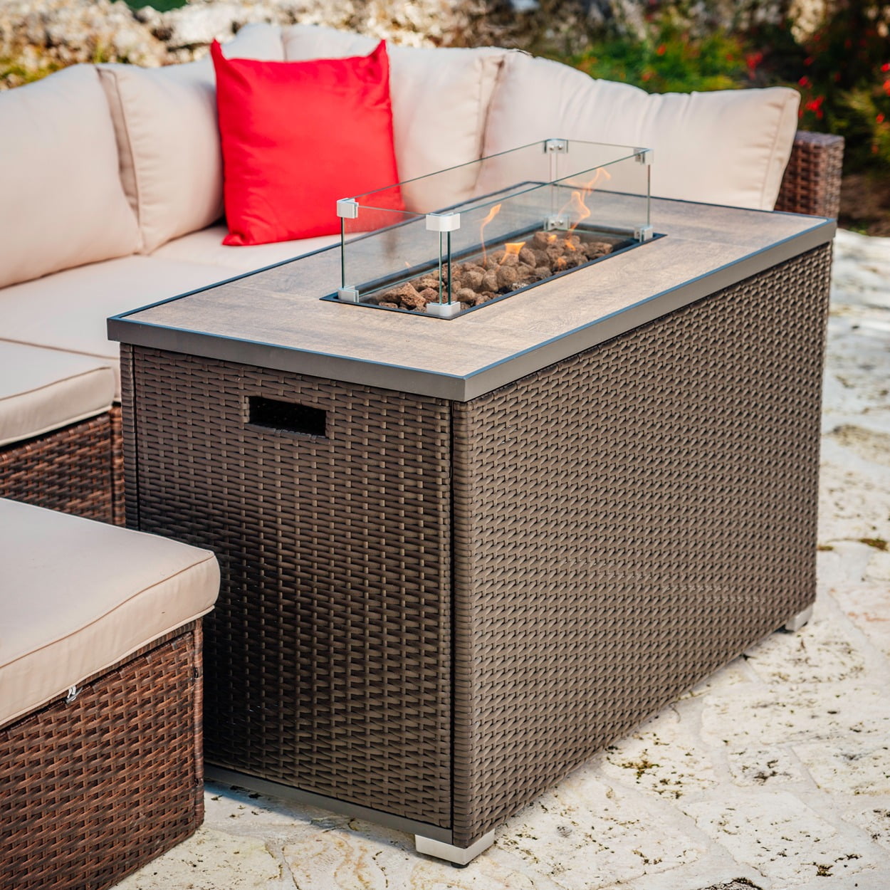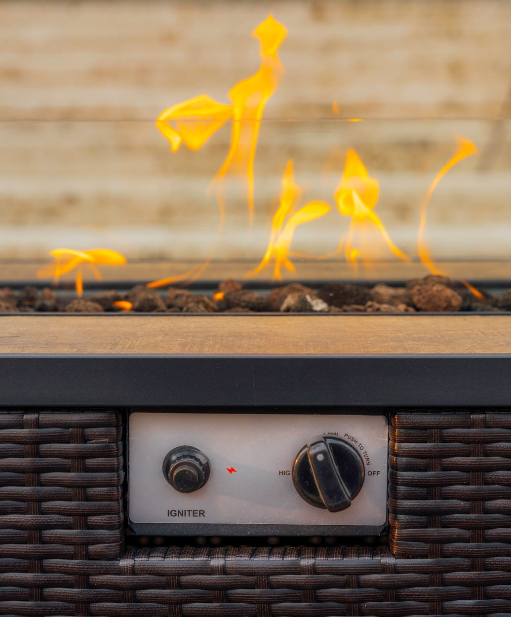 Features: Galvanized steel construction Durable polyrattan wicker Steel center cover Electronic ignition 3kgs lava rocks Ceramic tile top, wood-grain design Tempered glass windshield Side access door with magnetic latch Weatherproof protective cover Runs on propane fuel (not included) Dimensions: 43” W x 22.04” D x 24.8” H