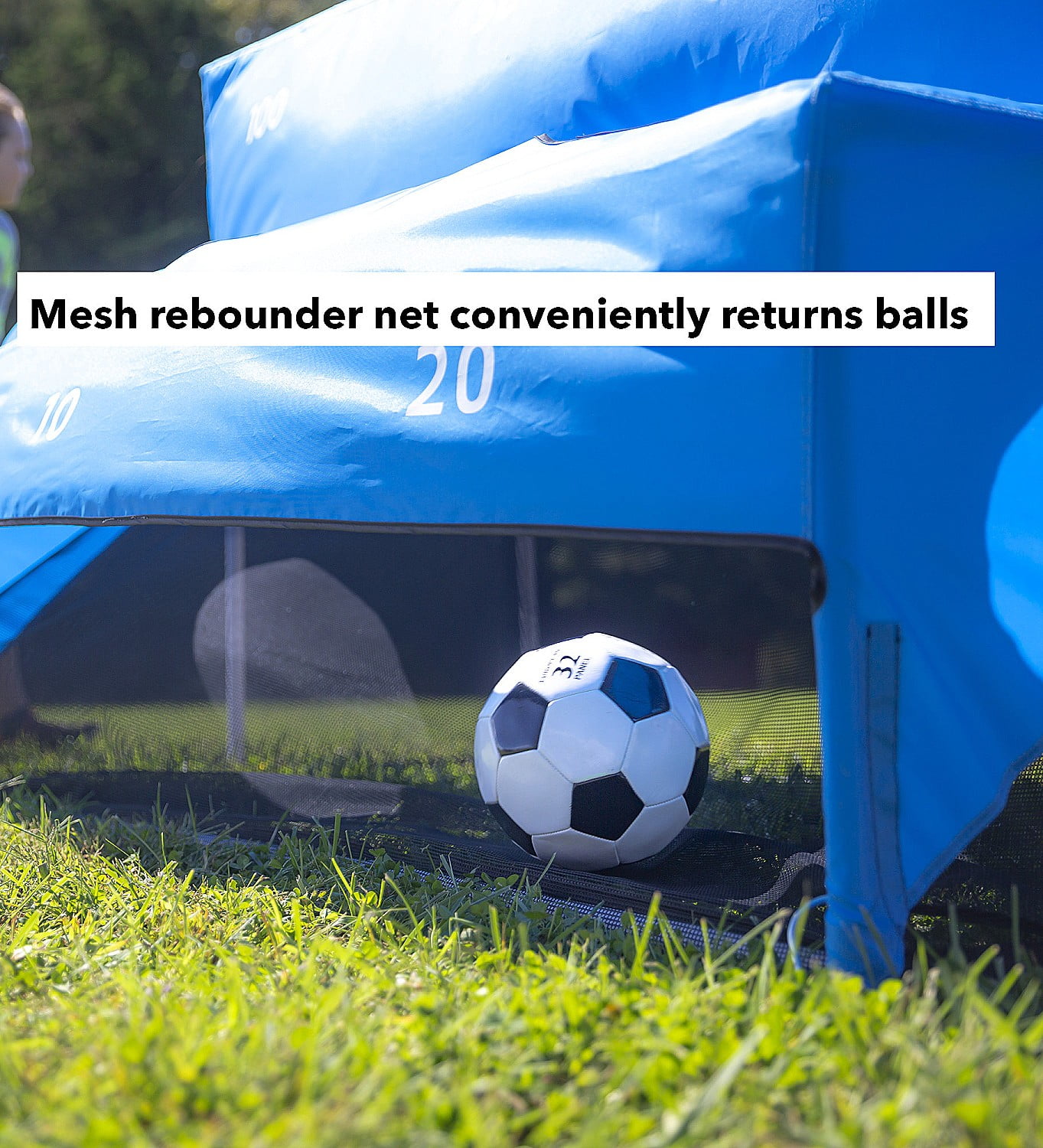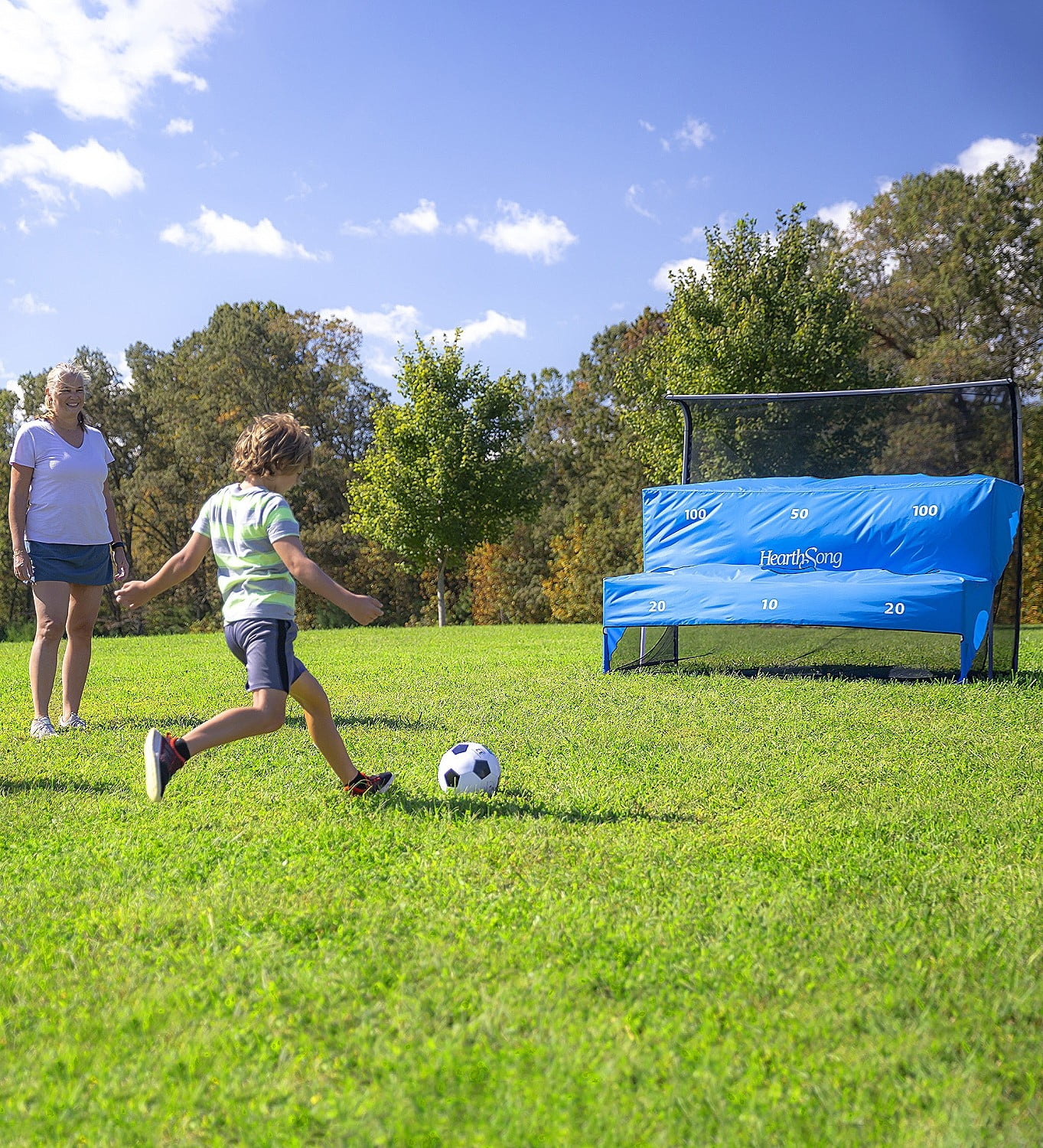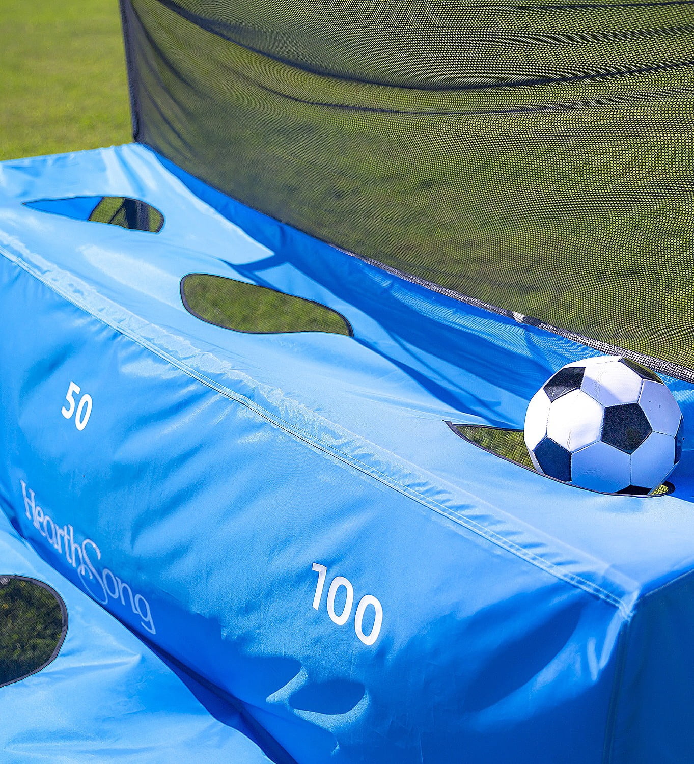 Our exclusive outdoor active game is great for families and multiple age and skill levels to play together! Includes 7’L x 3¾’W x 5½’H PVC goal, polyester goal cover with 6 scoring targets, 2 official-size 5 vinyl-stitch soccer balls, hand pump, carrying bag and 2 ground stakes Arcade-like game has a curved incline at the top providing an extra challenge for more experienced players Mesh rear rebounder net returns soccer balls to players Skill-building play: hone soccer skills such as ball control and precision kicks, and encourage good sportsmanship!