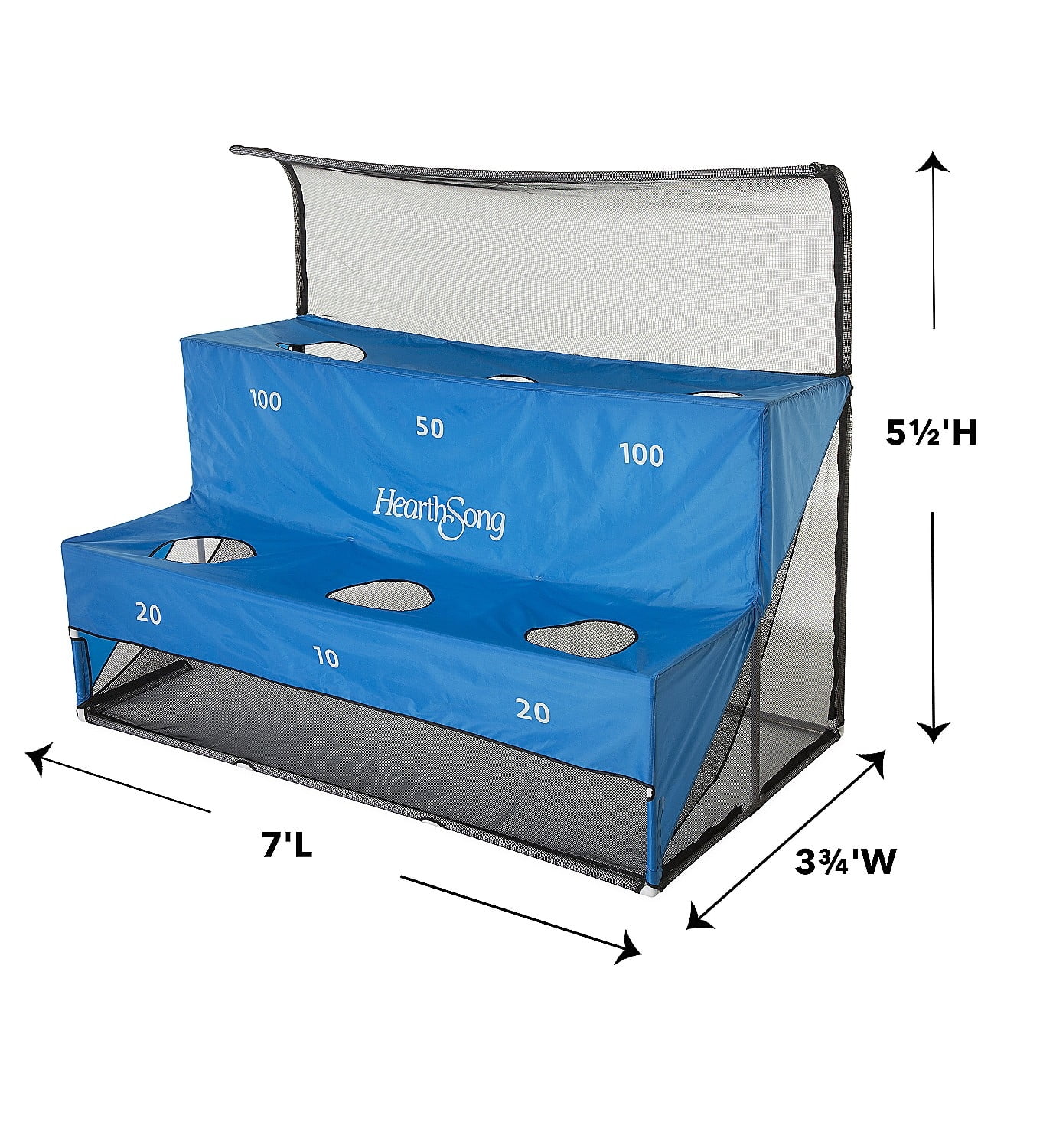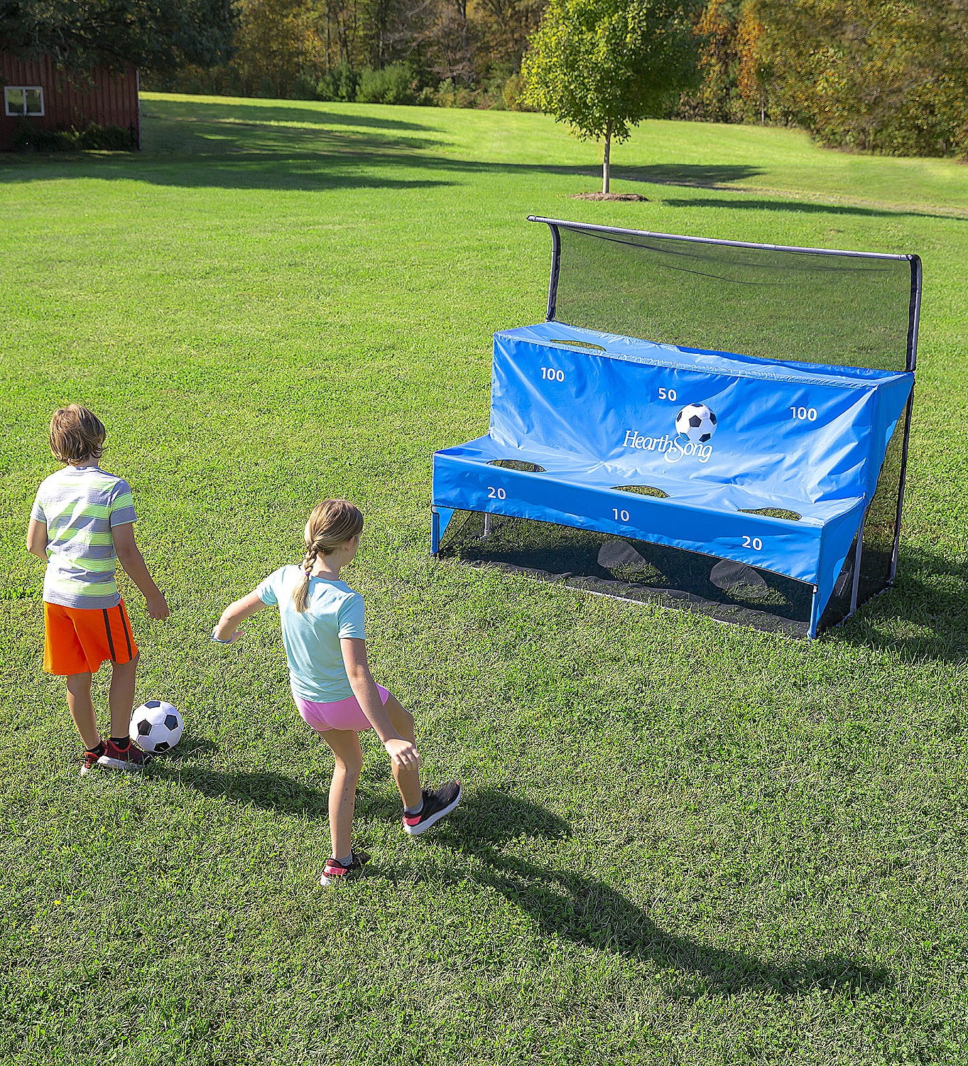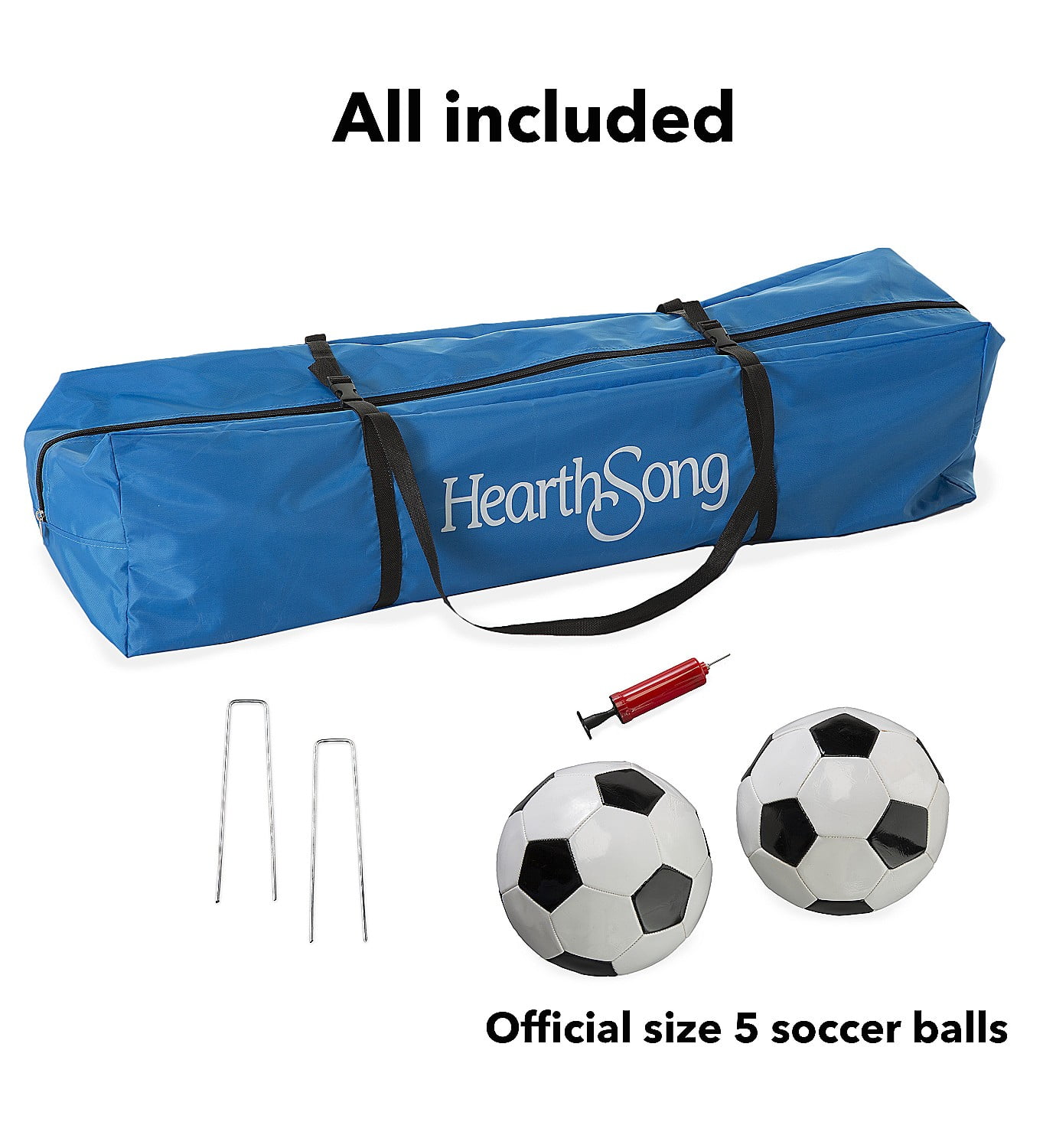 HearthSong Large Soccer Arcade Outdoor Active Game Set with Soccer Goal, Two Soccer Balls, and Carry Bag No ordinary soccer goal—challenge yourself with our arcade-style Soccer Arcade Game! You won’t need a full soccer field to enjoy this game—just skip straight to the scoring! With 6 scoring targets on the polyester goal cover, the object of the game is to land your soccer ball in the highest scoring target. The curved incline at the top of the 7’L x 3¾’W x 5½’H goal mimics a classic arcade game and makes scoring a goal more challenging. Convenient mesh rebounder net returns soccer balls right back to the kicker, so play can continue without having to retrieve runaway soccer balls. Kids (and adults) who love soccer will enjoy competitive play while honing soccer skills such as ball control and precision kicks at the same time. This outdoor active game is the perfect fit for a backyard barbecue, kids’ birthday party, field day, or play date. Includes PVC poles with connectors, mesh rebounder net, fabric goal cover with 6 scoring targets, 2 official-size 5 vinyl-stitch soccer balls, hand pump, convenient carrying bag, and 2 ground stakes for stability. Adult assembly required, 2 adults recommended for assembly.