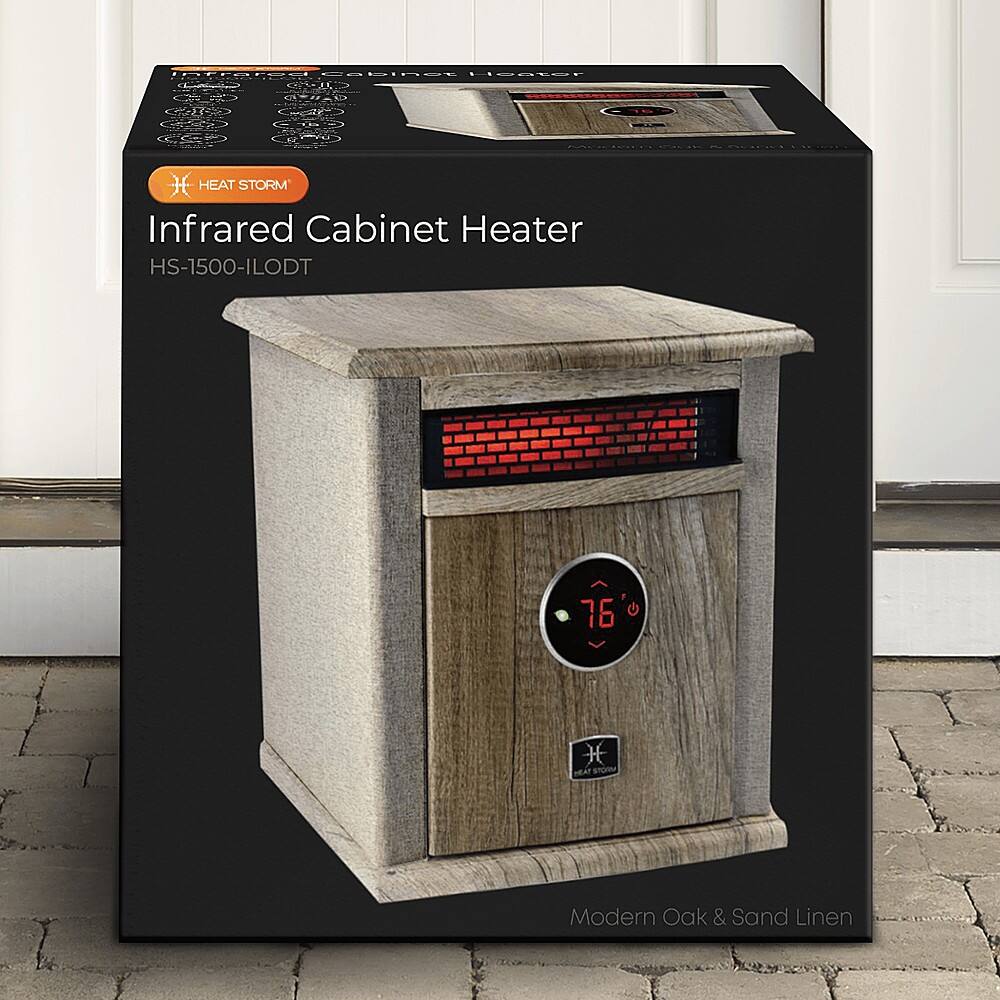 The Heat Storm Logan Deluxe Portable Infrared Quartz Heater has space saving design and is ultra-efficient for a medium-large room. This heater features four of our quartz infrared elements that are encased in our Patent HMS Technology. Our HMS Technology is double wall heat exchanger that provides better safety features than our competitors by creating a safer heating environment for you. Simply put, you get better heat, quicker delivery, faster heating and runs more efficiently all of which saves you money. All electrical components are warrantied for 1-year. There is lifetime washable air filter. An Eco Setting will reduce the wattage from 1,500 to 750 creating less power consumption. The heater is surrounded by our stylish wood cabinet with a black front that is cool to the touch. Casters are included to make moving the heater from room to room easily. This amazing heater also includes a remote control to operate the Digital Thermostat allowing you ultimate control.