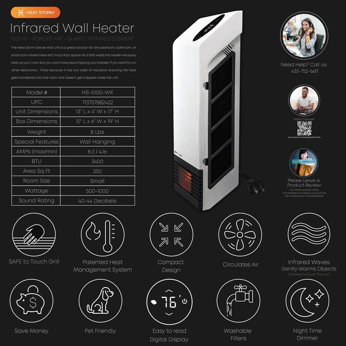 The deluxe 3,100 BTU electric infrared wall mounted heater is a great solution for any bedroom or small room where there is not much floor space. At 1000-Watt this heater will easily heat up your room but you will not have issues tripping your breaker if you want to run other electronics. This deluxe 3,100 BTU electric infrared wall mounted heater is safe to touch, even on the grill, making a great choice for anyone. This unit has two power modes, one uses the full 1,000-Watt (red leaf), while the second mode (green leaf) uses only 500-Watt. Each unit contains our patented heat exchanger with HMS technology that allows maximum heat from the infrared quartz bulbs without any heat loss from the unit.