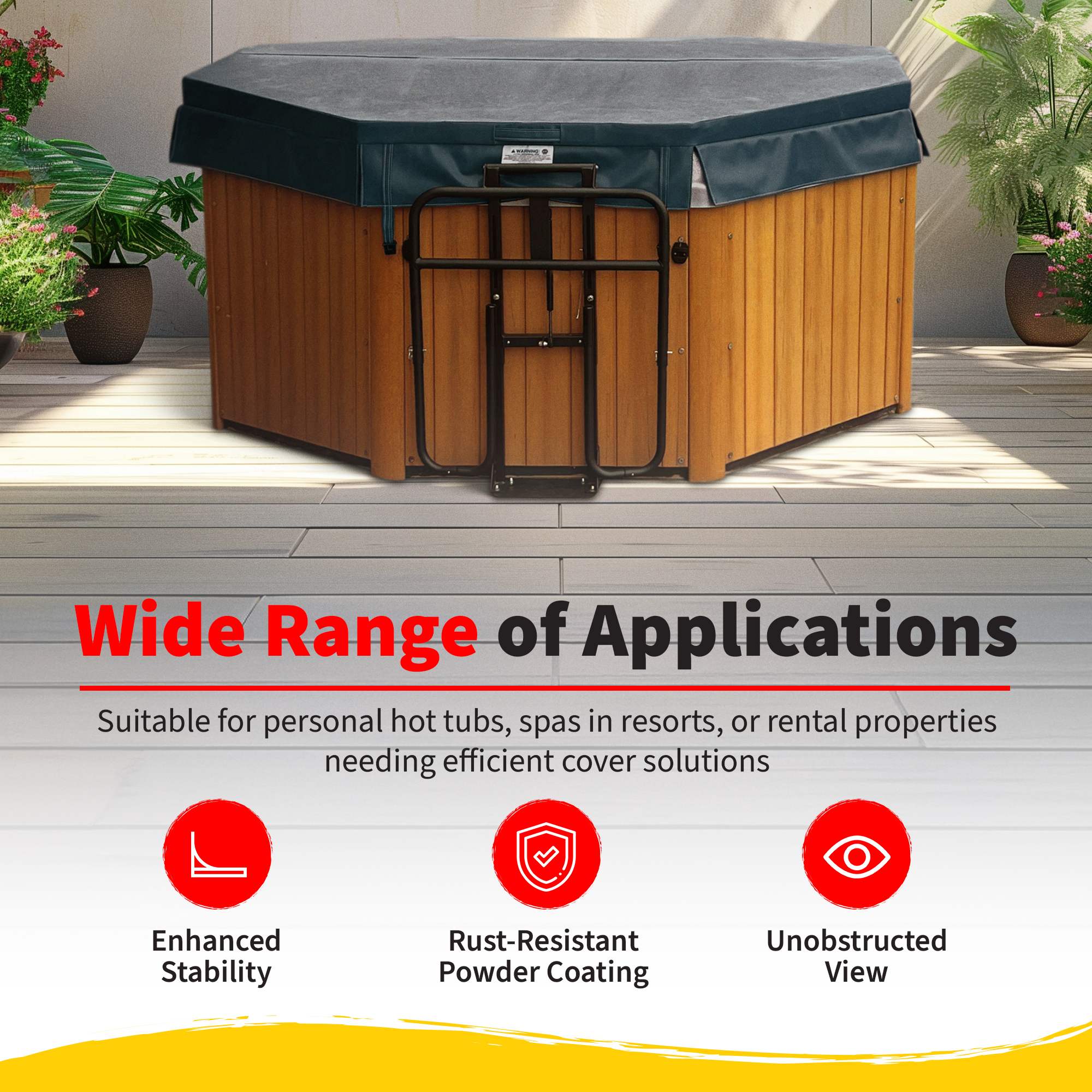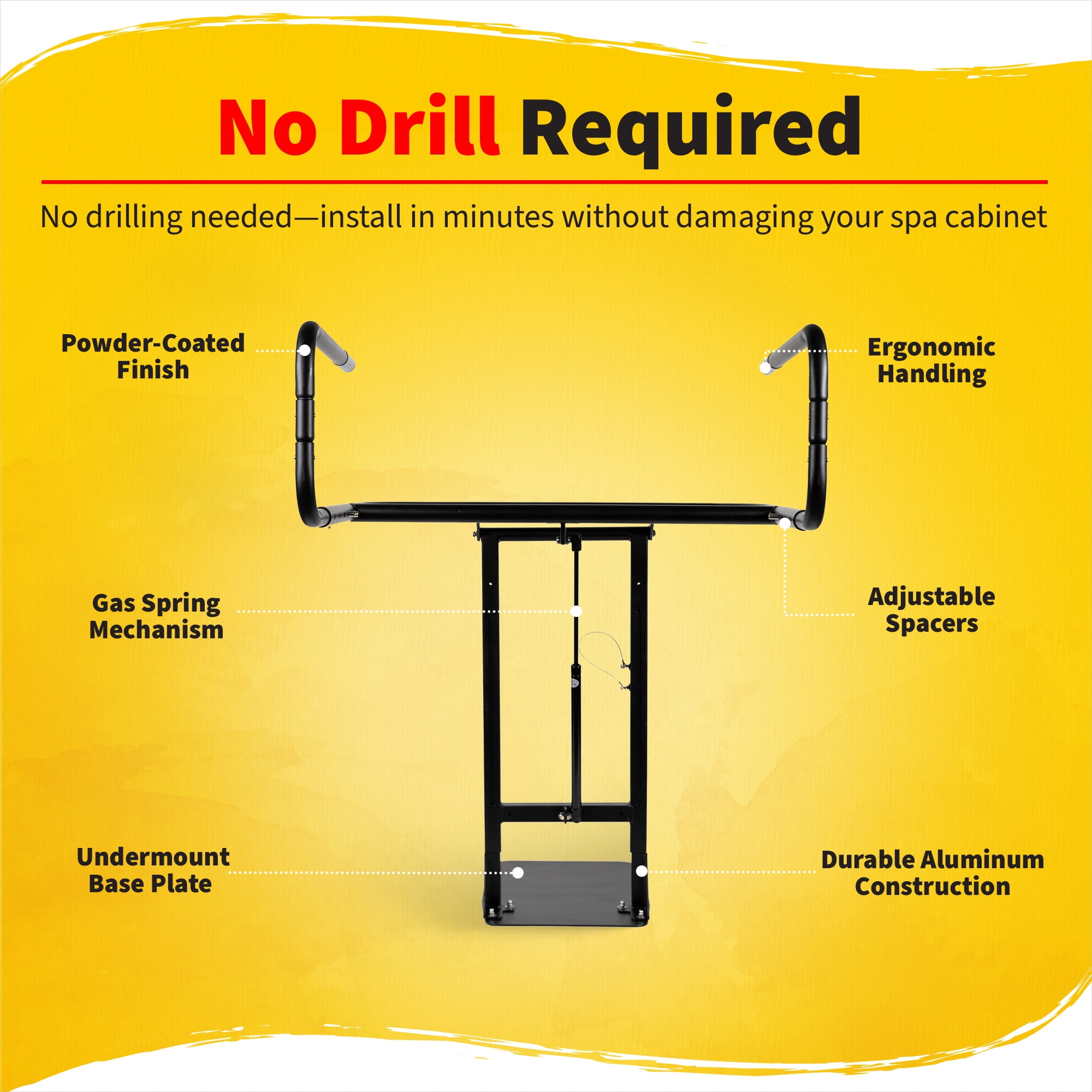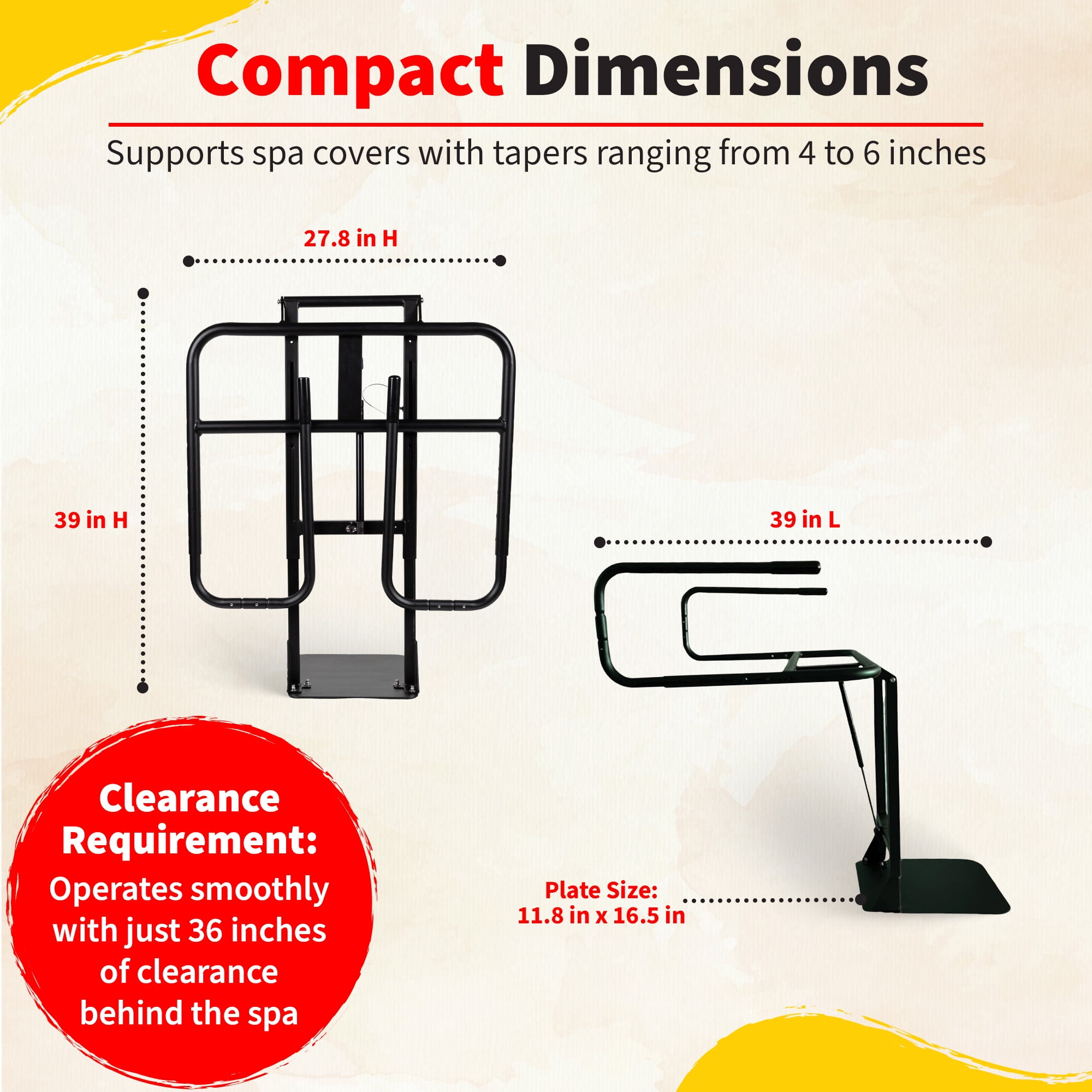 Designed to work with any spa No spa cabinet installation needed Gas spring design allows for easy cover removal Raises and lowers spa covers Crafted from powder-coated aluminum Spacers allow for spa covers with 4-in to 6-in tapers Requires 36-in of clearance to operate properly 5-year limited warranty