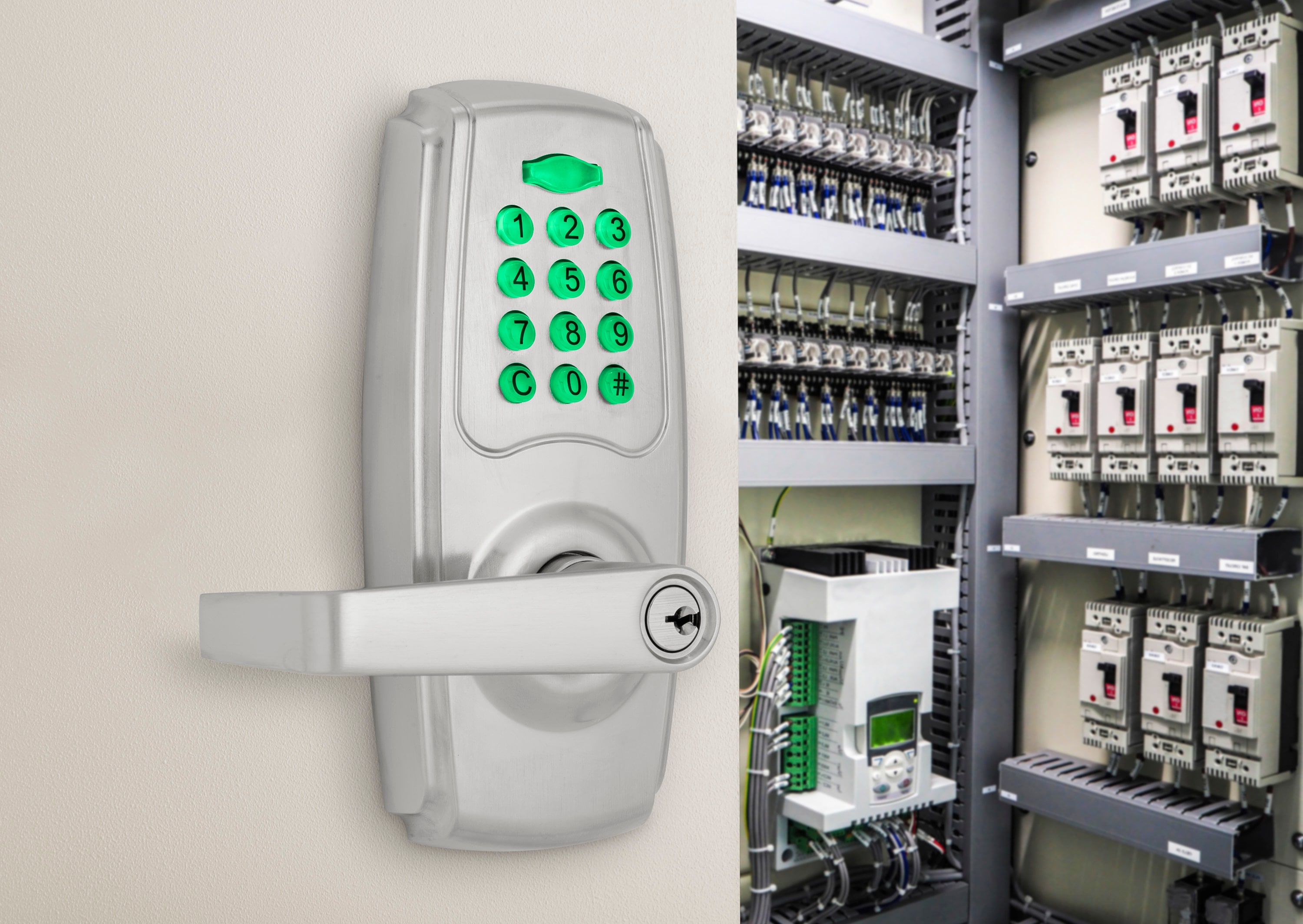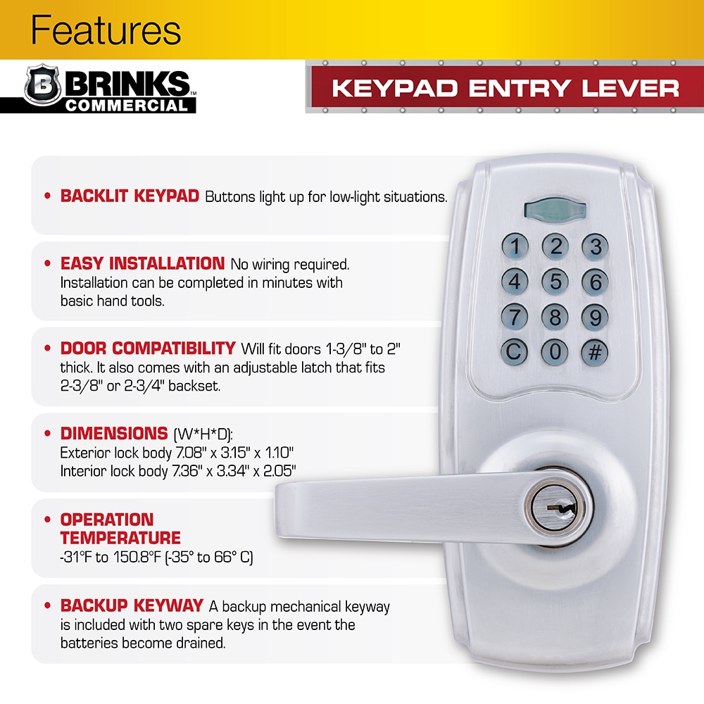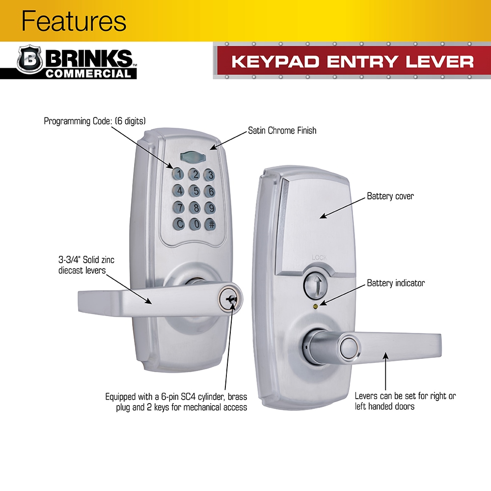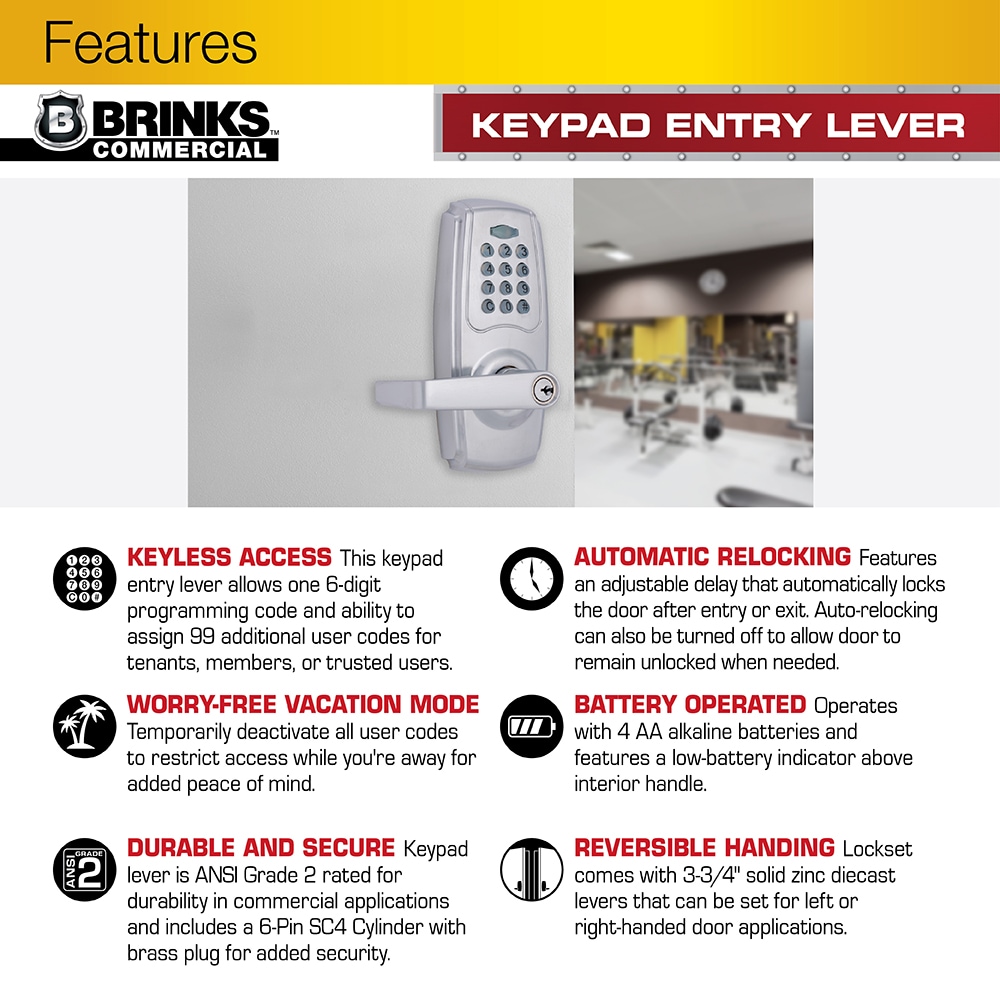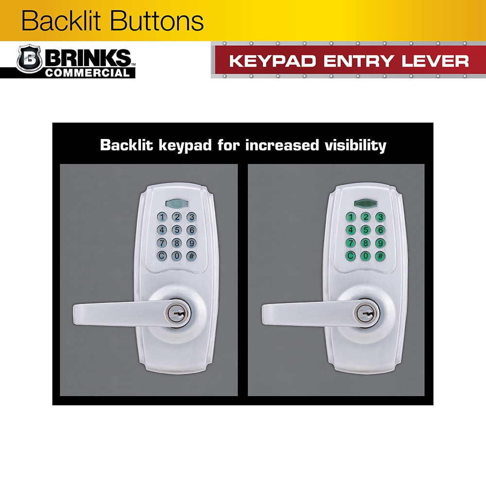 The Brinks Commercial Keypad Entry Lever provides convenient keyless protection for your commercial space. This keypad lever set is perfect for entry doors or doorways where added security is needed such as; maintenance rooms, supply closets or member-only access areas. It comes with an adjustable auto-lock feature that ranges from 6-90 seconds to ensure the door is locked after entry or exit. The keypad has illuminated buttons that light up when pressed. The lock is programmable and can hold up to 99 additional user codes and has vacation mode that temporarily deactivates all codes. The lever set runs on 4, AA alkaline batteries (Not included) and features a low battery indicator on the interior handle. The keypad entry lever is ANSI Grade 2 rated for commercial use and has a 6-Pin SC4 Cylinder, brass plug for added security. An adjustable latch, 2 spare keys, t-strike and full lip strike are included.