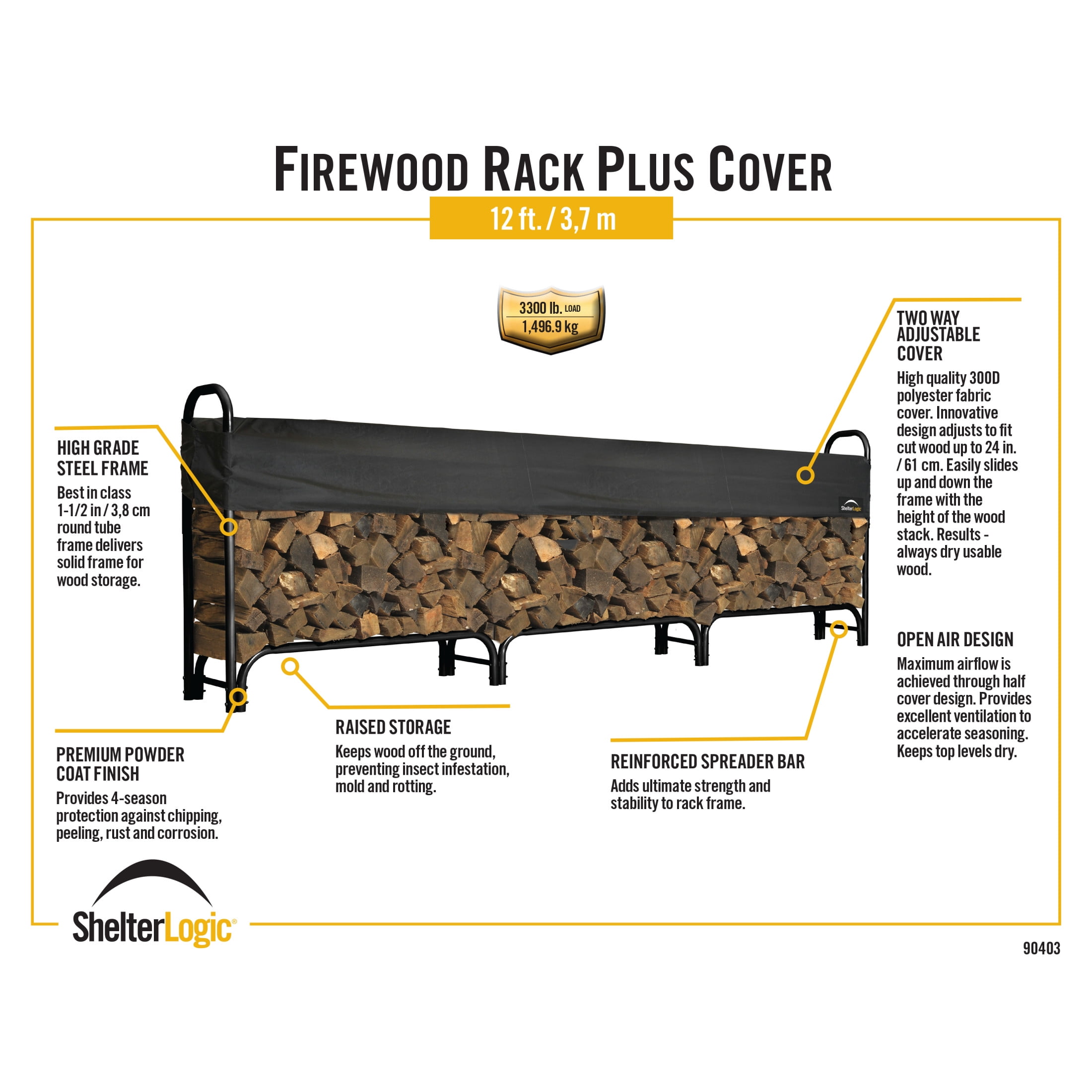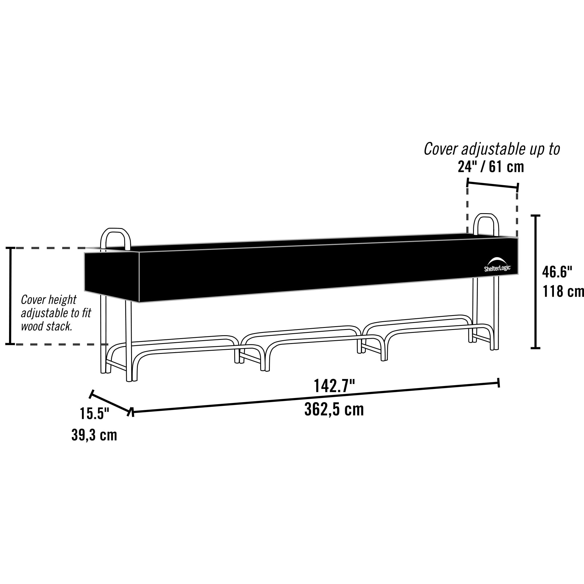 Assembled Dimensions: 15.5 In. W X 49.7 In. D X 46.6 In. H Two-Way Adjustable Polyester Cover Slides Up And Down To Fit The Height Of The Wood Stack Cover Adjusts To Fit Split Wood Up To 24 In. In Length Holds 3/4 Cord Of Wood Keeps Firewood Off Of The Ground, Eliminating Bugs, Mold Growth And Wood Rot Easy Assembly, All Steel Frame Rack With Black Powder Coat Finish