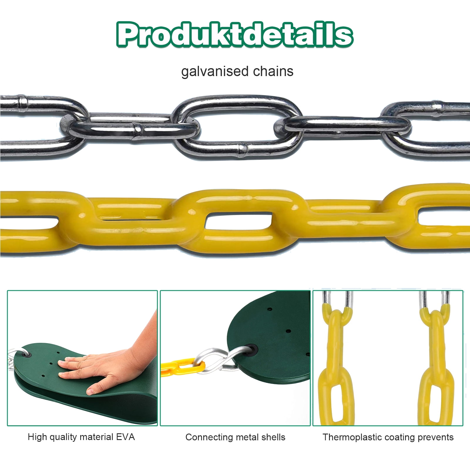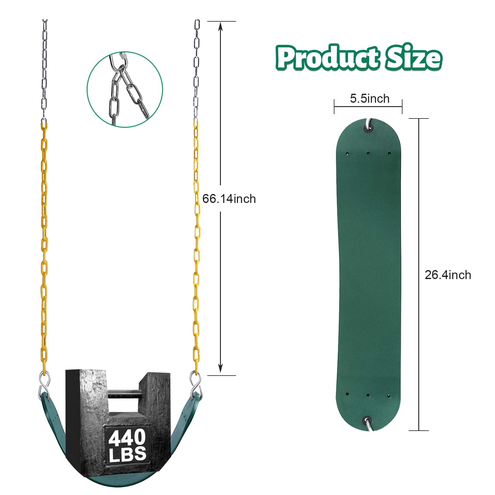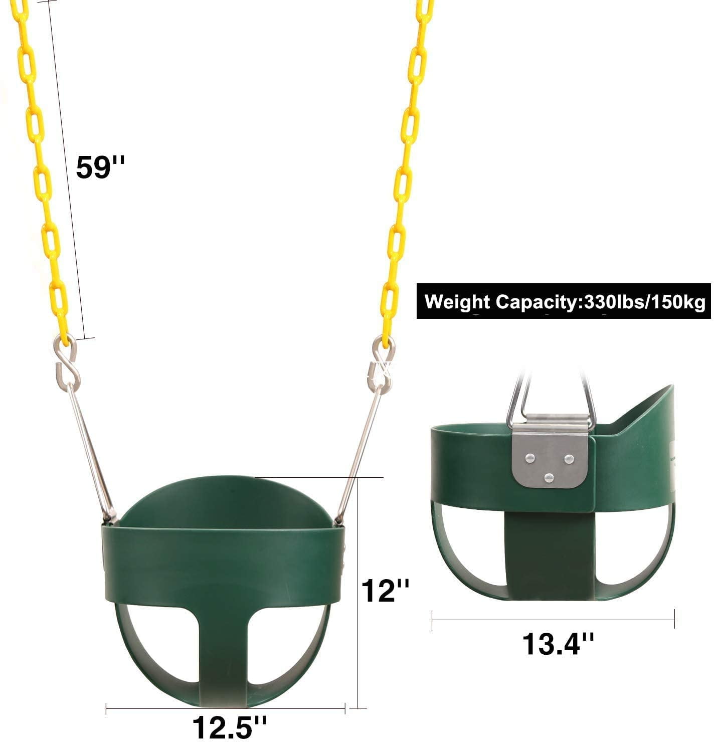 SAFE DESIGN,The bucket swing is made of durable and high quality materials with a highly durable plastic seat. Also features zinc-plated hardware for years of use.Aditional safety is provided by our safety belt and the anti tip design. This keeps your child safely on the seat and prevents them from falling off. In addition, the correct position of the swing is maintained and prevents the swing from twisting or tipping over,Long lasting construction,This swing is made of the high quality soft and durable EVA material, it has strong compression and tear resistance, it guarantees your safety when swinging. EASY TO INSTALL,Our toddler swings come fully assembled and easy to install. The seat size( Front to Back) is 10 inch,Elastic Swing Size, Base part 26.4 * 5.5 inch, Swing rope length 66.14 inch, The length of the rope can be adjusted according to actual use. WEIGHT CAPACITY, the bucket swing is made of high quality, durable plastic and is for residential use only, built to hold up to 330 LBS., for Kids 8 month to 4 year age.Weight Limit, The swing seat is a thickened rotating plate,Load capacity up to 660lbs, Stable center of gravity and uniform force, This swing is not only suitable for children but also for adults. the bucket swing,HEIGHT AND WEIGHT,12.2(L)*14.2(W)*11.4(H) ,weight, 4.6lbs Elastic Swing Size, Base part 26.4 * 5.5 inch, Swing rope length 66.14 inch, The length of the rope can be adjusted according to actual use.weight 4,85lbs,total 9.5lbs The Package, High back full bucket swing seats with 66″ long chains 30″ yellow plastisol coating design to avoid pinched fingers, and includes one swing and 2 hooks and 2 galvanized chains for swing seat Over 3 Years Old(Children should be used under parental supervision)