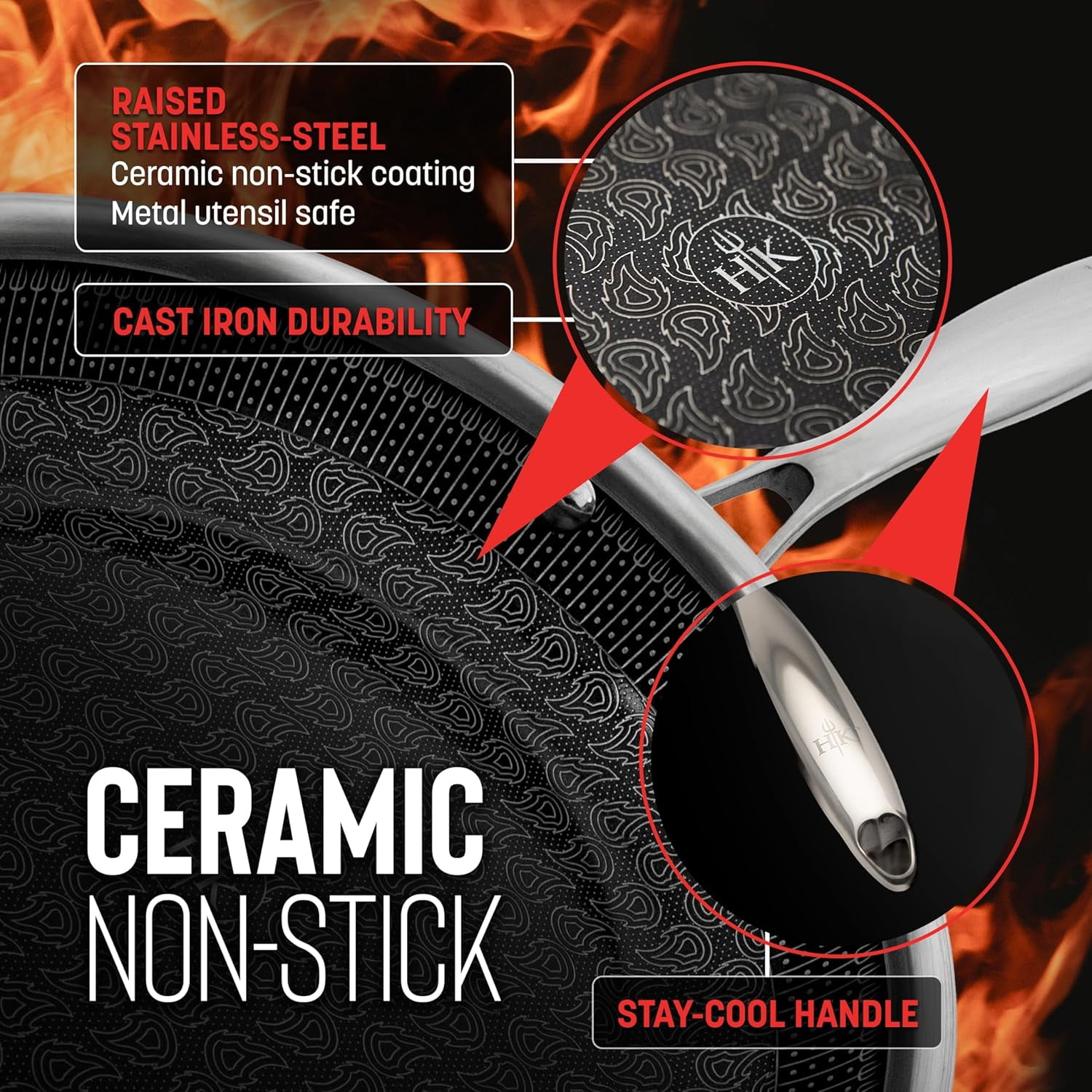 Hell’s Kitchen Tri-clad Hybrid cookware heats up fast and evenly like aluminum, holds heat and sears like stainless, won’t stick to even the most delicate foods because it’s nonstick, takes a beating from tools, the oven, and rough handling like cast iron, and cleans up easily when you’re done.—guaranteed. Hell’s Kitchen Hybrid Tri-Clad cookware features stainless steel construction with a conductive aluminum core, and a laser-etched flame pattern above a durable ceramic nonstick surface for quick and even heating and simple cleanup. Diamond reinforced ceramic nonstick coating below laser-etched stainless, safe for metal-utensils and durable for the toughest foods. Hell’s Kitchen Hybrid pans work with induction, gas, electric, ceramic, and halogen cooktops; or in the oven up to 500⸰ Fahrenheit. Most food will wipe away easily with warm soapy water and sponge. Pans are also dishwasher safe or use scouring pads for deep cleaning if necessary. Set includes 11″” Fry Pan, 4 quart saute pan, 7.5 Quart pot, and 2 interchangeable lids