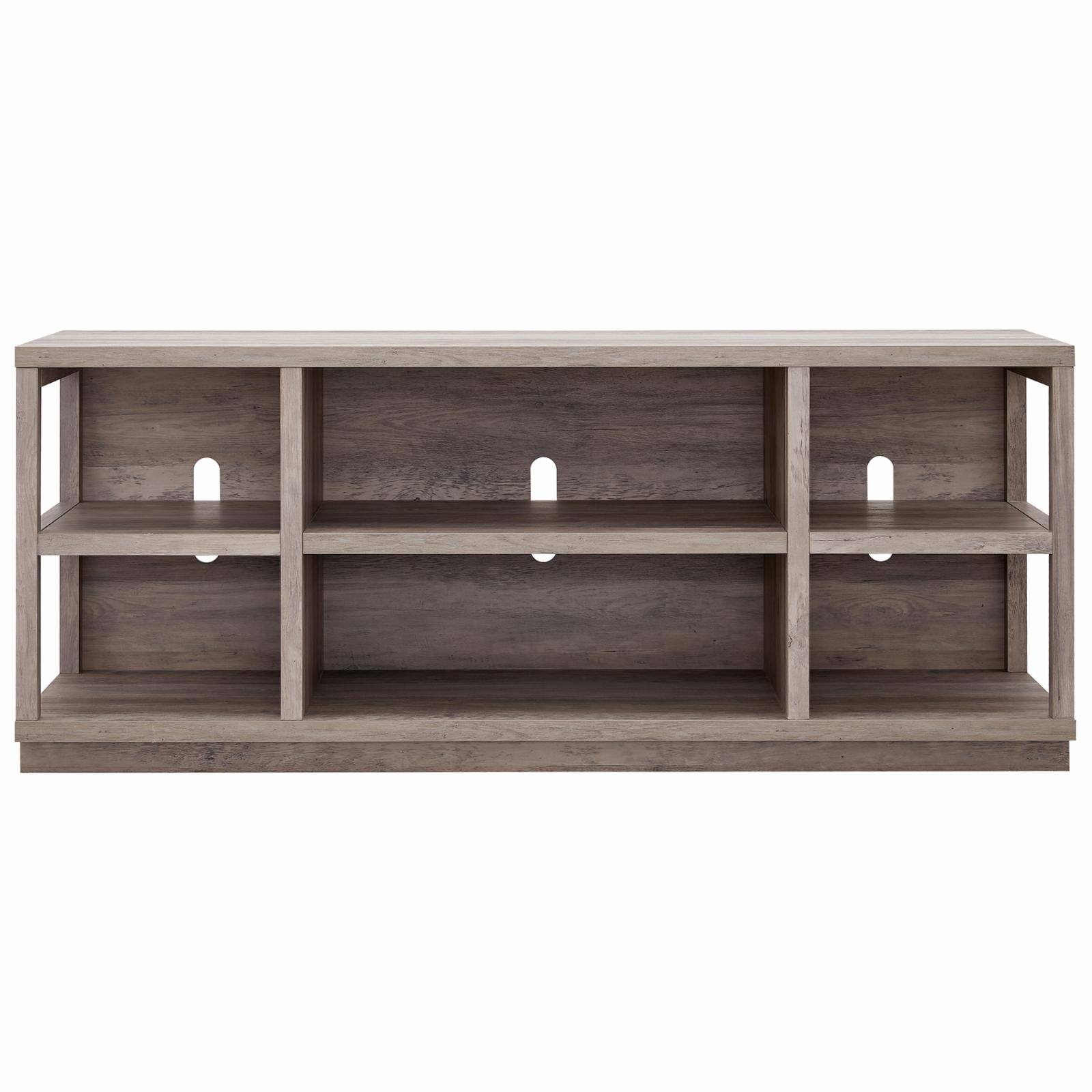 A mid-century modern design accommodates TVs up to 65″ for your entertaining space. Constructed of sturdy MDF materials in a handcrafted Gray Oak finish. Features 6 shelves for ample storage. The top has a weight capacity of 75lbs. Lower shelves can hold 25lbs. each. Clean with a soft, dry cloth; no harsh chemicals or abrasive cleaning materials. Features easy assembly.