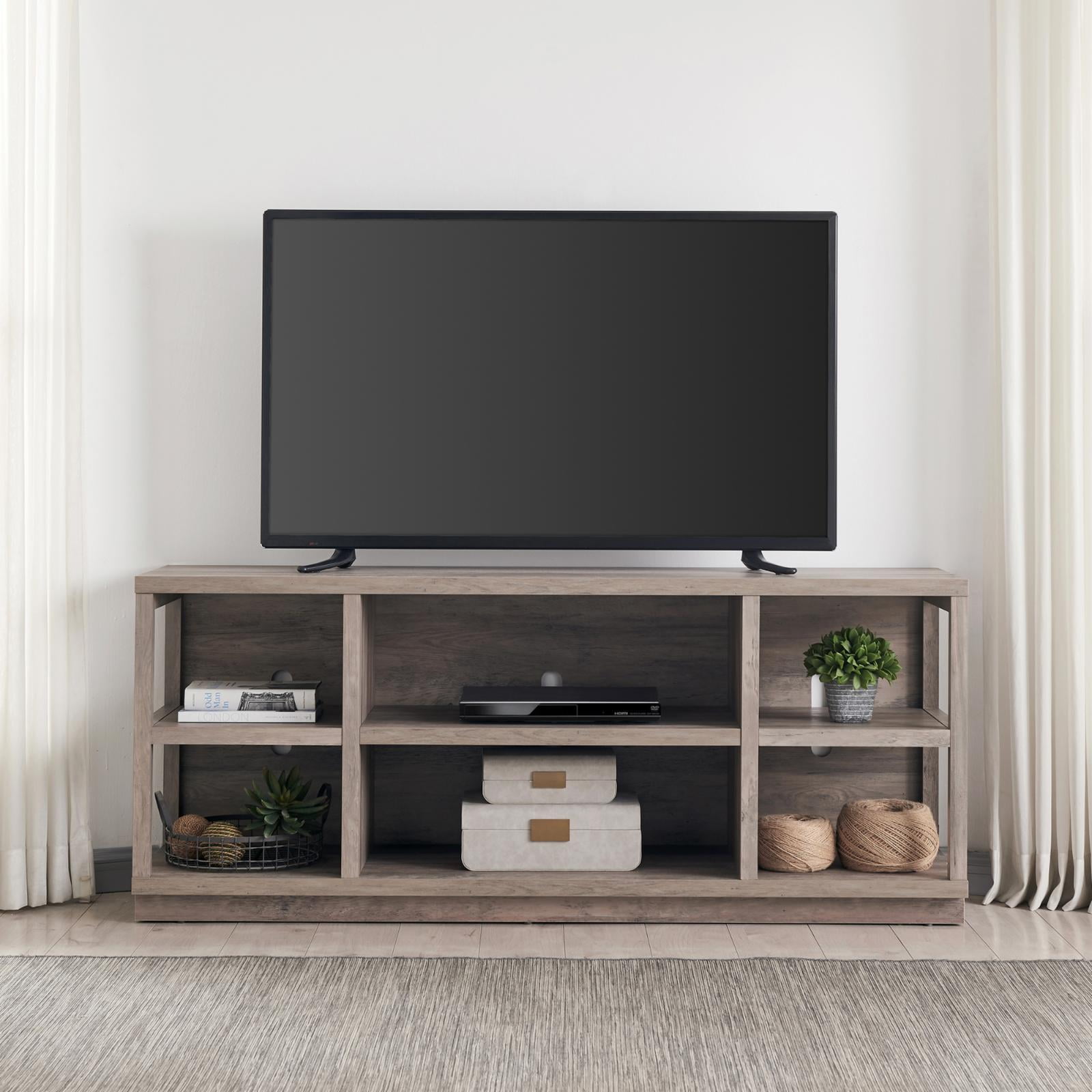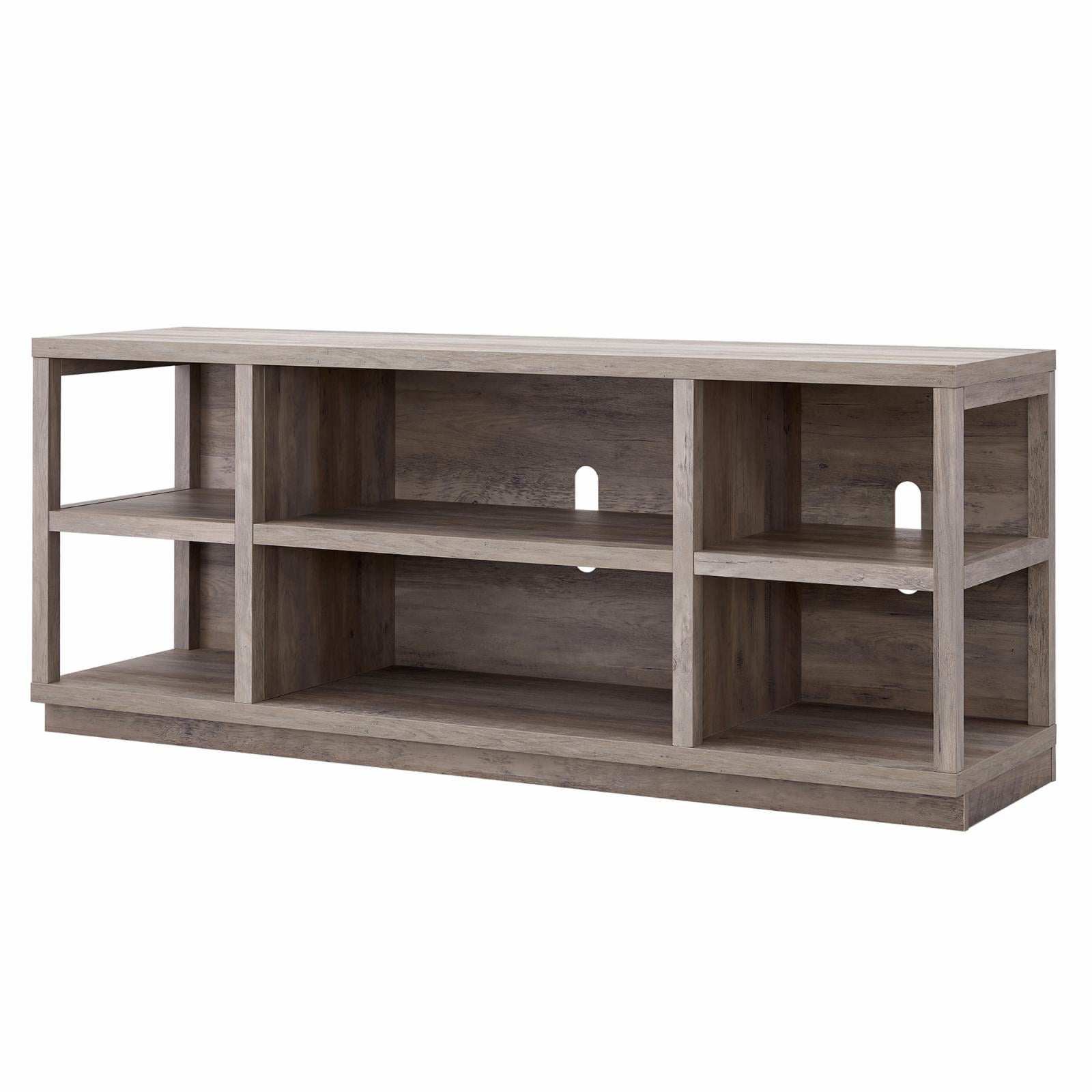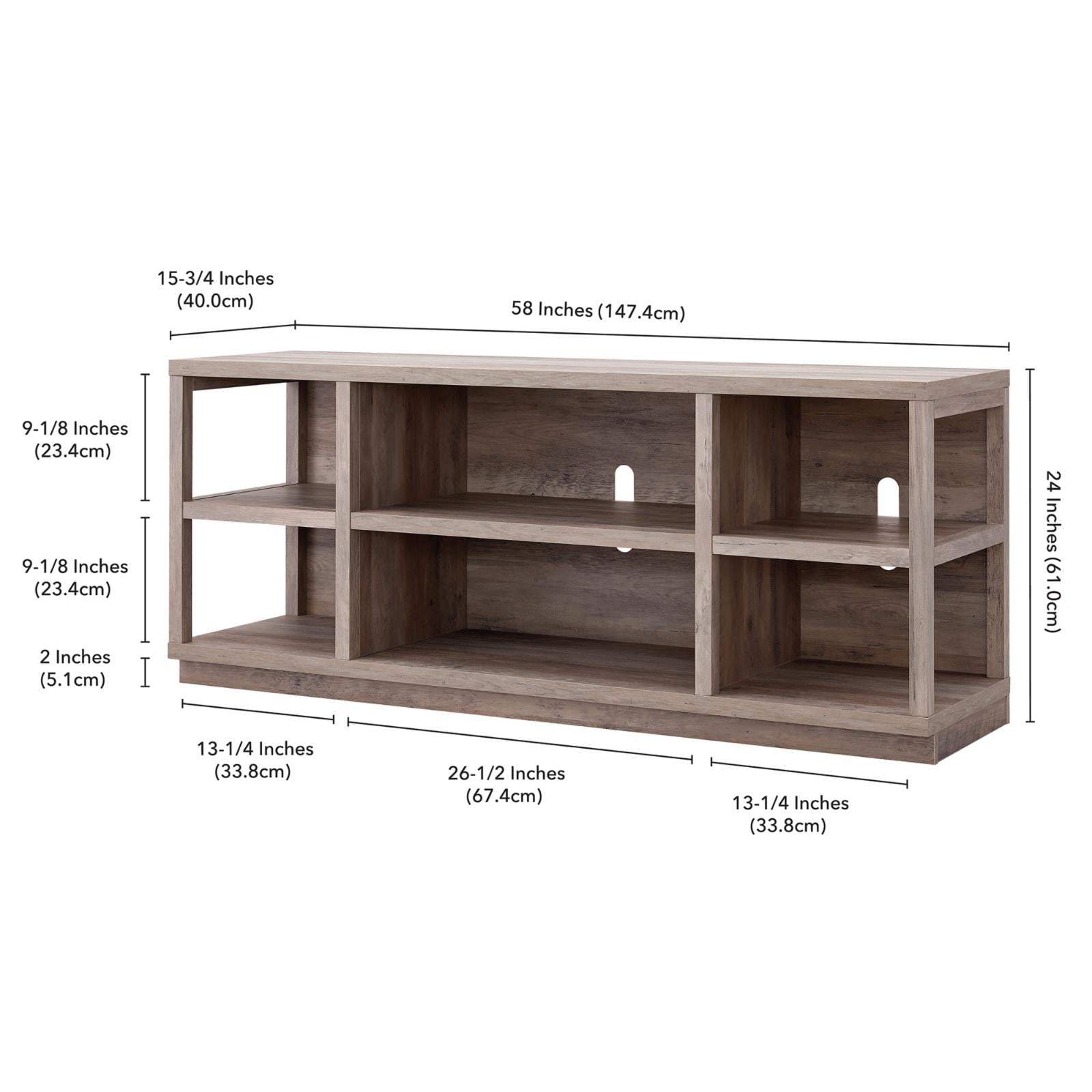 Striking in its simplicity, this Scandinavian-inspired TV stand emphasizes clean lines and straightforward design, from the planked-style wood to its streamlined silhouette. This two-shelf entertainment solution features six separate storage compartments, while the open-framed sides create an airy and open feel. Cable management cut-outs in the finished back panel keep your cable and cord situation in check. Features: A mid-century modern design accommodates TVs up to 65″ for your entertaining space. Constructed of sturdy MDF materials in a handcrafted Gray Oak finish. Features 6 shelves for ample storage. The top has a weight capacity of 75lbs. Lower shelves can hold 25lbs. each. Clean with a soft, dry cloth; no harsh chemicals or abrasive cleaning materials. Features easy assembly. Specifications: Product Dimensions: 15.75″ x 58″ x 24″ Target Audience: Adult (18 Years and Up) Assembly details: Adult Assembly Required, Tools Not Provided Product Weight: 64 lbs
