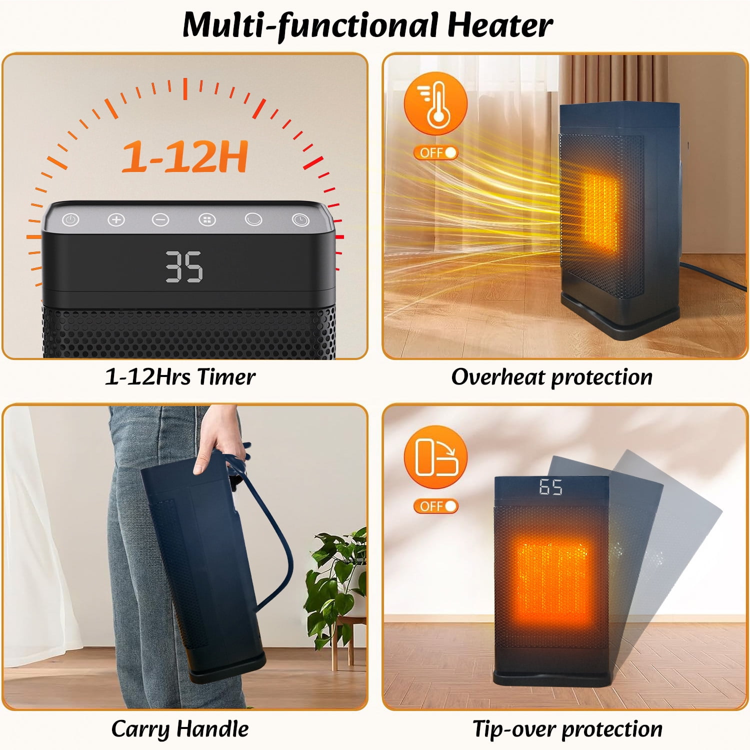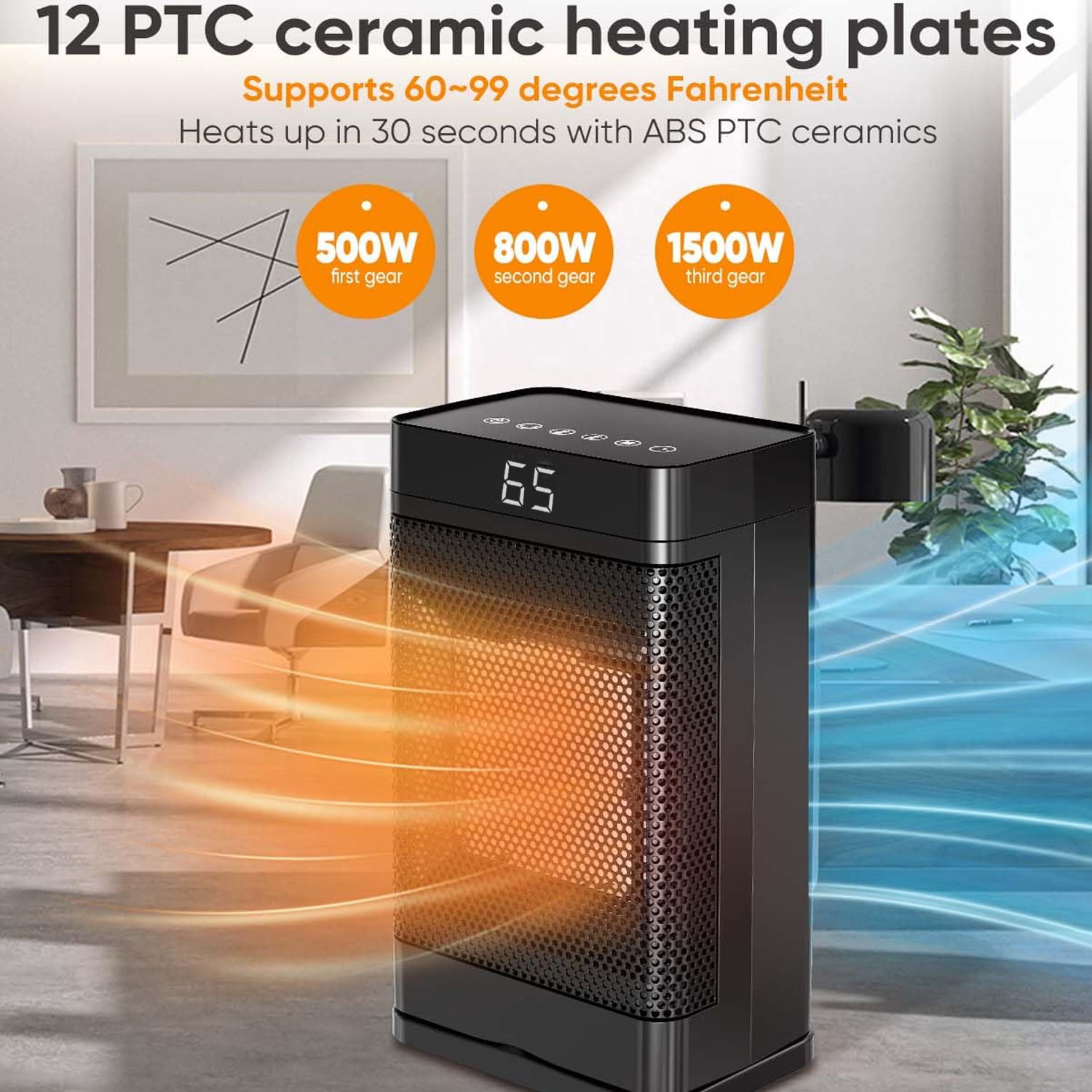 Henotian Space Heater, the electric heater heats up more efficiently with up to 1500W working power and can heat up to 200 square feet. ??Main Feature: ⚡【High-efficiency and energy-saving design】 Our 1500W PTC electric heater uses advanced thermosensitive ceramic technology to generate heat quickly and distribute it evenly while maintaining energy efficiency. While providing stable heat output, the PTC heating element can also automatically adjust the power after reaching the set temperature, ensuring efficient use of energy and reducing electricity bills. ⚡【Portable operation and remote control】 This portable electric heater comes with a convenient remote control that allows users to easily adjust the temperature, switch the device on or off, or set the timer from any corner of the room. Whether relaxing on the sofa or resting in bed, you can enjoy a comfortable control experience without getting up. ⚡【All-round heating】 The 60& automatic oscillation function ensures that the heater can cover a wider area and provide all-round warmth. Whether in the living room, bedroom or office, this electric heater can create a warm and comfortable environment for you. ⚡【Multi-speed adjustment and timing function】 According to personal needs, you can choose from 3 different speed settings to get the ideal heating effect. In addition, the 1-12 hour timer function allows you to preset the off time, ensuring safety and energy saving whether you are sleeping at night or away for a long time. ⚡【Quiet Operation and Constant Temperature Control】 Designed with the user’s comfort experience in mind, this electric heater is almost silent when in operation and will not disturb your work or rest. The built-in thermostat can automatically adjust the temperature to avoid overheating while maintaining a stable indoor temperature, providing you with a comfortable indoor climate.