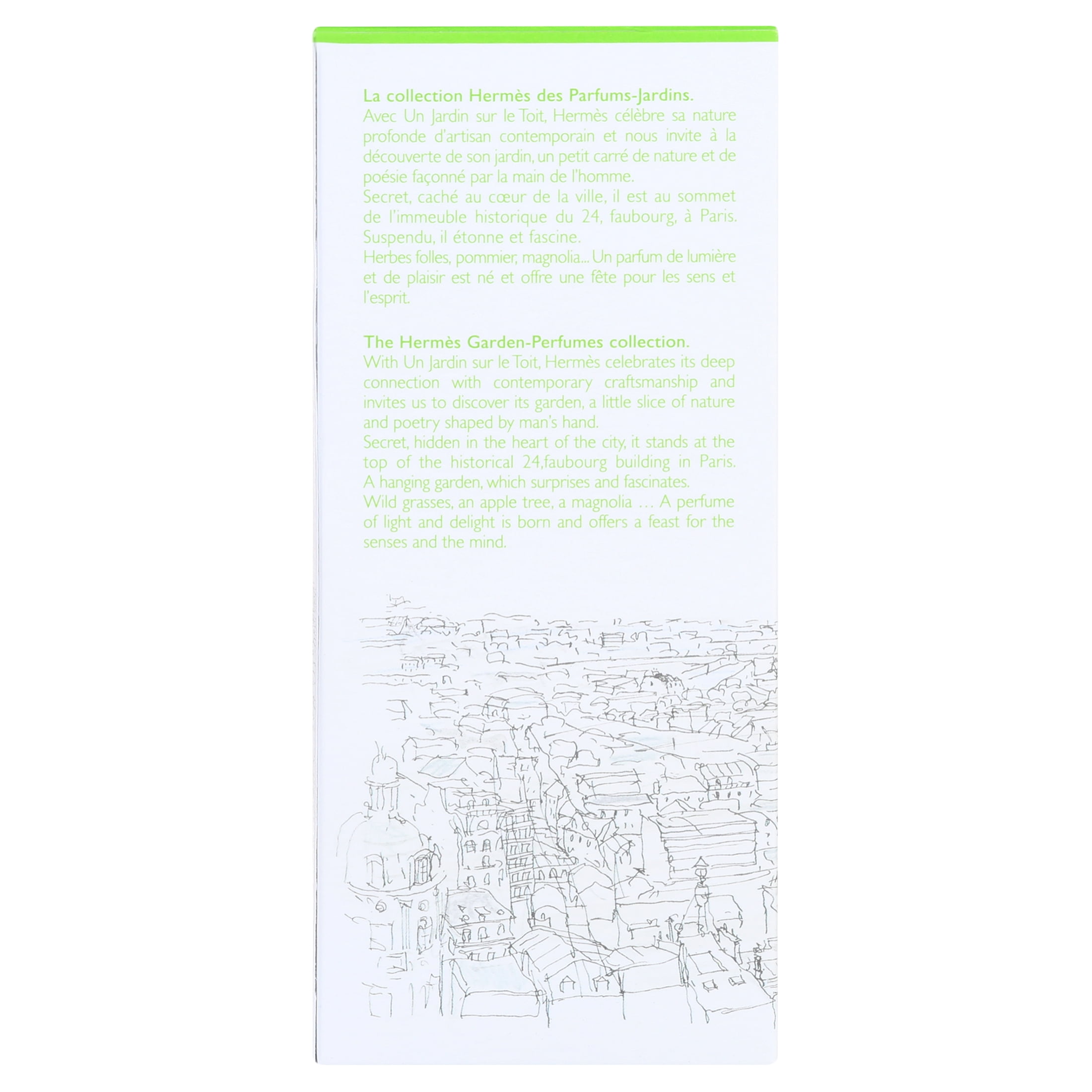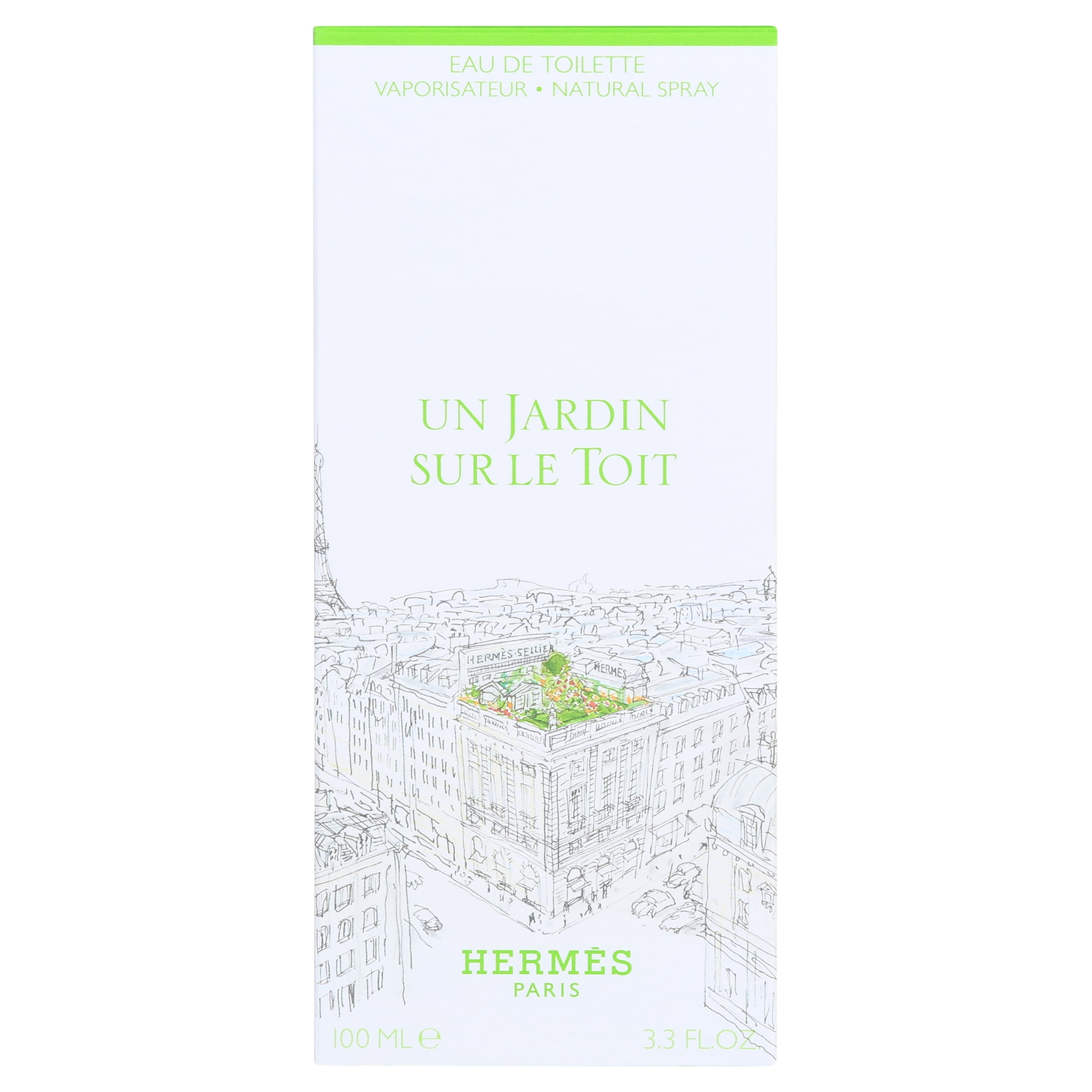 Hermes Un Jardin Sur Le Toit Eau de Toilette Perfume for Women, 3.3 Oz Full Size. The un jardin sur le toit is a unique garden-inspired fragrance for women from the renowned house of hermes and was launched in 2011. Literally translated to ôa garden on a roofö, the fragrance stays true to its name and offers a unique combination of fresh and sweet-smelling flavors. Available as eau de toilette, the perfume opens with a pleasant green grass note followed by juicy apple, pear and rose. The end notes are a clear scent of magnolia, basil and compost that linger on and let you experience the subtle seasonal transitions occurring in a garden. Perfect for any occasion, the un jardin sur le toit uplifts your spirits and transports you into natureÆs fragrant lap.