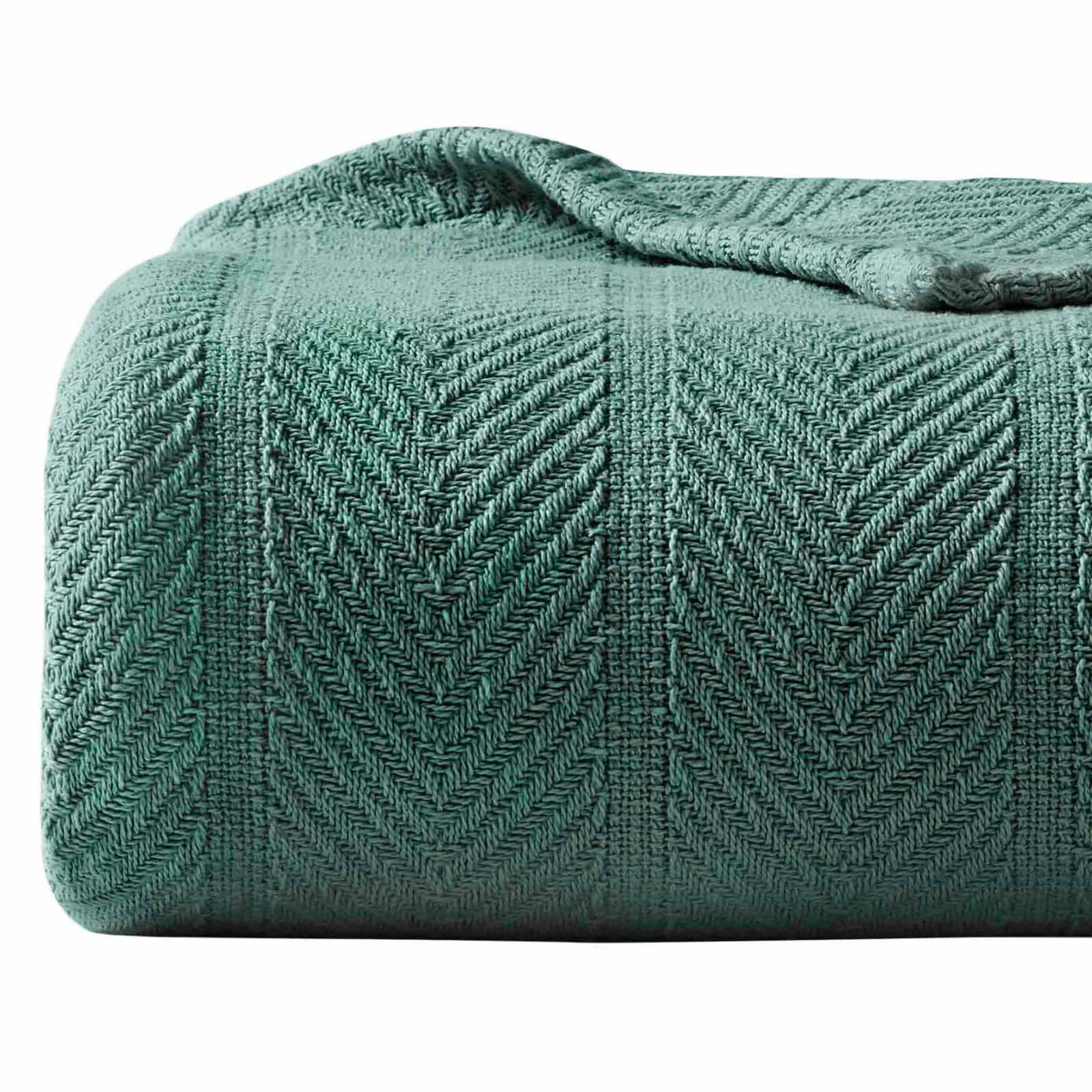 Choose from available sizes 100% knit cotton construction Herringbone design in green Medium weight blanket Machine washable