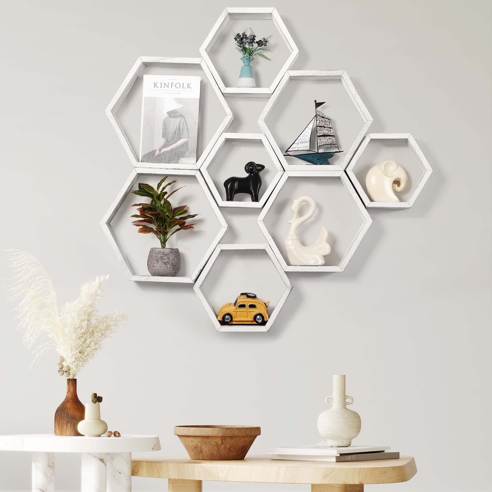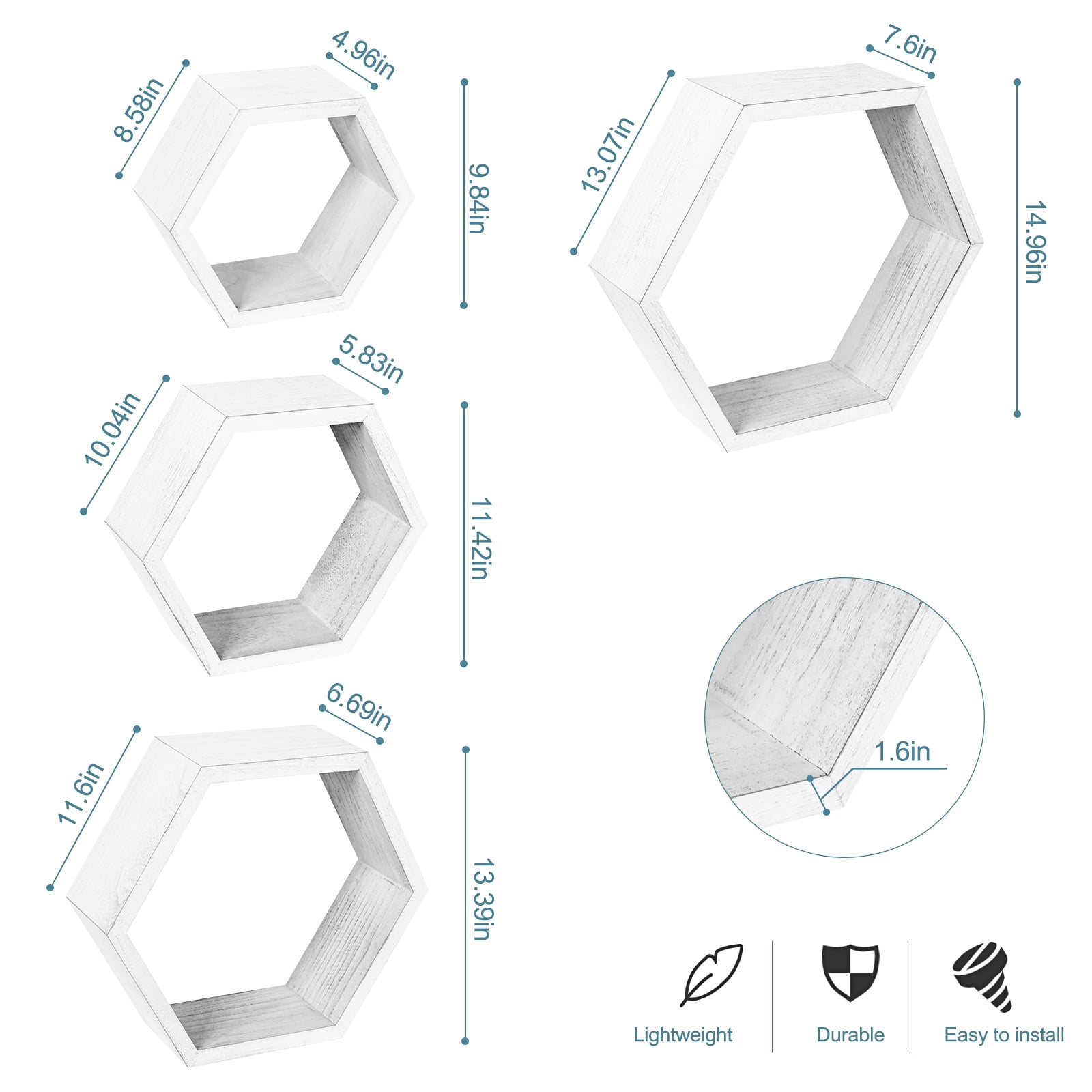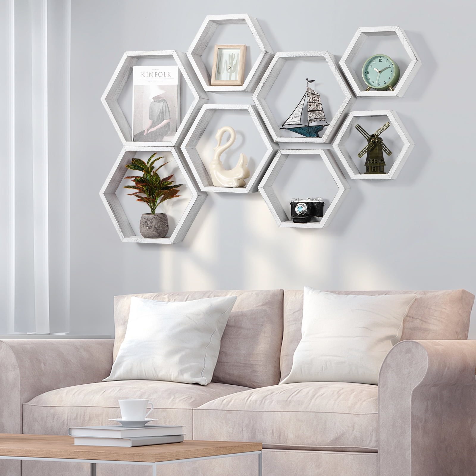 [Floating Shelves] Our set of 8 floating shelves are perfect for bedrooms, offices, hallways, living rooms and even nurseries, adding interest to drab walls and being the ideal choice for gift-giving. [Modern & Rustic Design] The wooden nature of the floating shelves adds a farmhouse style to the home decoration. The simple design is suitable for most home decorations. You can place figures, picture frames, handwork and other items on the shelf while showing your collection to friends. [Size] The set of 8 honeycomb wall-mounted storage shelves are in different sizes: Minimum size: 9.84 x 8.58 x 4.96 inches, small: 11.42 x 10.04 x 5.83 inches, Medium: 13.39 x 11.6 x 6.69 inches, Large: 14.96 x 13.07 x 7.6 inches to suit your different needs, 8 shelves are enough to decorate your wall, but can also be used alone. [Easy to Install] Our honeycomb shelves have detailed illustrations and step-by-step instructions. You will understand all the installation details, decide which wall to decorate, and start installing!