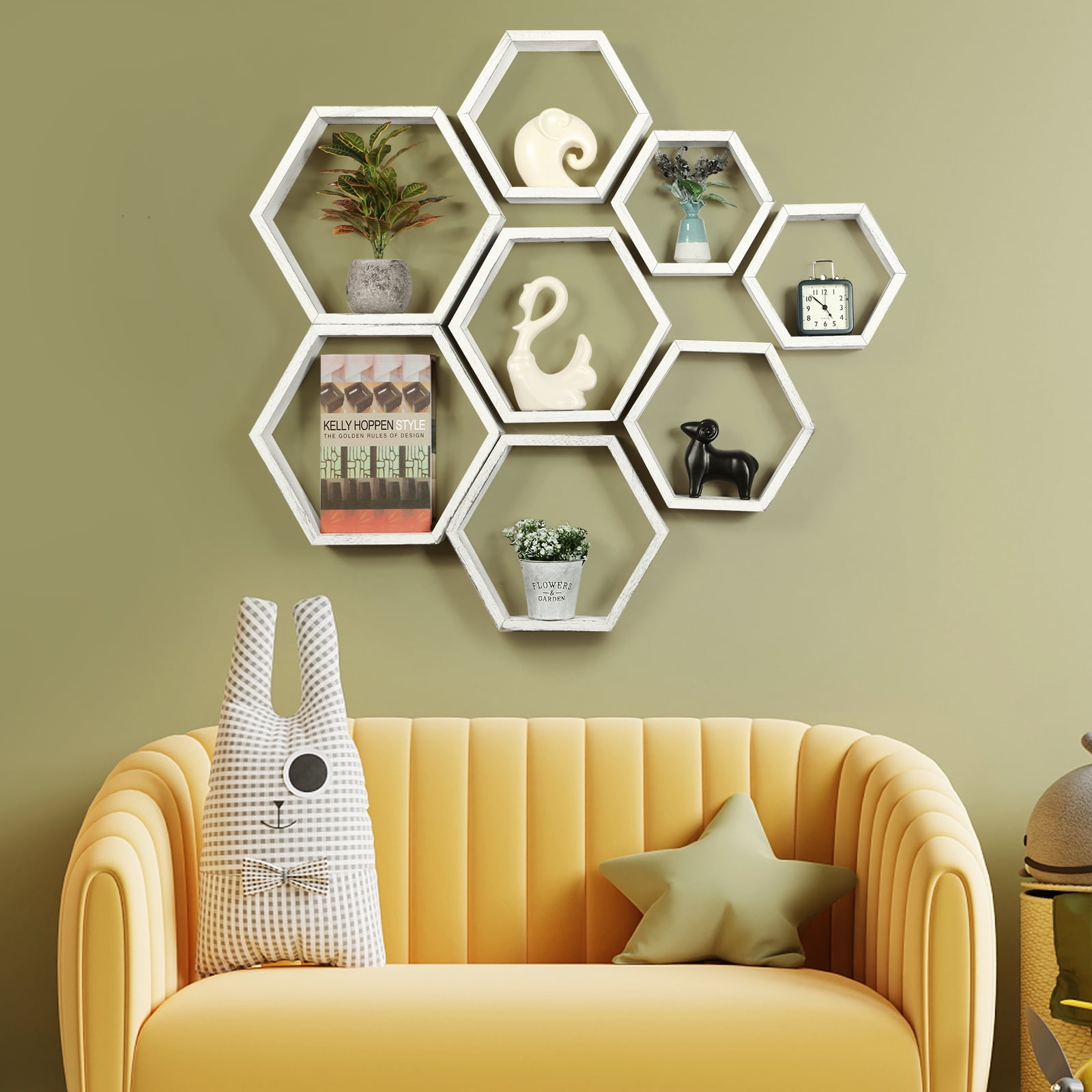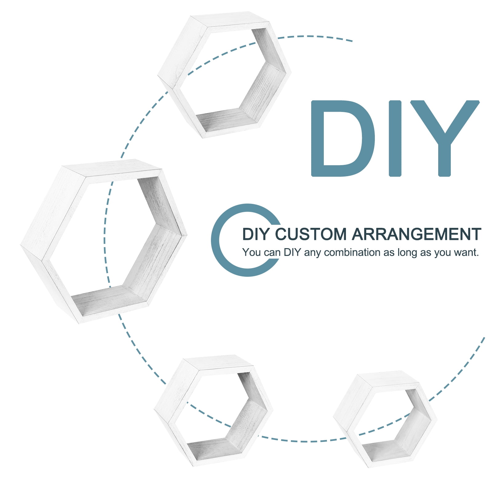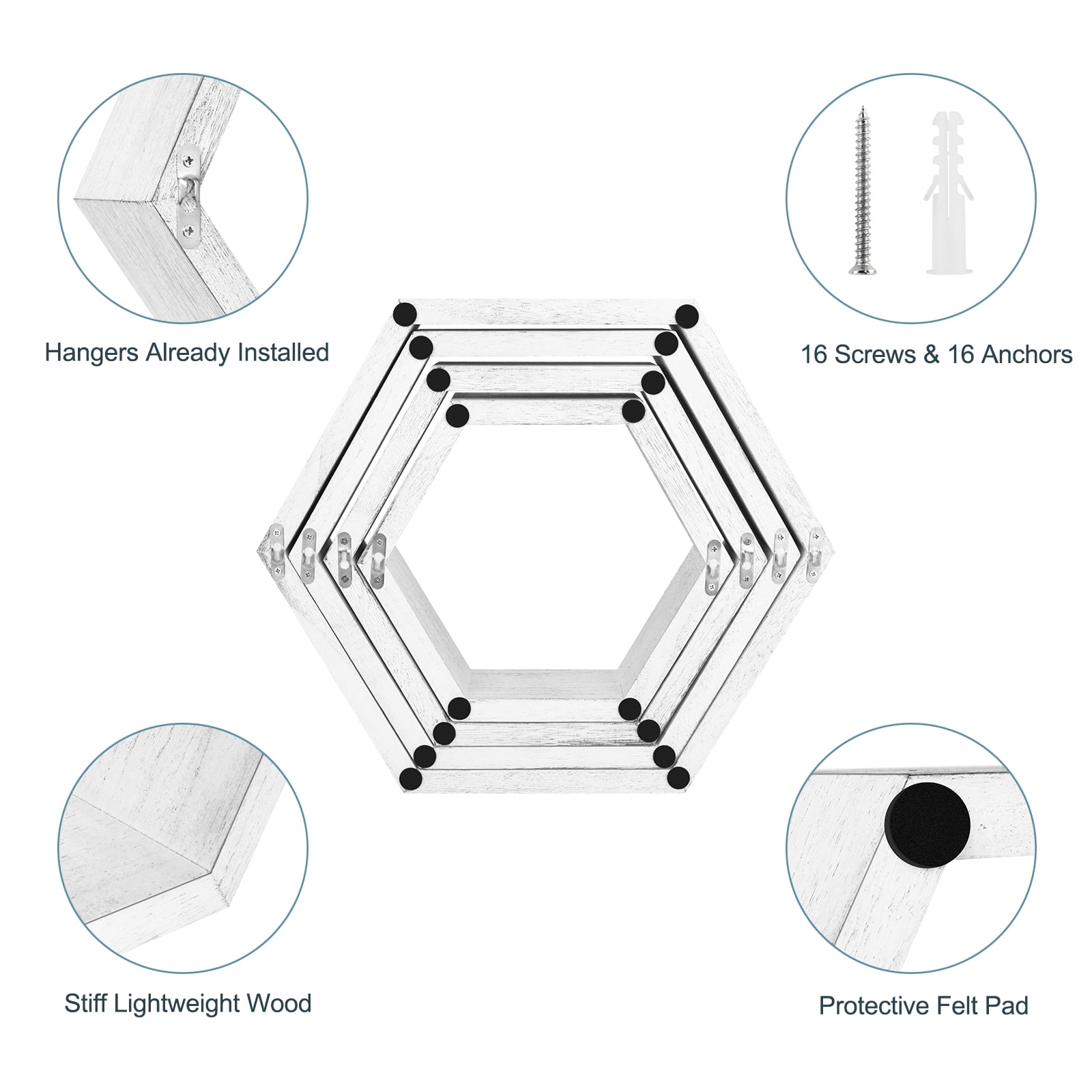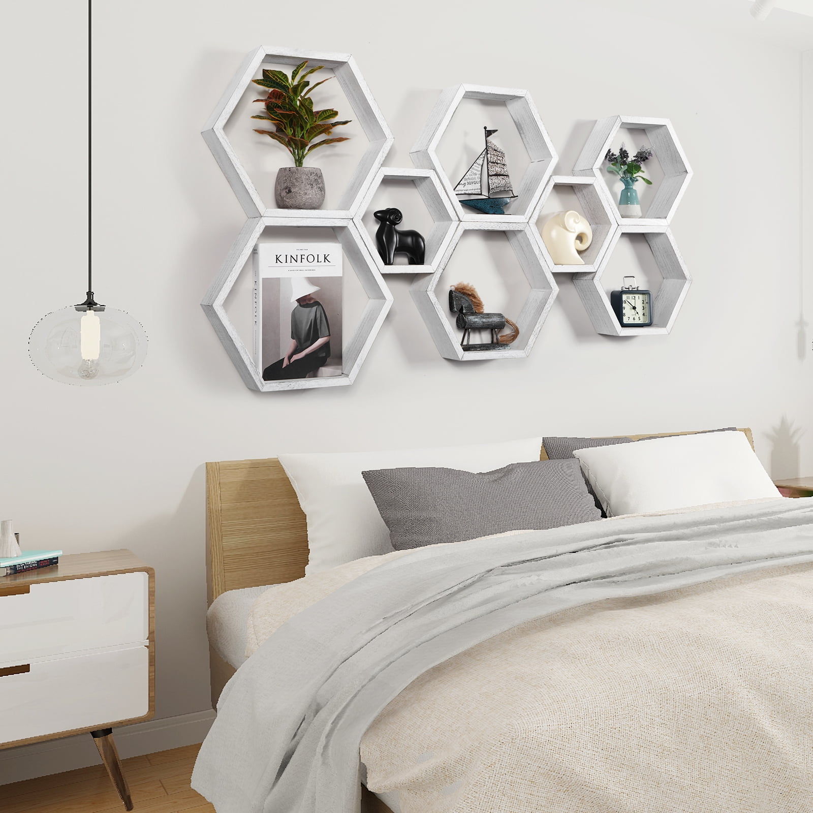 [Floating Shelves] Our set of 8 floating shelves are perfect for bedrooms, offices, hallways, living rooms and even nurseries, adding interest to drab walls and being the ideal choice for gift-giving. [Modern & Rustic Design] The wooden nature of the floating shelves adds a farmhouse style to the home decoration. The simple design is suitable for most home decorations. You can place figures, picture frames, handwork and other items on the shelf while showing your collection to friends. [Size] The set of 8 honeycomb wall-mounted storage shelves are in different sizes: Minimum size: 9.84 x 8.58 x 4.96 inches, small: 11.42 x 10.04 x 5.83 inches, Medium: 13.39 x 11.6 x 6.69 inches, Large: 14.96 x 13.07 x 7.6 inches to suit your different needs, 8 shelves are enough to decorate your wall, but can also be used alone. [Easy to Install] Our honeycomb shelves have detailed illustrations and step-by-step instructions. You will understand all the installation details, decide which wall to decorate, and start installing!