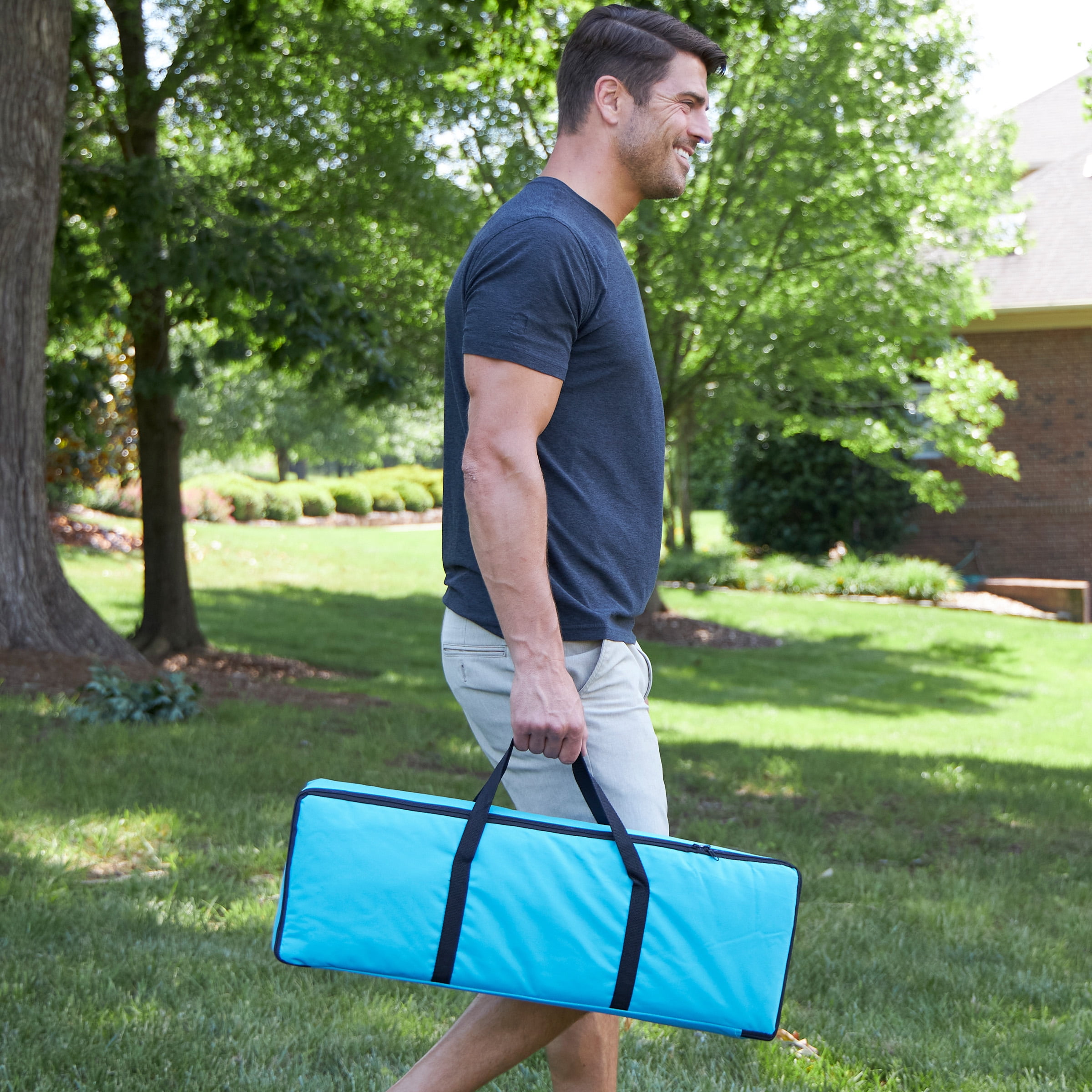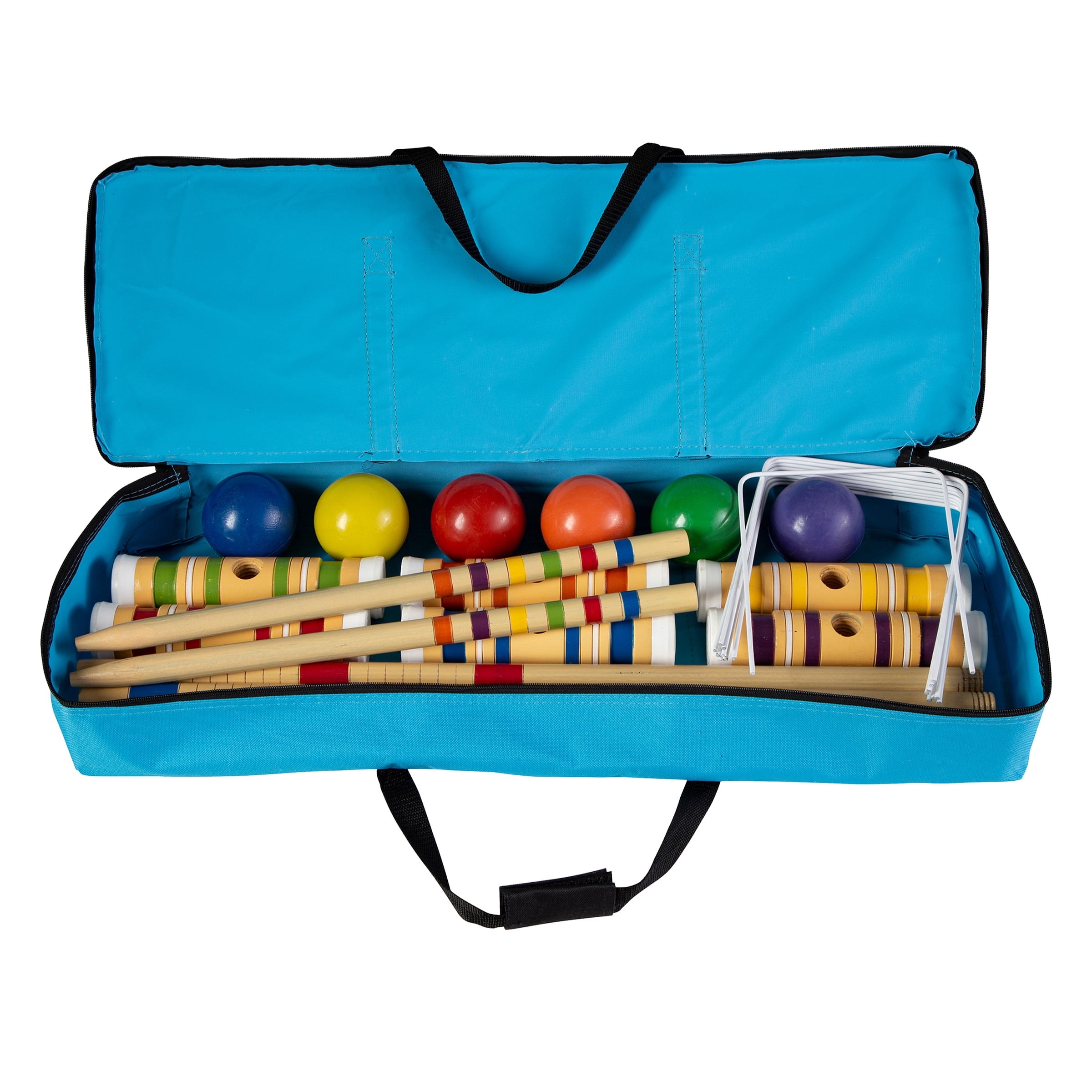 WOOD CROQUET SET – This croquet game comes with 6 mallets, balls, wickets, and post so you can play with up to 6 people at a time. EASY TO PLAY – This game can be set up on almost any flat lawn and is easy to learn — simply set up the wire hoops in the ground, assign colors to players, and try to hit your ball through each hoop. CONVENIENT TRANSPORT – The included nylon travel bag features a zippered closing and two handles with a hook and loop fastener closure for extra carrying comfort. DURABLE BUILD – The backyard games are made of durable wood designed for frequent use and are finished with precision for the feel of vintage lawn games, with the durability of current gear. FUN FOR ALL AGES – Whether you’re playing traditional USCA Nine Wicket or more fast-paced Golf Croquet, this croquet game is perfect for all abilities and ages. MATERIALS – Wood and Metal.