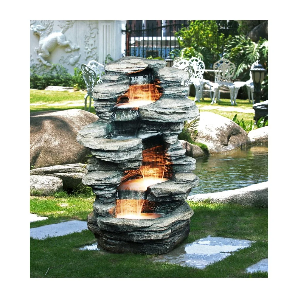 Rock 4 Level Fountain with Halogen Light Add a touch of nature with this multi-leveled water fountain. The rock design gives the impression of water flowing over short waterfalls. Material: Durable Polyresin Pump and lights included CSA/CUL approved adapter included Adjustable Flow Rate Design: Sculptural Indoor/Outdoor use – Choking Hazard: NO – Material: Material: Durable Polyresin – Item Depth: 21 – Item Height: 38.5 – Item Width: 21 – Item Weight: 52.8 – Indoor or Outdoor: Indoor/Outdoor use – Primary Color: BROWN – Secondary Color: GREY – Outdoor (Y/N): Yes – Item Material: Polyresin – Vendor Color: Grey