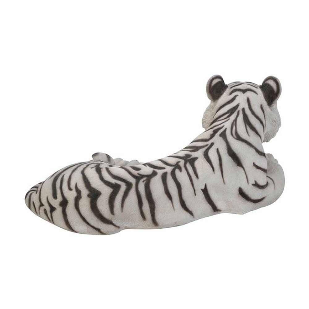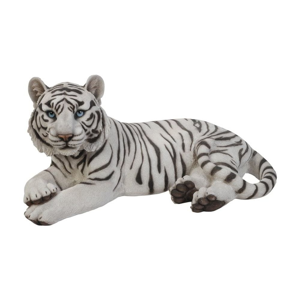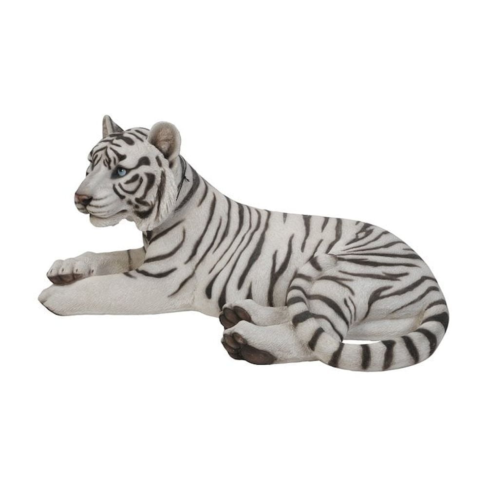 White Tiger Laying Down Statue Regal white tiger laying down in an outstretched position. Beautiful white coat with black stripes finished with meticulous detail creating a natural textured coat. Ice blue eyes gaze out giving the statue a lifelike look. This statue will astonish you with its strikingly life-like design. Material: Durable Polyresin Incredibly realistic Intricate details Great for home and garden decor Theme: Animals Indoor/Outdoor use – Choking Hazard: NO – Material: Material: Durable Polyresin – Item Depth: 28 – Item Height: 13 – Item Width: 16.5 – Item Weight: 13.33 – Indoor or Outdoor: Indoor/Outdoor use – Primary Color: Whitew/BlackStripes – Secondary Color: BLACK – Outdoor (Y/N): Yes – Item Material: Polyresin – Vendor Color: White
