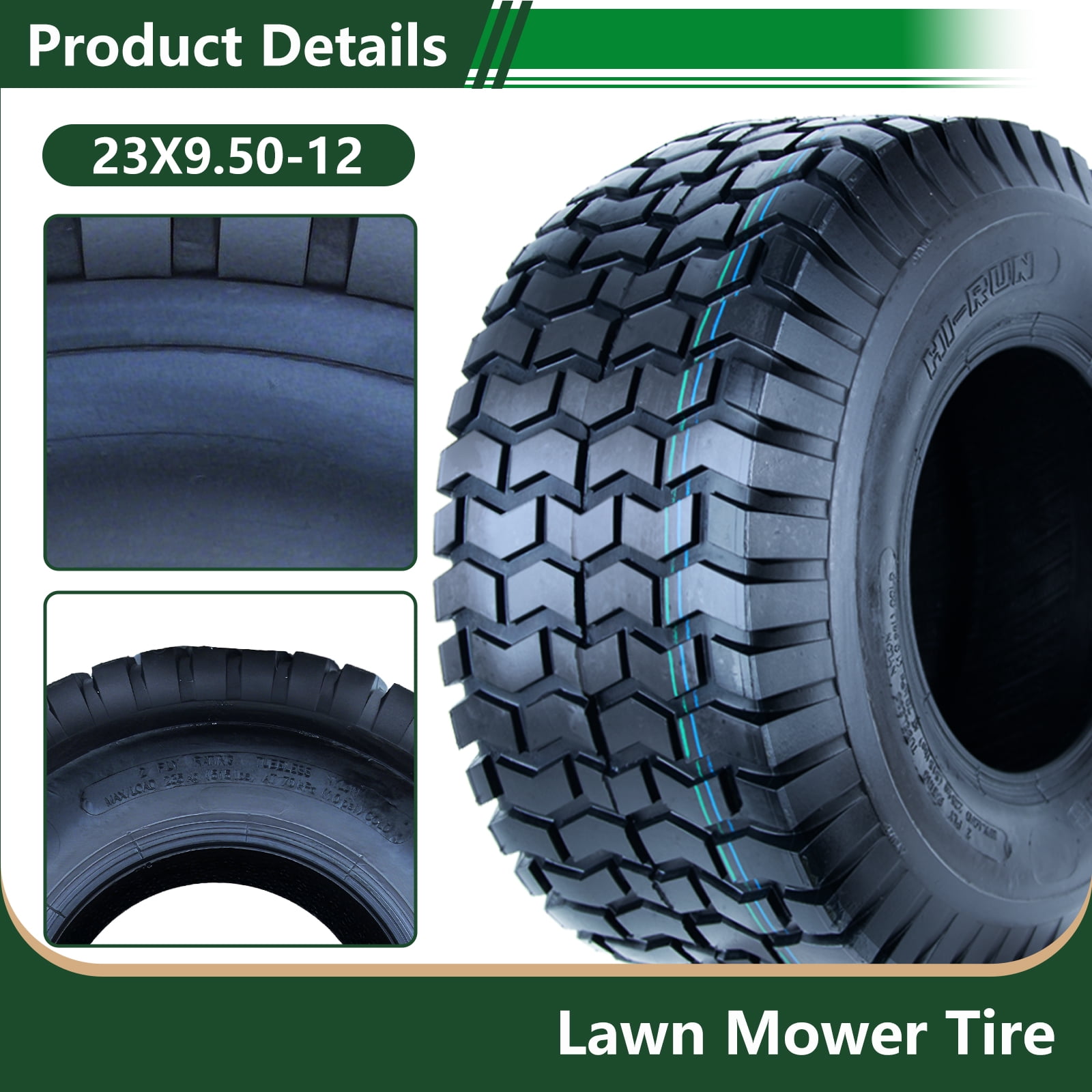 Hi-Run 23X9.50-12 Lawn Mower & Garden Tractor Tire All-Season Capability: This tire is suitable for all-season use, making it versatile for various weather conditions and seasonal changes Application: It is designed specifically for lawn mowers and garden tractors, ensuring compatibility and performance for these types of equipment Load Range and Ply: The tire features a 4-ply load range, indicating robust construction for handling heavy loads and providing durability Design Features: It has a black sidewall for a clean, classic look, and its design may differ slightly from the product images shown Tire Rim Not Included: The tire is sold separately from the rim, so you will need to purchase a compatible rim separately if you do not already have one