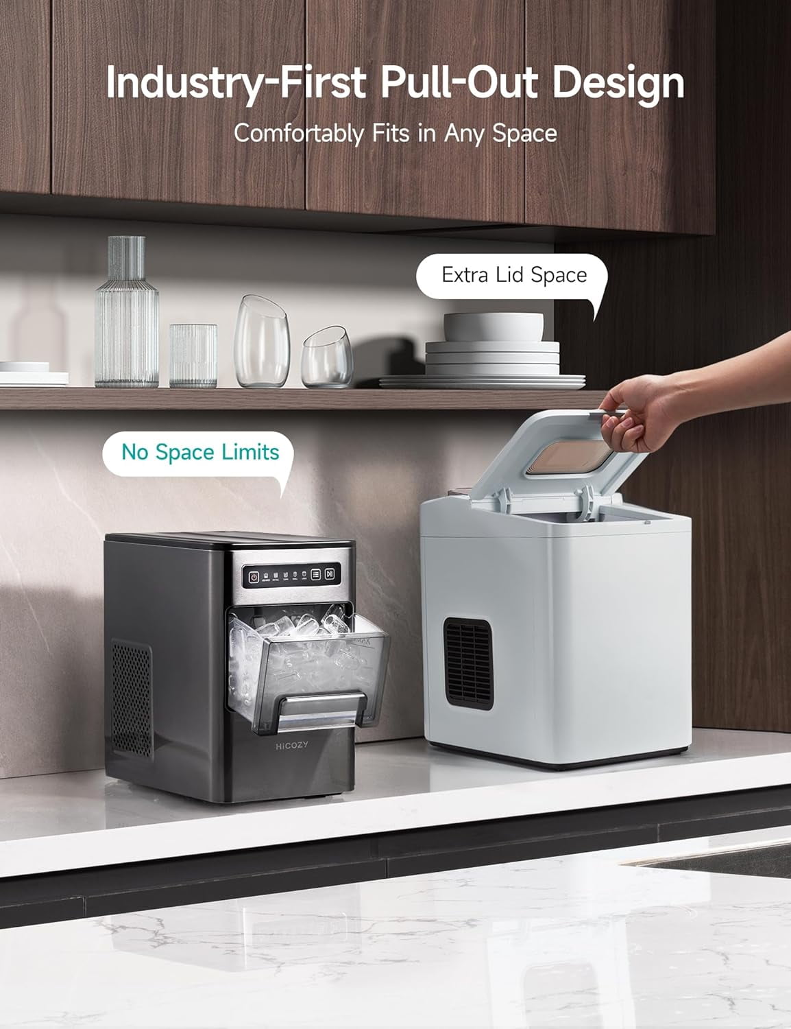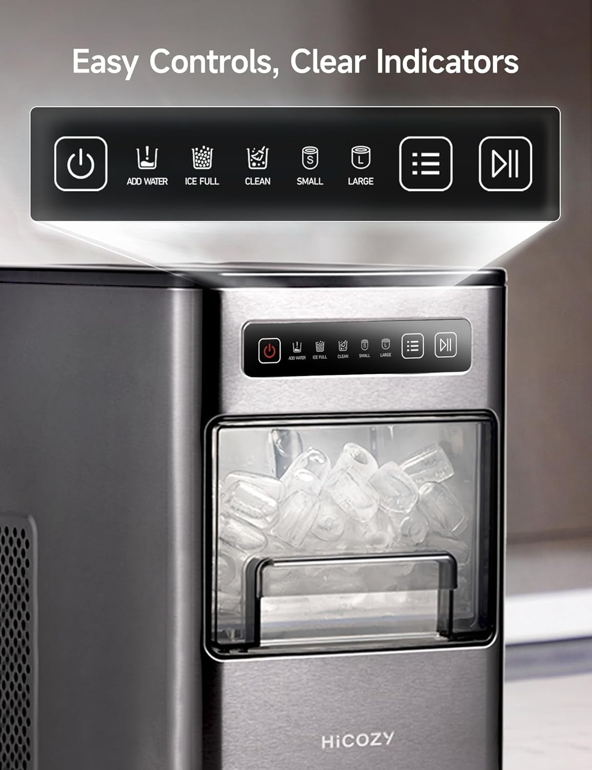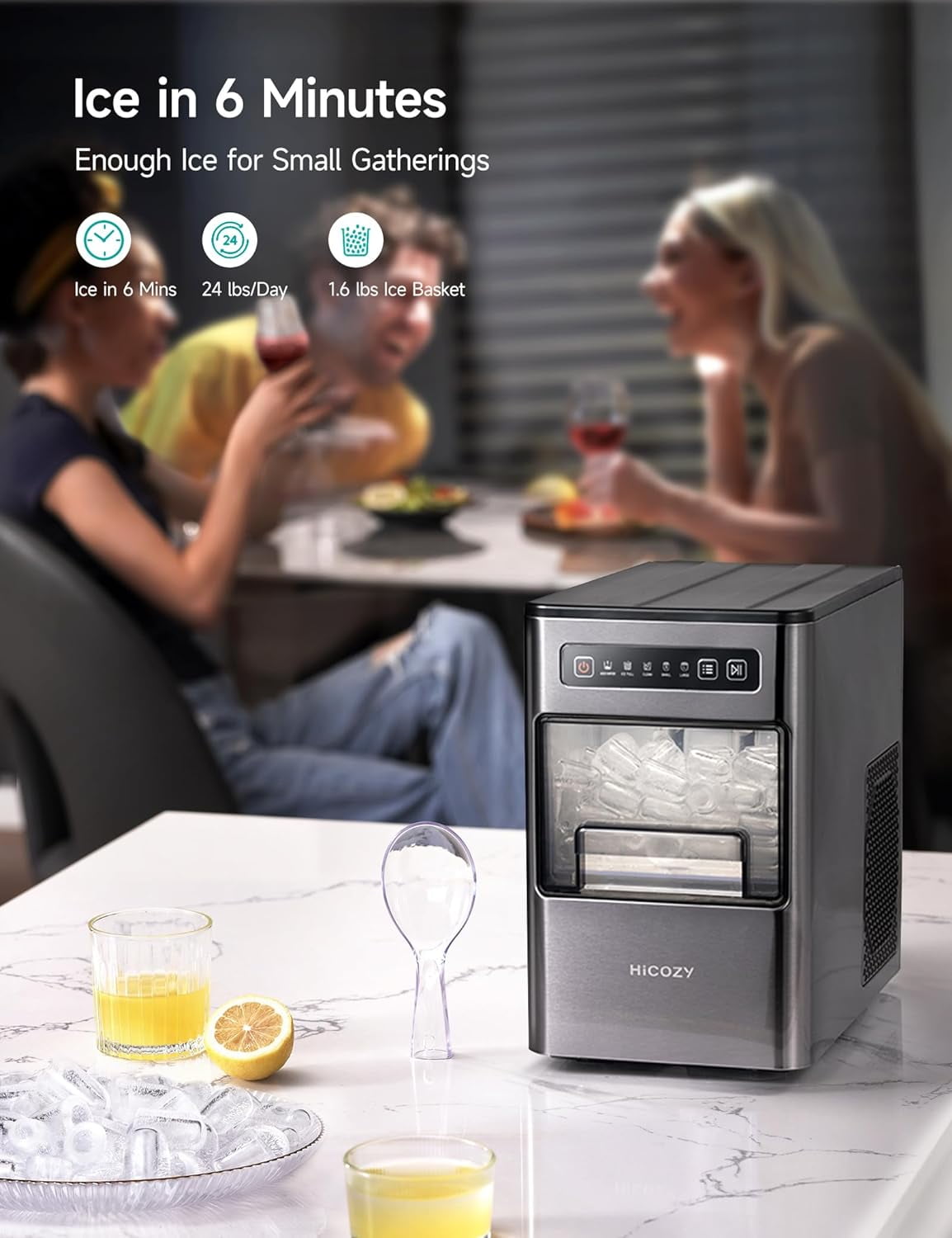 Ice in 6 Minutes & 2 Ice Sizes: HiCOZY?s highly-efficient condensing system starts producing ice in just 6 minutes and can make up to 24 lbs of ice per day. It can make ice in 2 sizes: large ice that melts slowly for a longer-lasting chill, and small ice that rapidly cools drinks for a quick refresh. Easy Controls, Clear Indicators: The intuitive control panel and clear indicators allow for effortless operation; power the machine on/off, start/pause ice making, switch the ambient light on/off, choose ice size, and activate the self-cleaning function with the press of a button. Space-Saving Design: Unlike other ice makers that need extra space for their basket lids, the HiCOZY Bullet Ice Maker features the industry?s first pull-out basket. Our space-saving design allows this compact machine to comfortably fit anywhere, even under cabinets, enabling convenient ice indulgence anytime, anywhere. One-Button Self-Cleaning: The machine cleans itself, so no more wasting time with annoying cleaning. Just press and hold the Start/Pause Button for 3 seconds to activate its self-cleaning function for a complete tube cleaning. A Stylish and Practical Gift: With uncompromising style and practical features, the HiCOZY Bullet Ice Maker is an excellent gift for people of all ages. Give the gift of chill this holiday season with confidence, knowing HiCOZY provides a one-year warranty and excellent customer service.