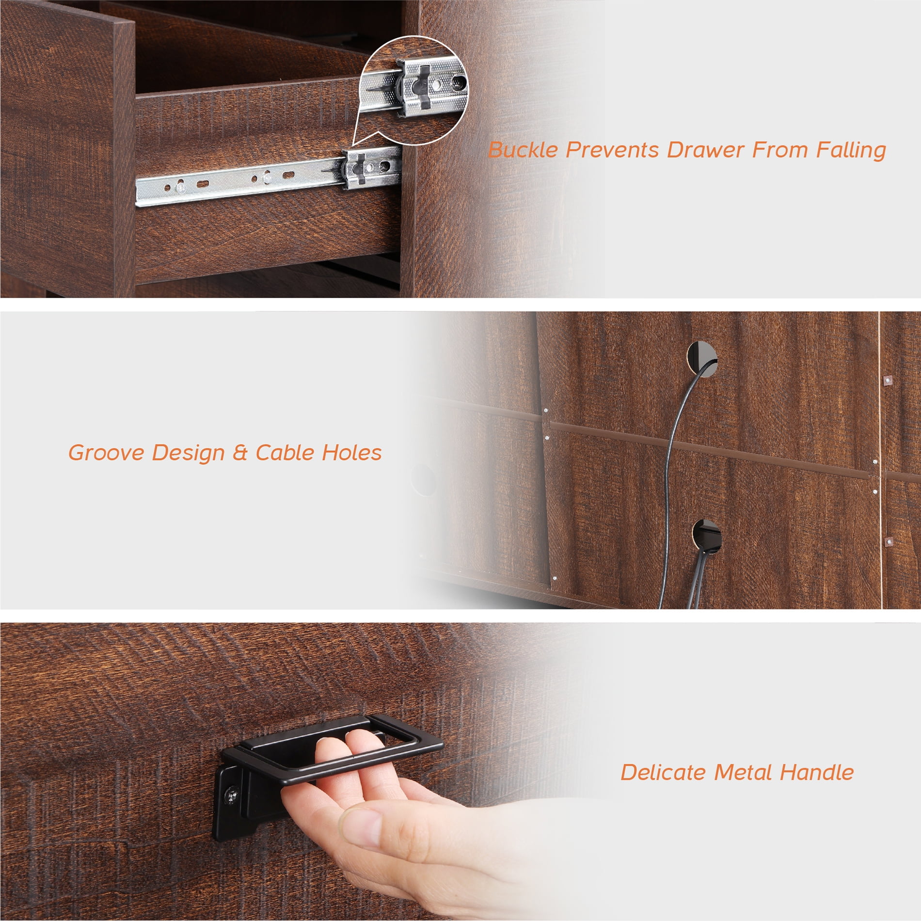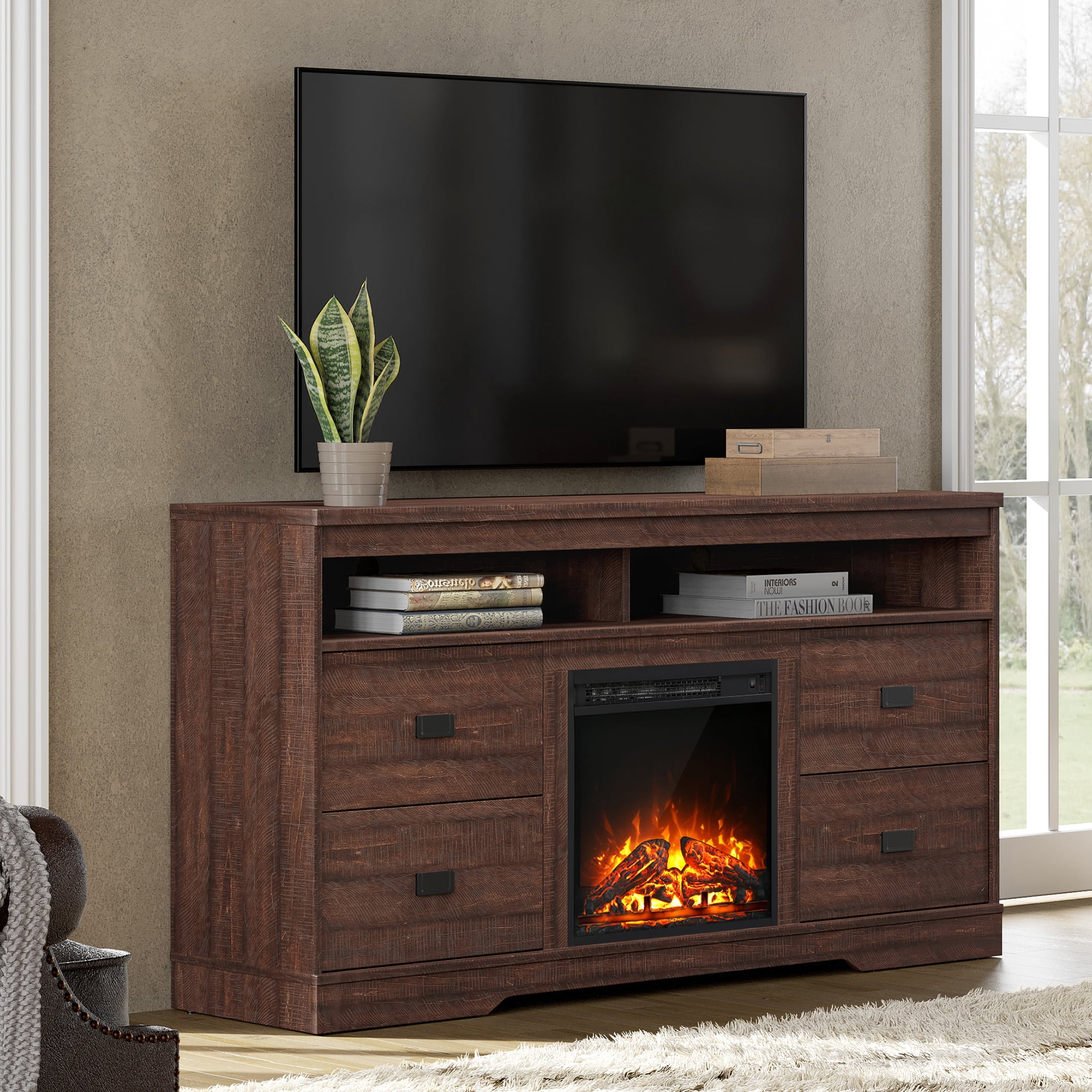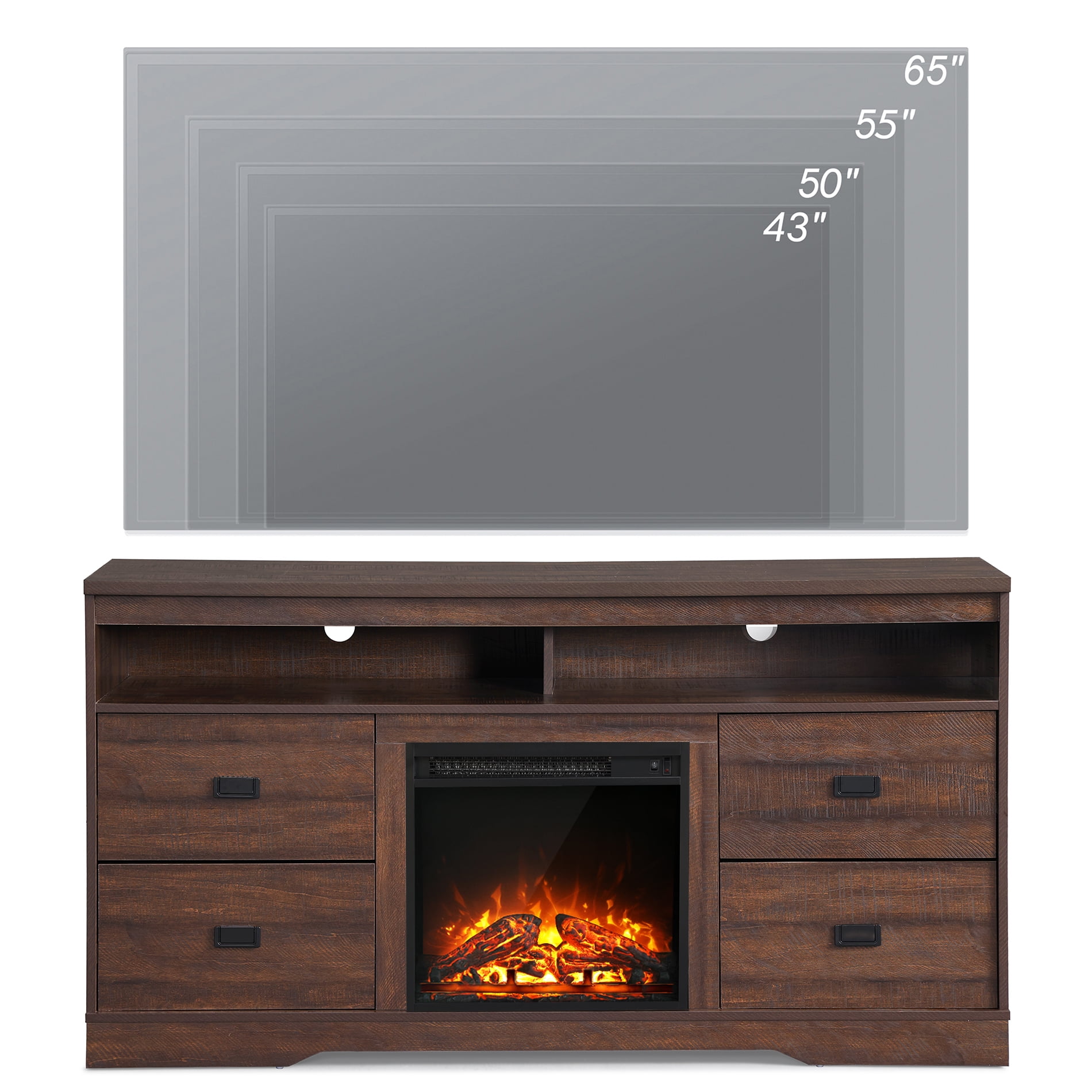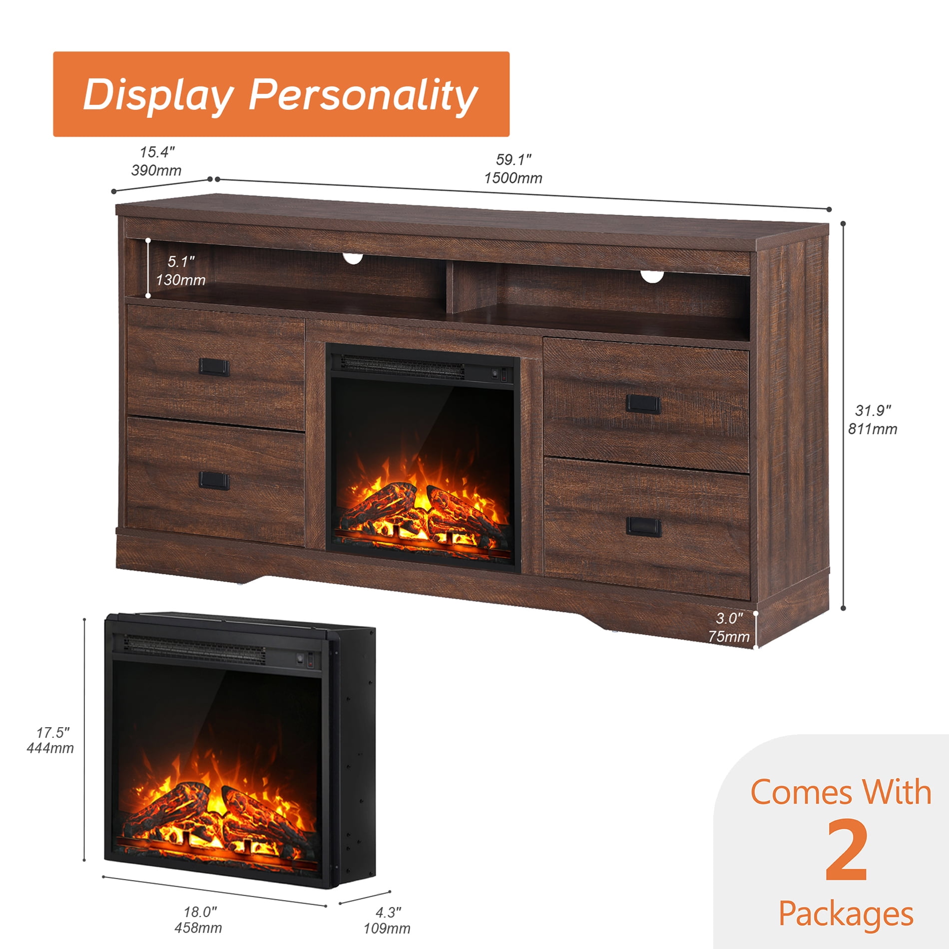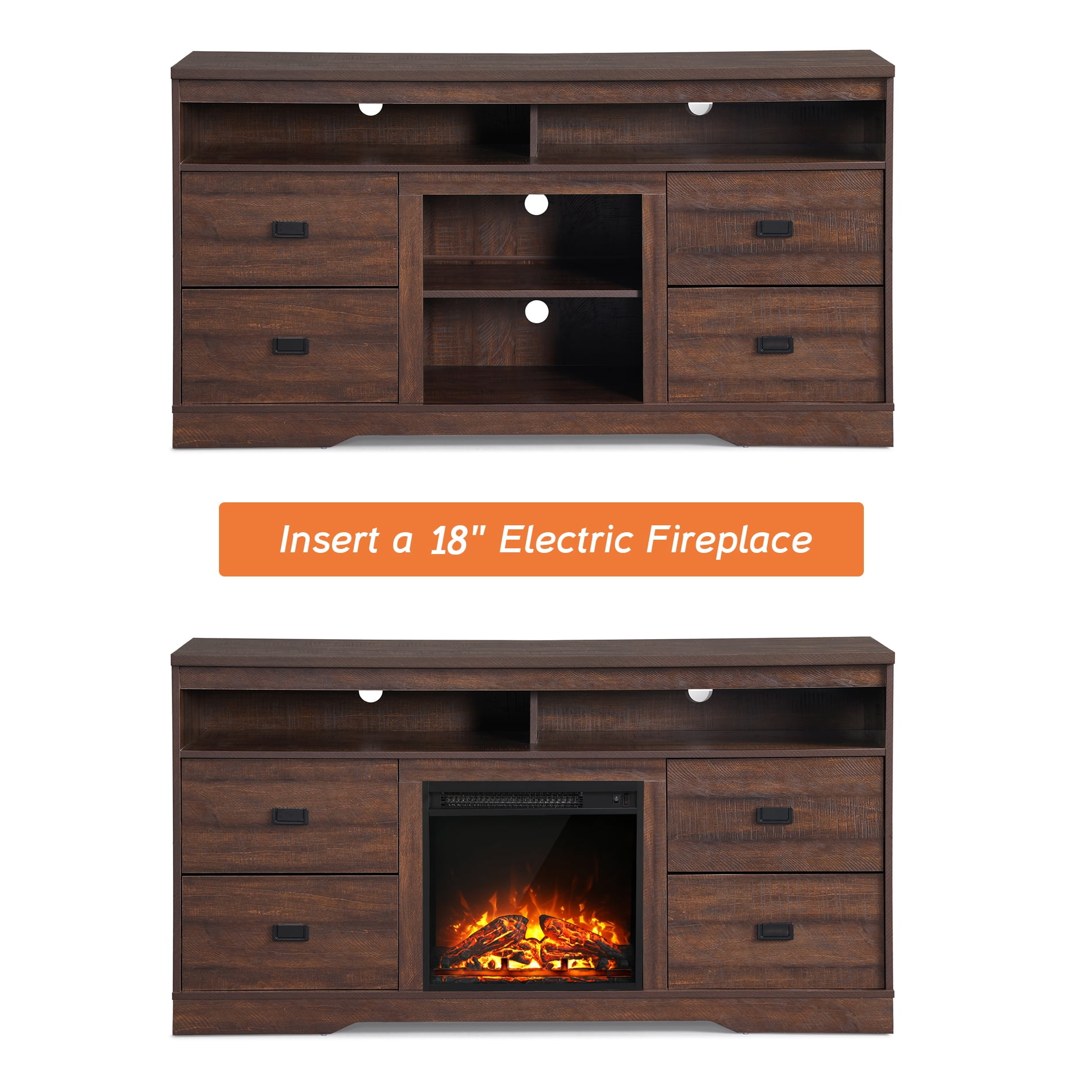 Farmhouse Style TV Table: Farmhouse tv stand features an exquisite retro metal decor, meanwhile its unique natural variations design in grain, color, and texture, add a touch of country style to your living area. Safe Design Electric Fireplace: 3D realistic flame effect with glowing log and ember. Plus, the flame effect of the insert fireplace can be used with or without heat providing the ambiance of a gentle rolling fire all year long. Ample and Flexible Storage: This television stand comes with 4 drawers, with a 3-level adjustable and removable shelf to assembly the electric fireplace . Open storage compartments at the top for the CDs, DVDs, gaming box, decorations, etc..Each beside storage cabinet has adjustable end shelves which offer extra storage. CABLE MANAGEMENT: Easily hiding all of the wires. It helps keep your living room tidy. EASY TO ASSEMBLE: Clear instruction is included, which has straightforward illustrations and descriptions.