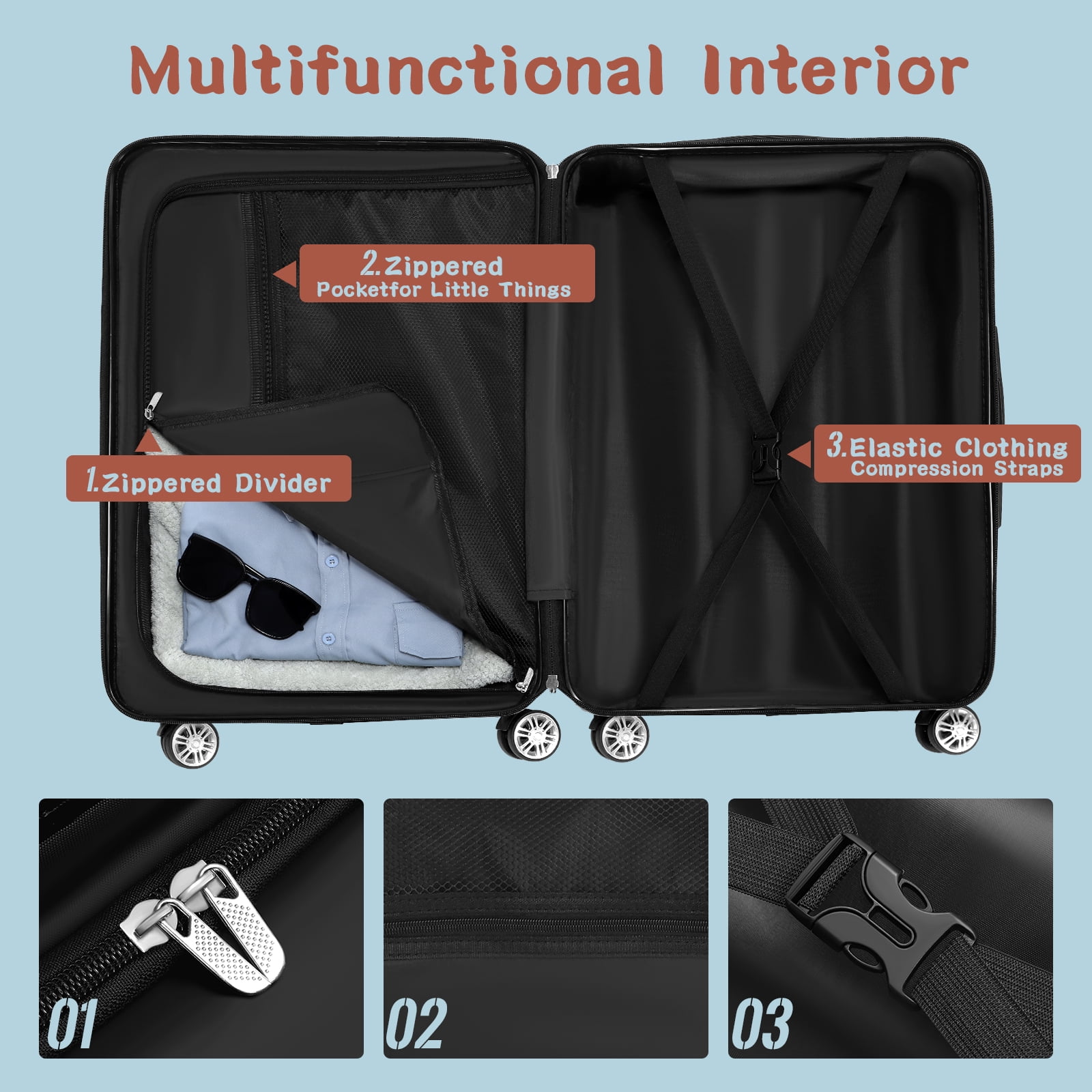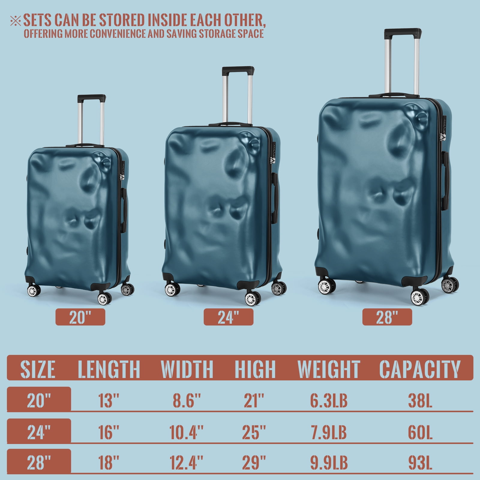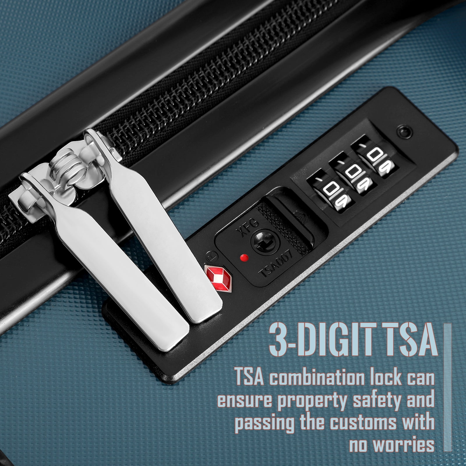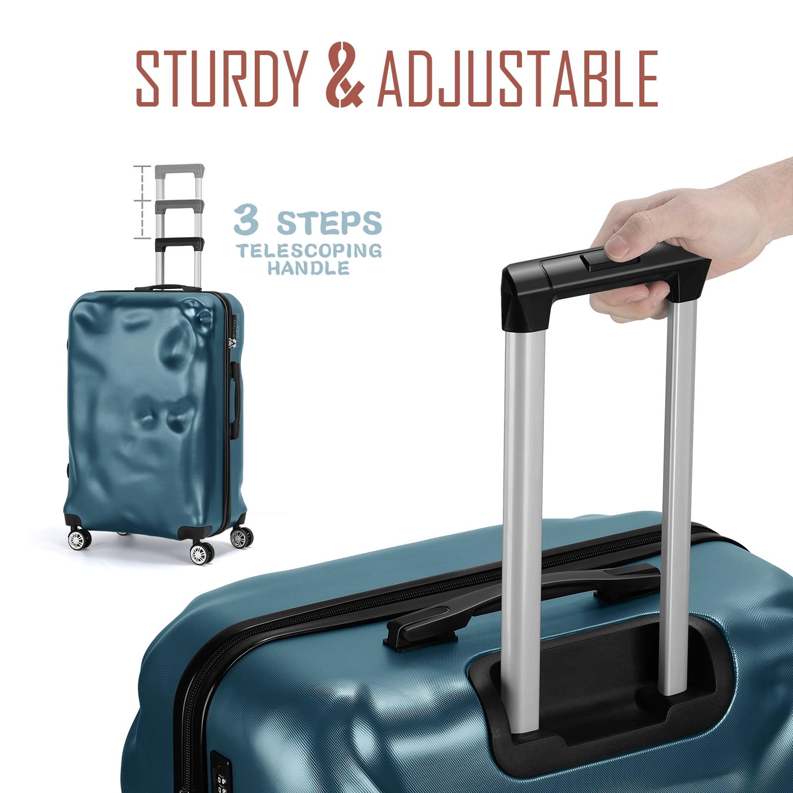 Multiple packing compartments for clothing, toiletries, devices and more Adjustable telescoping handle, comfort grip, recessed TSA lock, and 360-degree spinner wheels Three piece luggage set 20 inch, 24 inch, 28 inch upright, can be stored one into another 100% abs, lightweight yet extremely durable abs material Built-in TSA lock allows authorities to safely unlock and relock the bag for inspection when needed (Lock code default is set at 0-0-0)