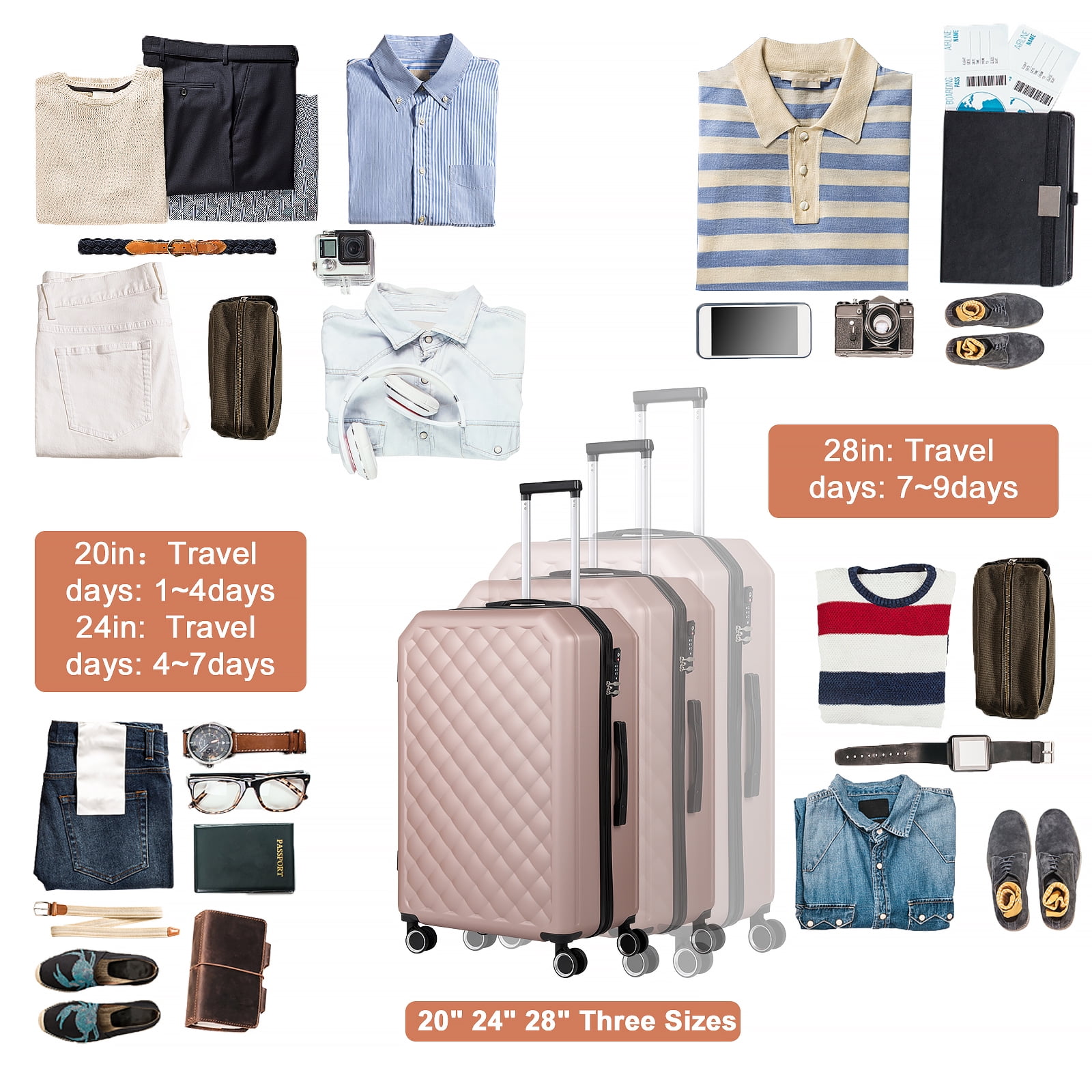 Multiple packing compartments for clothing, toiletries, devices and more Adjustable telescoping handle, comfort grip, recessed TSA lock, and 360-degree spinner wheels Three piece luggage set 20 inch, 24 inch, 28 inch upright, can be stored one into another. 100% abs, lightweight yet extremely durable abs material Built-in TSA lock allows authorities to safely unlock and relock the bag for inspection when needed (Lock code default is set at 0-0-0) Features Size: 28 inch, 24 inch, 20 inch Outer Material: Carbon fiber surface coating hard shell Wheels: 8-Wheel spinner wheels Handle: Adjustable telescopic handle with 3 height settings Interior Material: Polyester interior fabric Lock: TSA approved lock Zipper: Luggage Zipper Interior Features: Interior accessory pocket and adjustable hold-down strap Dimensions: 30 x 12 x 20 inches Weight: 25 pounds Capacity: > 7 days