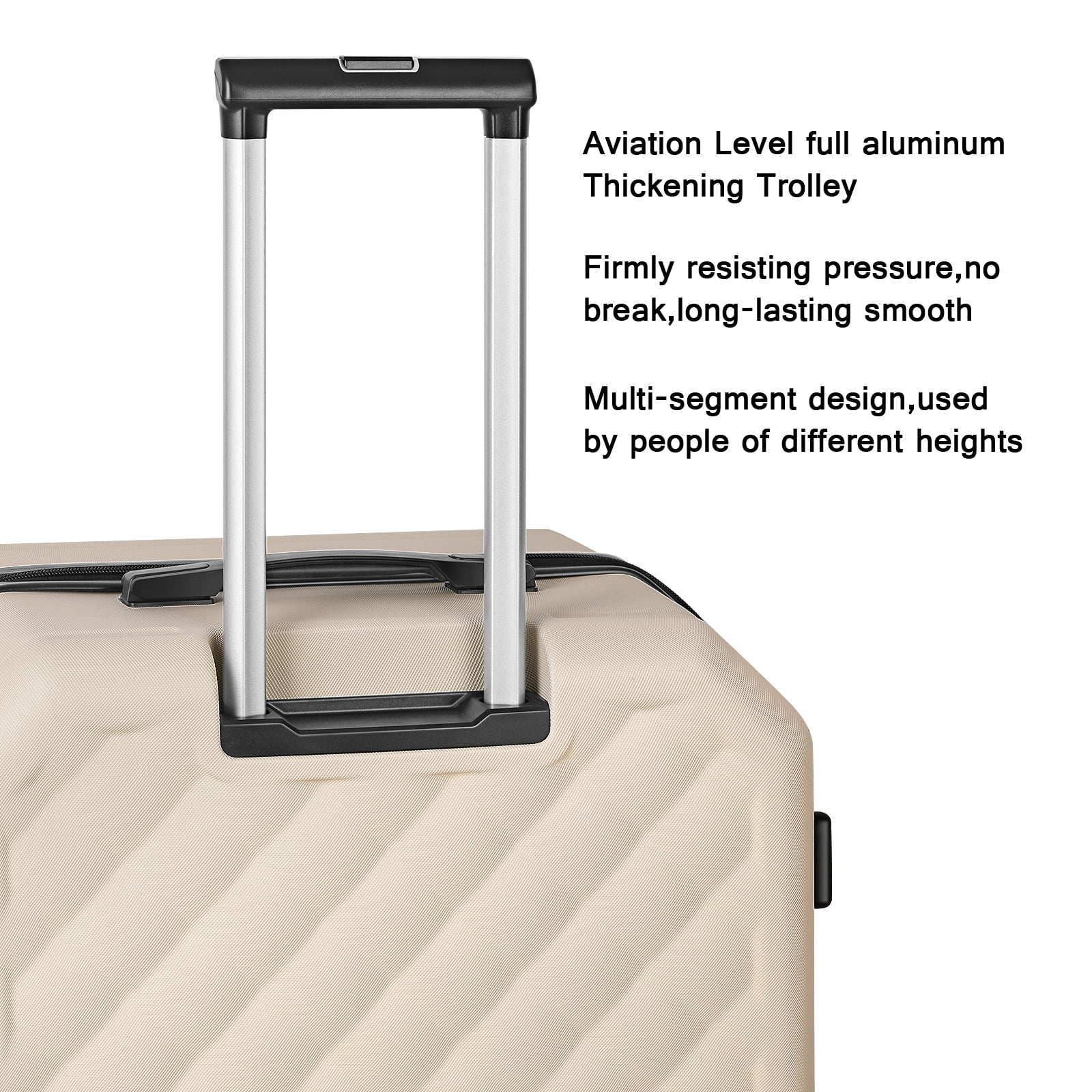Multiple packing compartments for clothing, toiletries, devices and more Adjustable telescoping handle, comfort grip, recessed TSA lock, and 360-degree spinner wheels Three piece luggage set 20 inch, 24 inch, 28 inch upright, can be stored one into another. 100% abs, lightweight yet extremely durable abs material Built-in TSA lock allows authorities to safely unlock and relock the bag for inspection when needed (Lock code default is set at 0-0-0) It features a telescoping trolley handle to help easily roll around the suitcase.