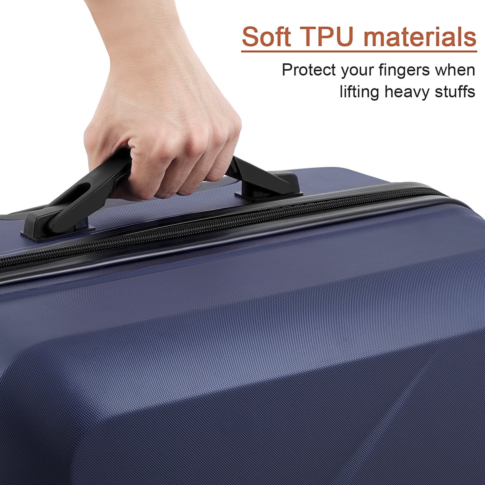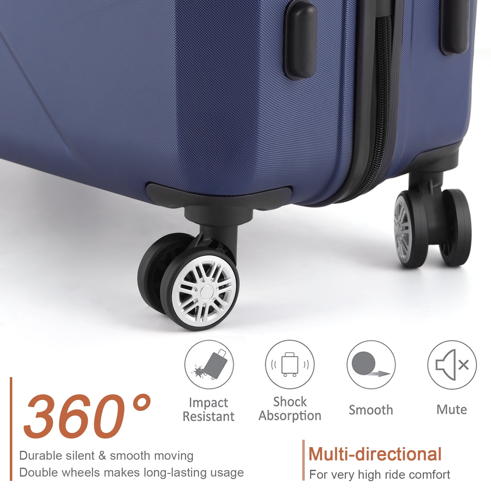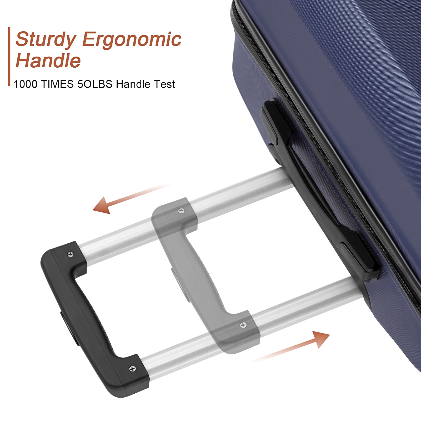 Multiple packing compartments for clothing, toiletries, devices and more Adjustable telescoping handle, comfort grip, recessed TSA lock, and 360-degree spinner wheels Three piece luggage set 20 inch, 24 inch, 28 inch upright,can be stored one into another. 100% abs, lightweight yet extremely durable abs material Built-in TSA lock allows authorities to safely unlock and relock the bag for inspection when needed (Lock code default is set at 0-0-0) 8-Wheel spinner wheels Adjustable telescopic handle with 3 height settings