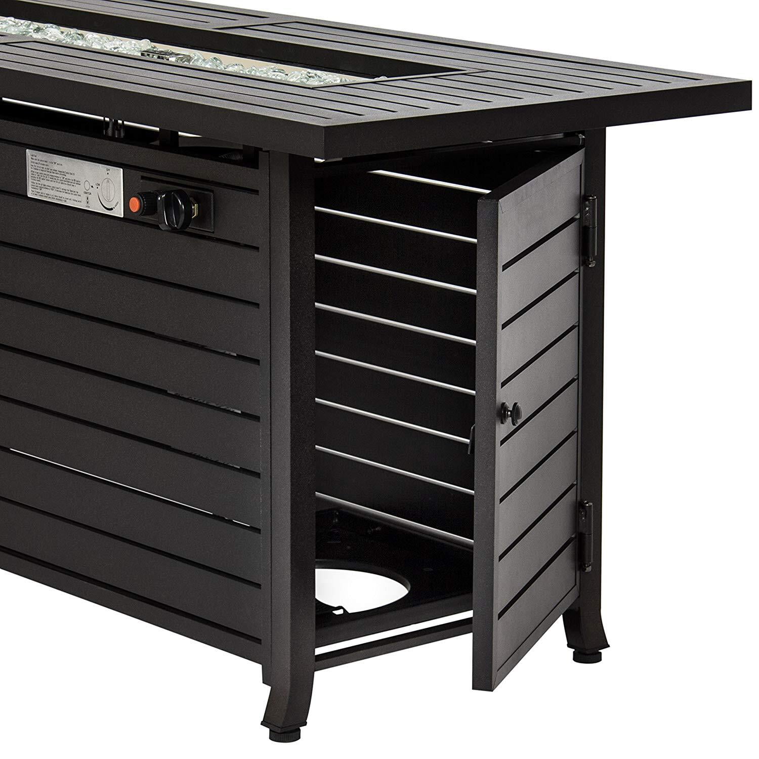Dimensions: 54″L x 22″W x 25″H Weight: 97lb 35″ x 9″ rectangle burner Fire glass included 50,000 BTUs, Variable control with thermocouple Wind screen included Electric ignition Operates on a 20lb tank, not included Black mocha finish