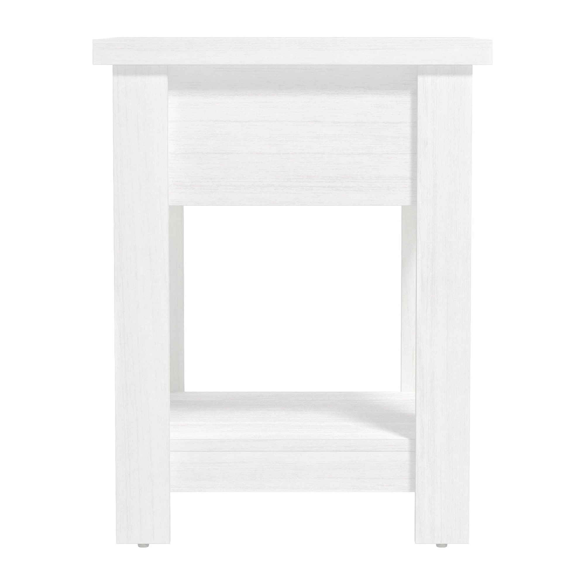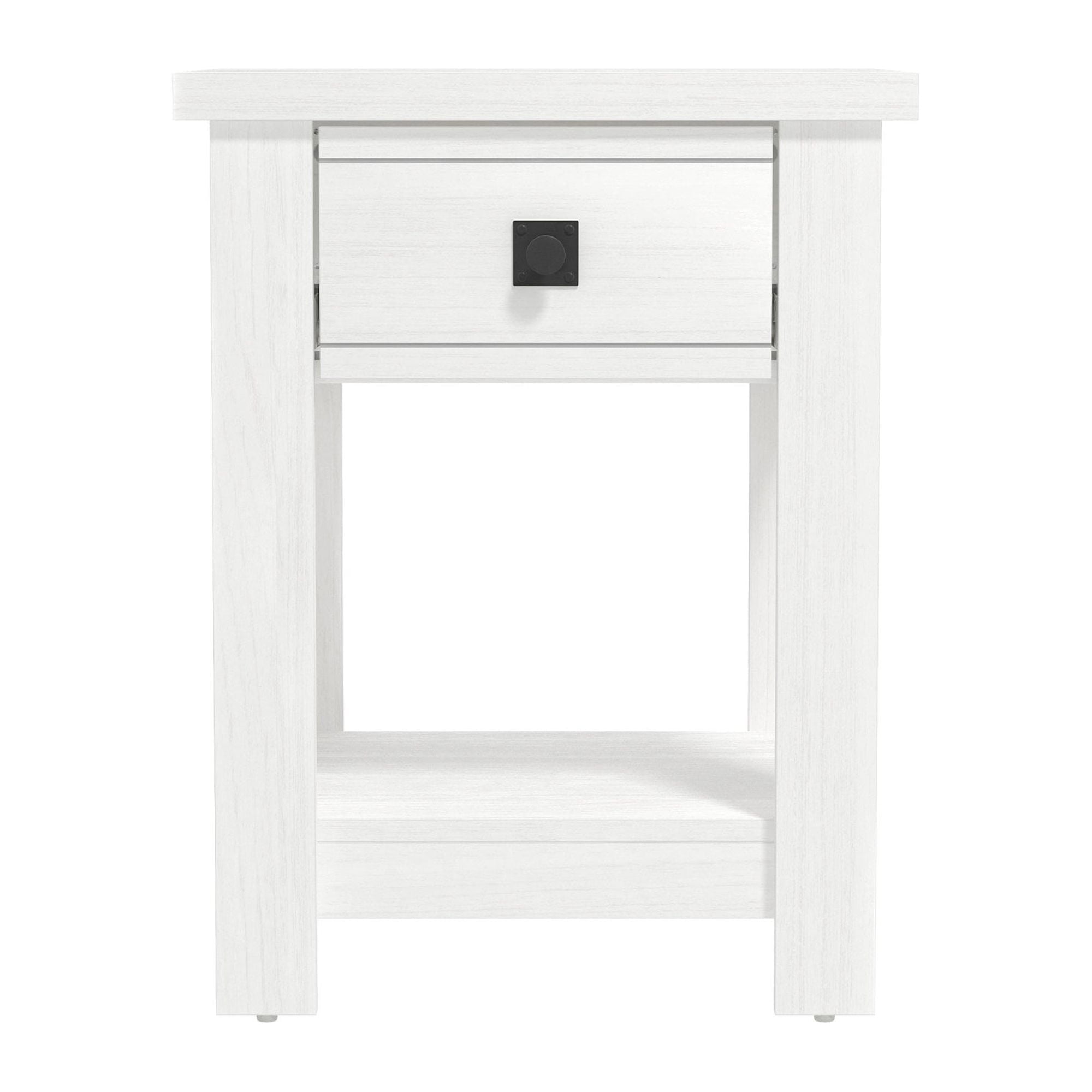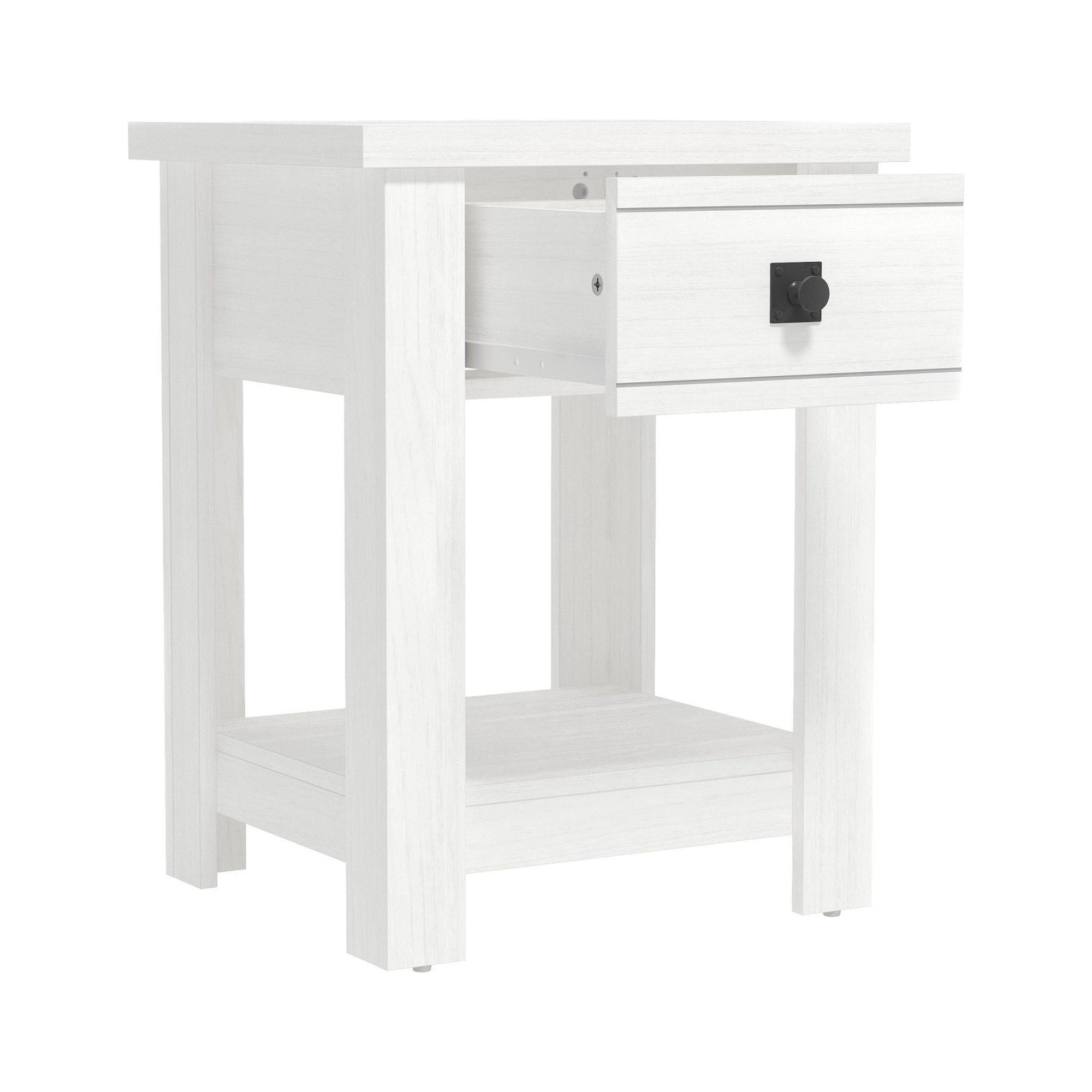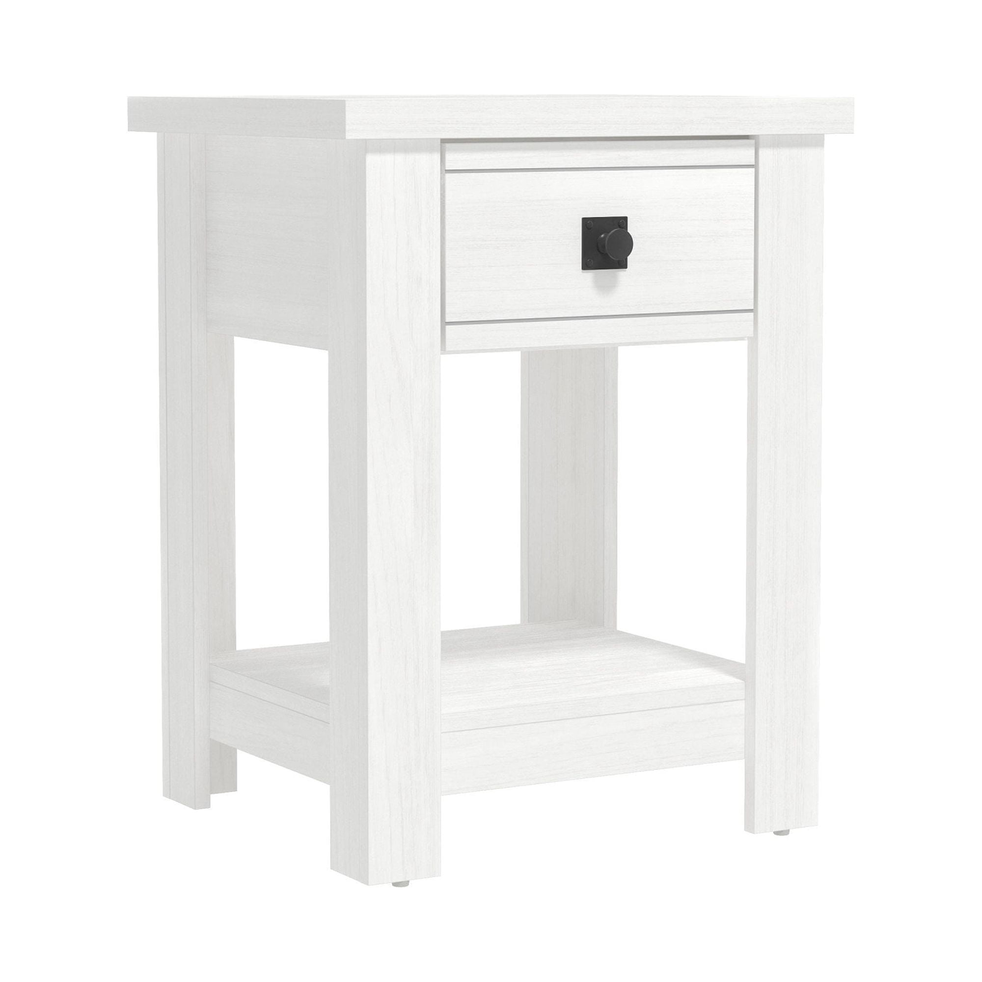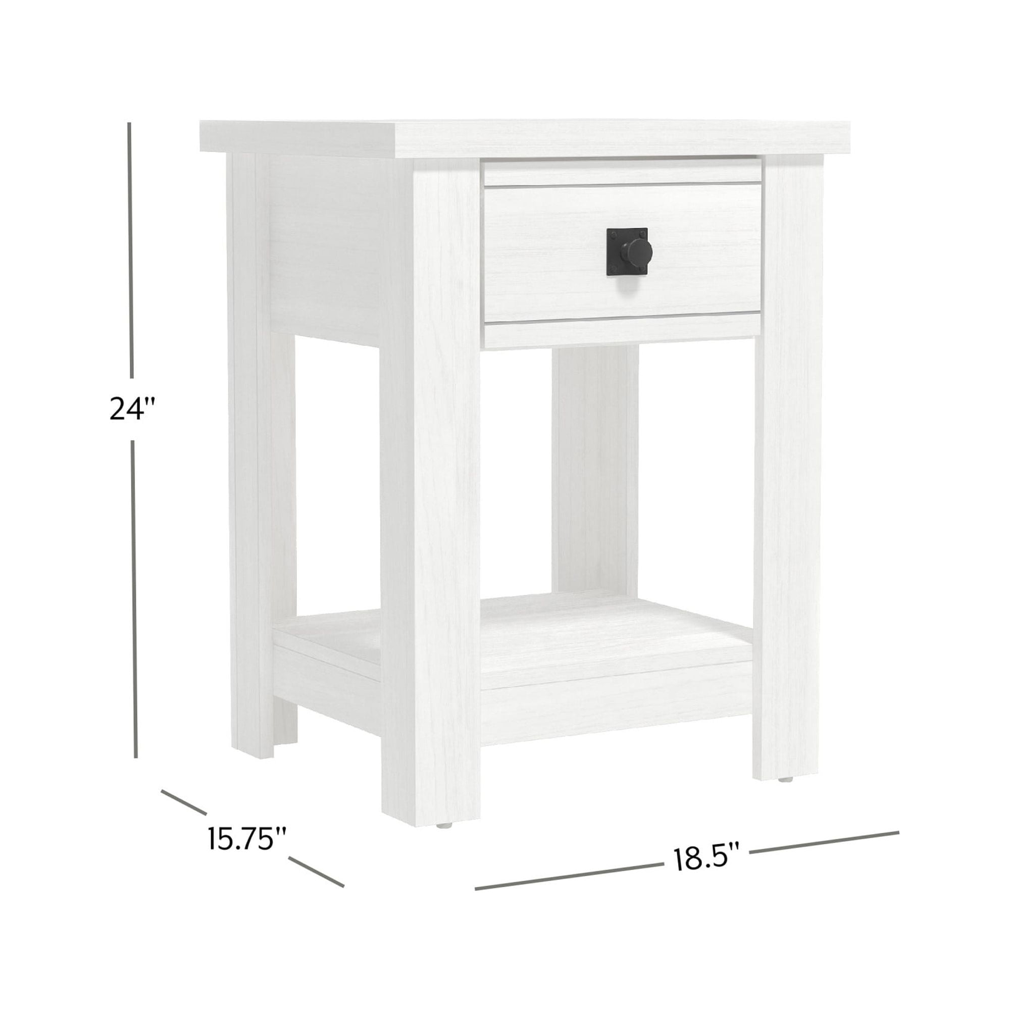 Farmhouse single drawer adult end table in a white finish Features a single pull-out drawer and open bottom shelf for easy accessibility and storage Constructed of high-grade MDF for long-lasting durability Overall Dimensions: 24H x 18.5W x 15.75D Versatile table can be used as an accent table in the living room, bedroom or entryway Spot or wipe clean For residential use Item will ship in one box Assembly Required