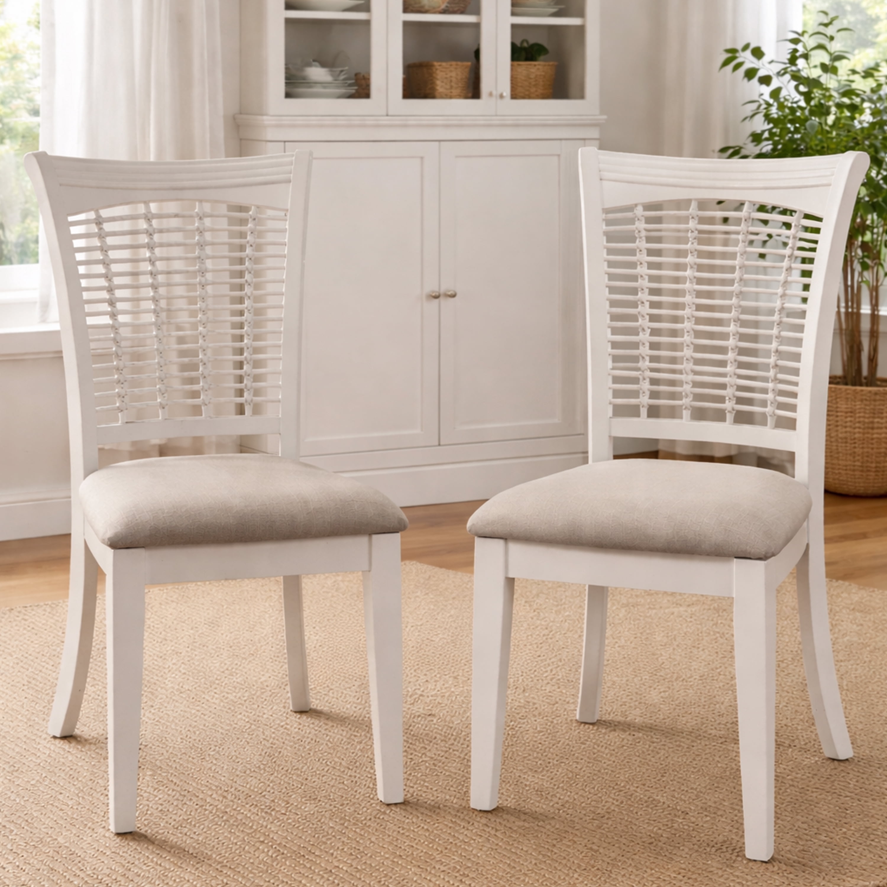 Casual dining chair with Unique wicker back design reminiscent of bamboo Features a white finish with a creamy beige upholstered seat Set of 2 dining chairs Overall Dimensions: 37.5H X 21.5W X 18.5D Assembly required Item ships in one box Wood Construction Residential use only Dust and polish with non-abrasive cleaners Chair Recommended Weight limit: 250 lbs.