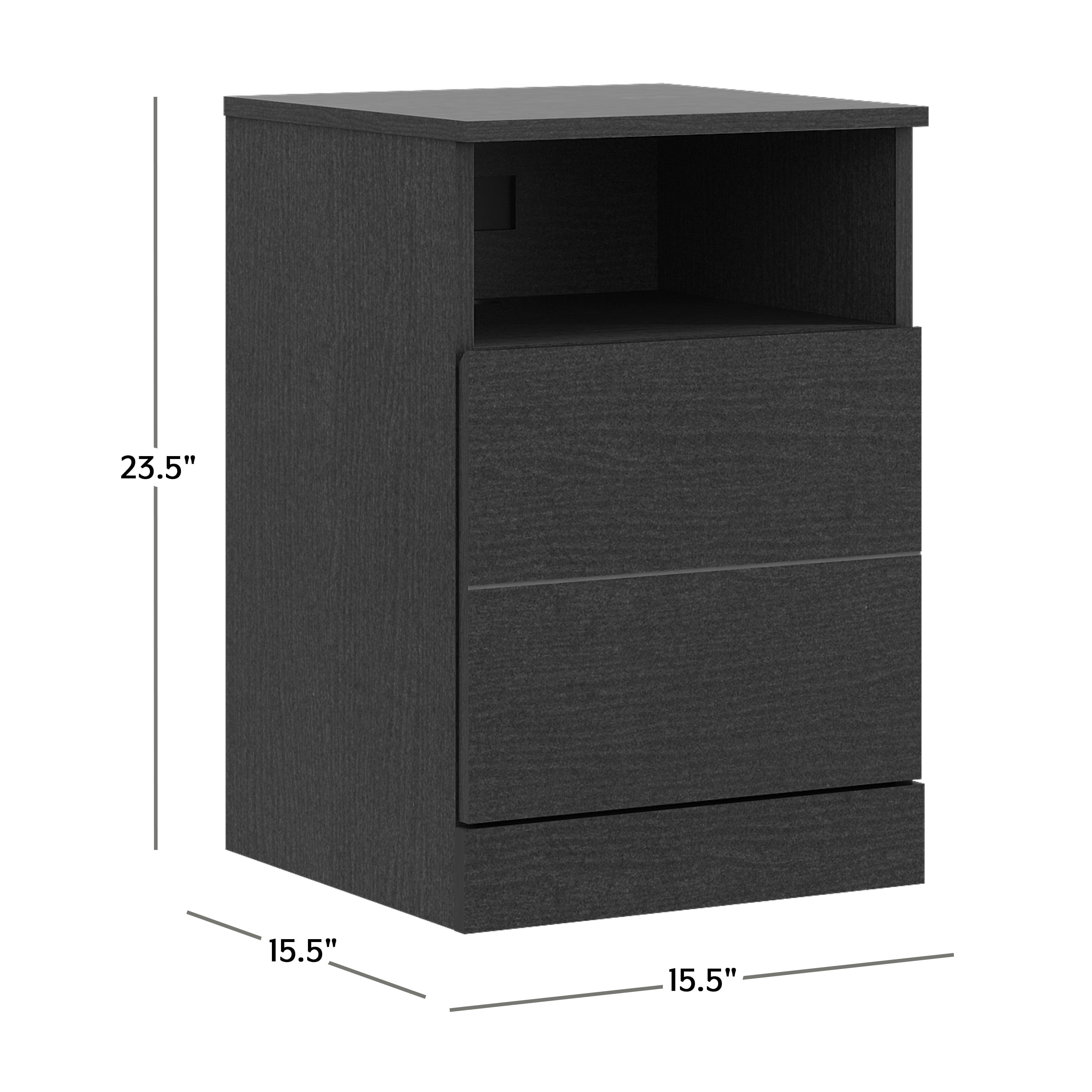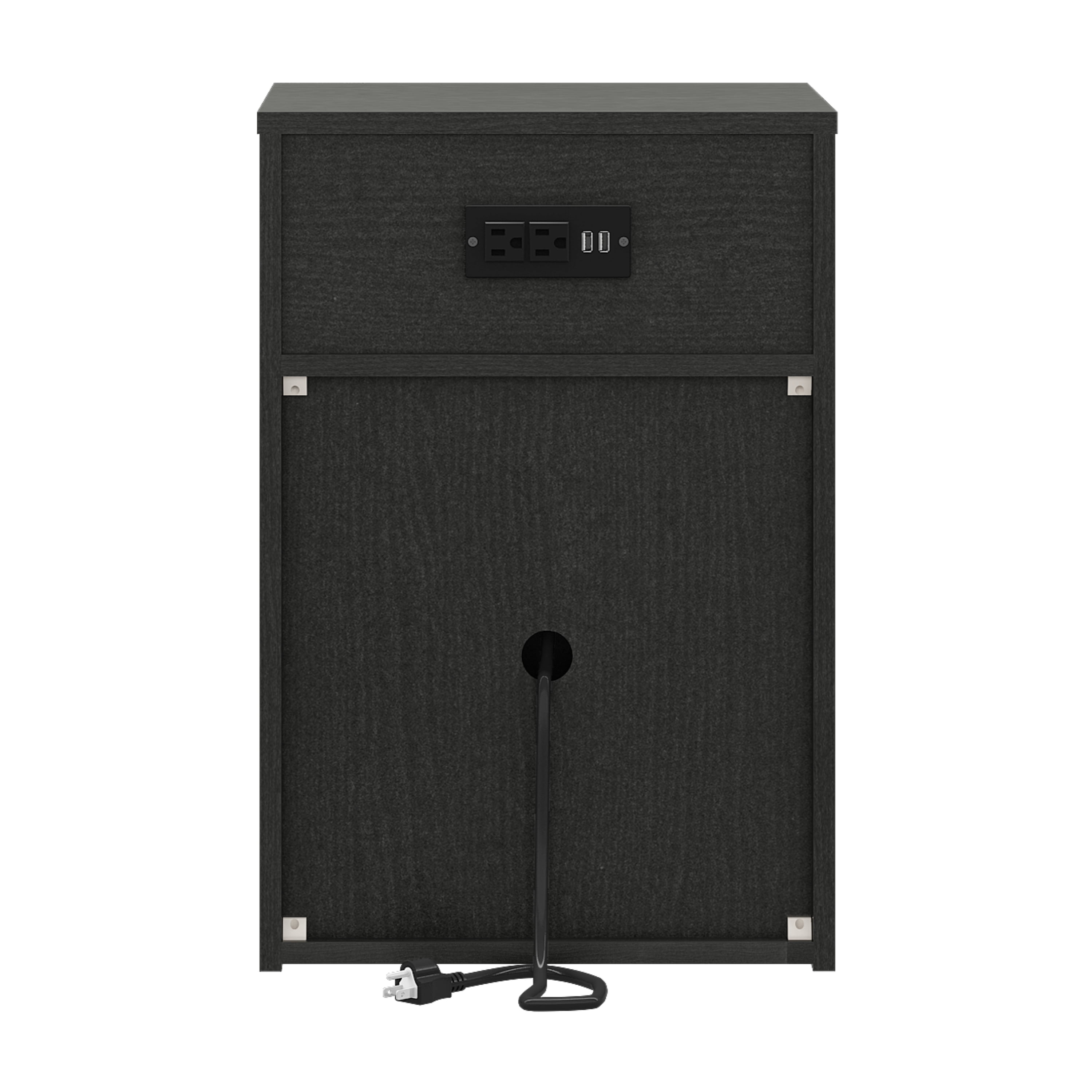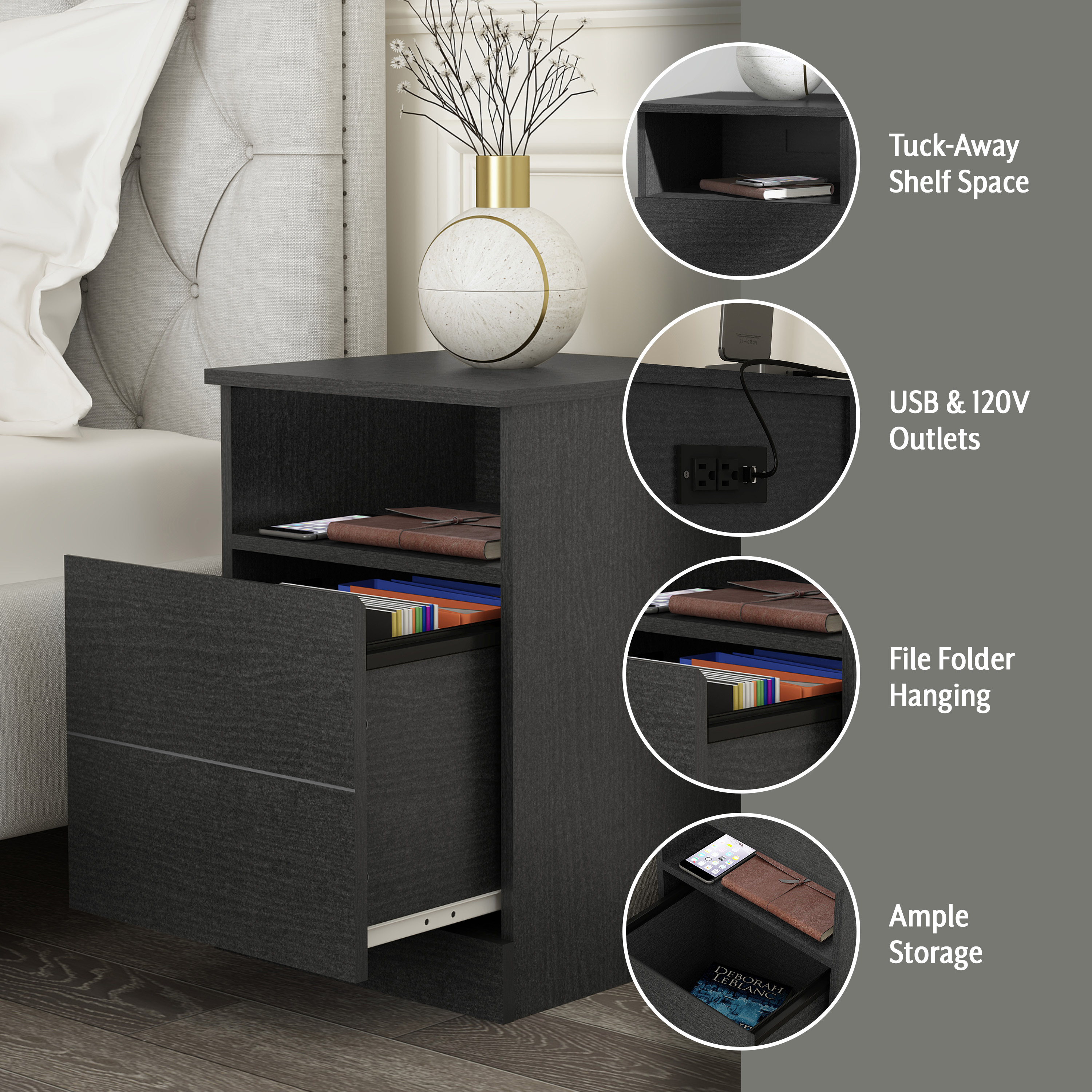 Modern multifunctional wood End Table with a weathered Gray finish Power up with two 120 V outlets and two USB charging stations Open shelf storage with convertible, file drawer on metal slides Overall Dimensions: 23.5″ H x 15.5″ W x 15.5″ L Assembly required Item will ship in one box Works well in the office, living room, and guest bedrooms Spot or wipe clean For residential use only