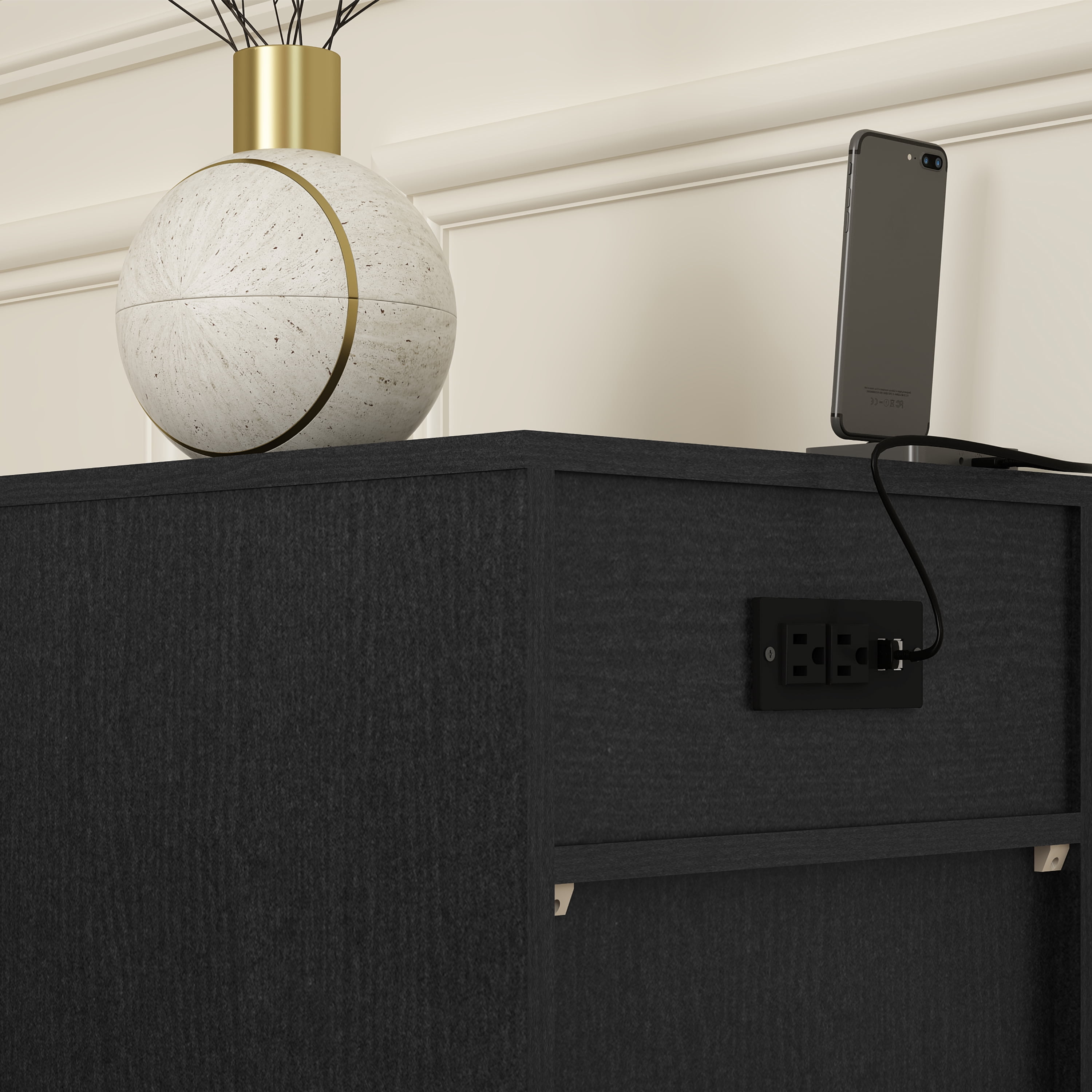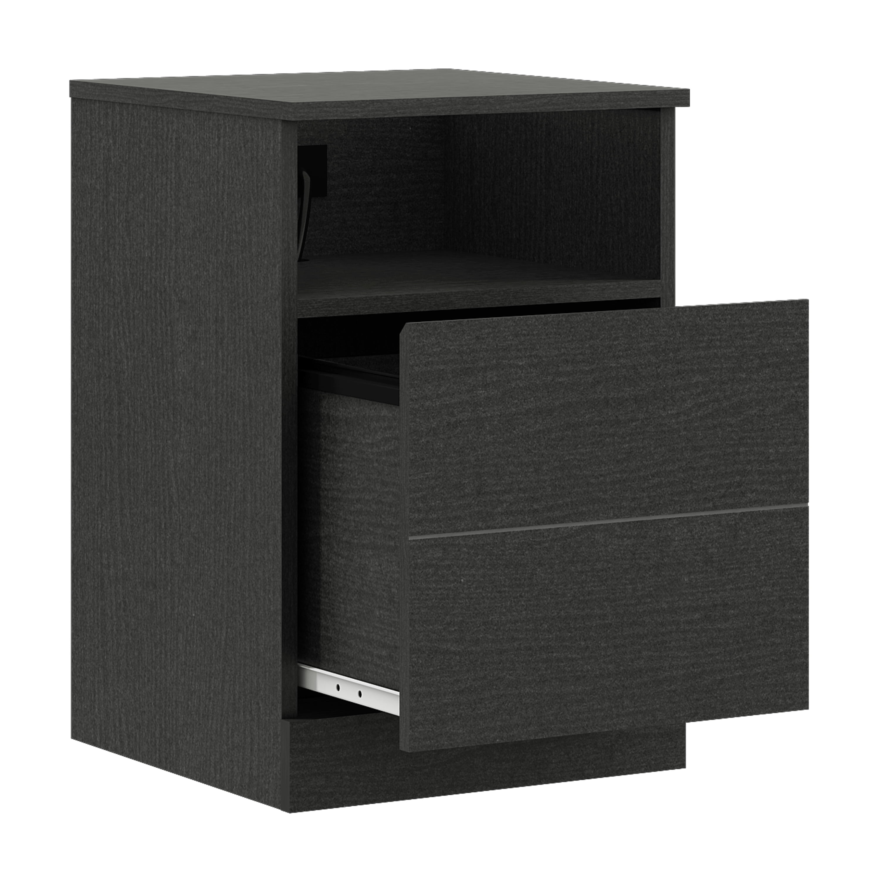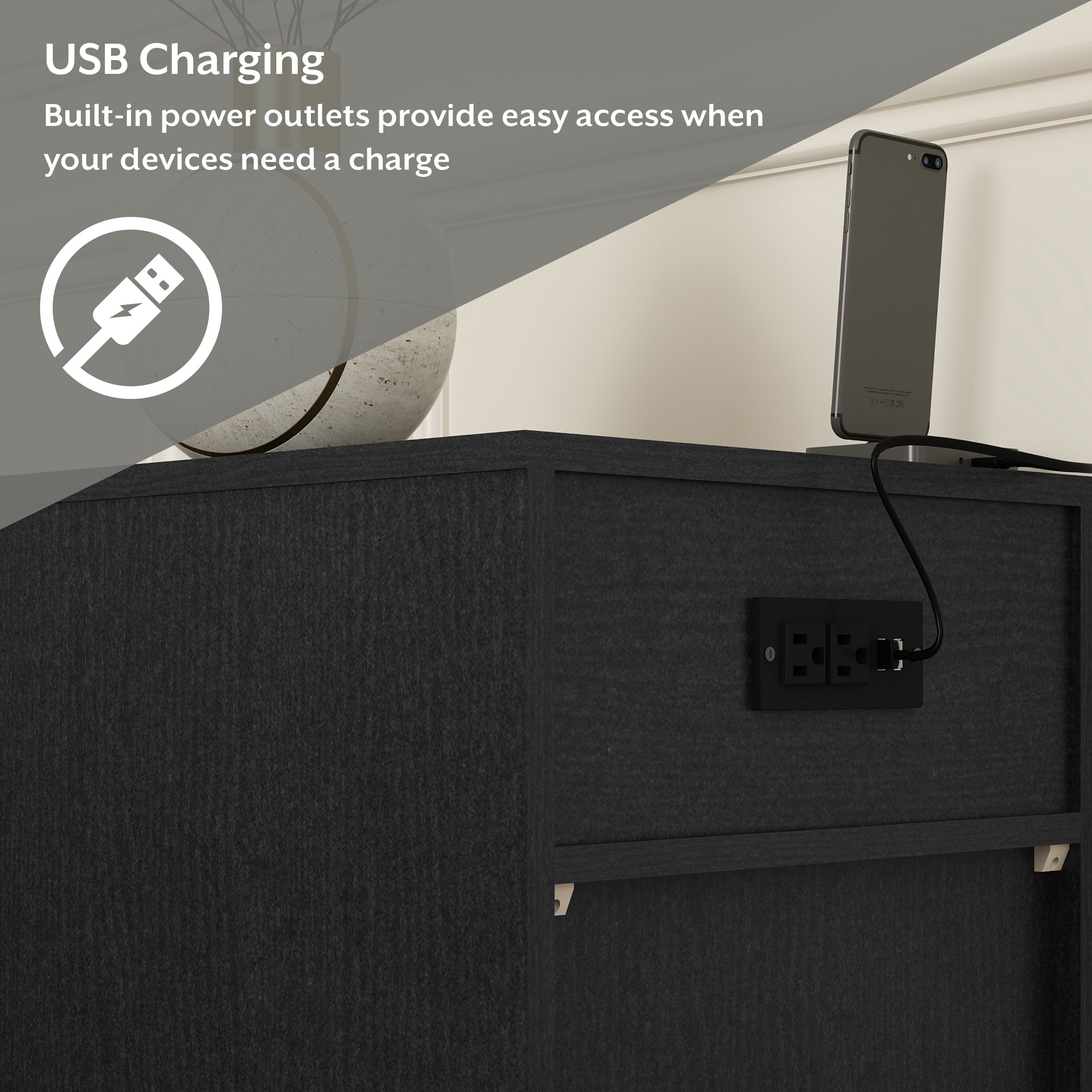 Modern multifunctional wood End Table with a weathered Gray finish Power up with two 120 V outlets and two USB charging stations Open shelf storage with convertible, file drawer on metal slides Overall Dimensions: 23.5″ H x 15.5″ W x 15.5″ L Assembly required Item will ship in one box Works well in the office, living room, and guest bedrooms Spot or wipe clean For residential use only