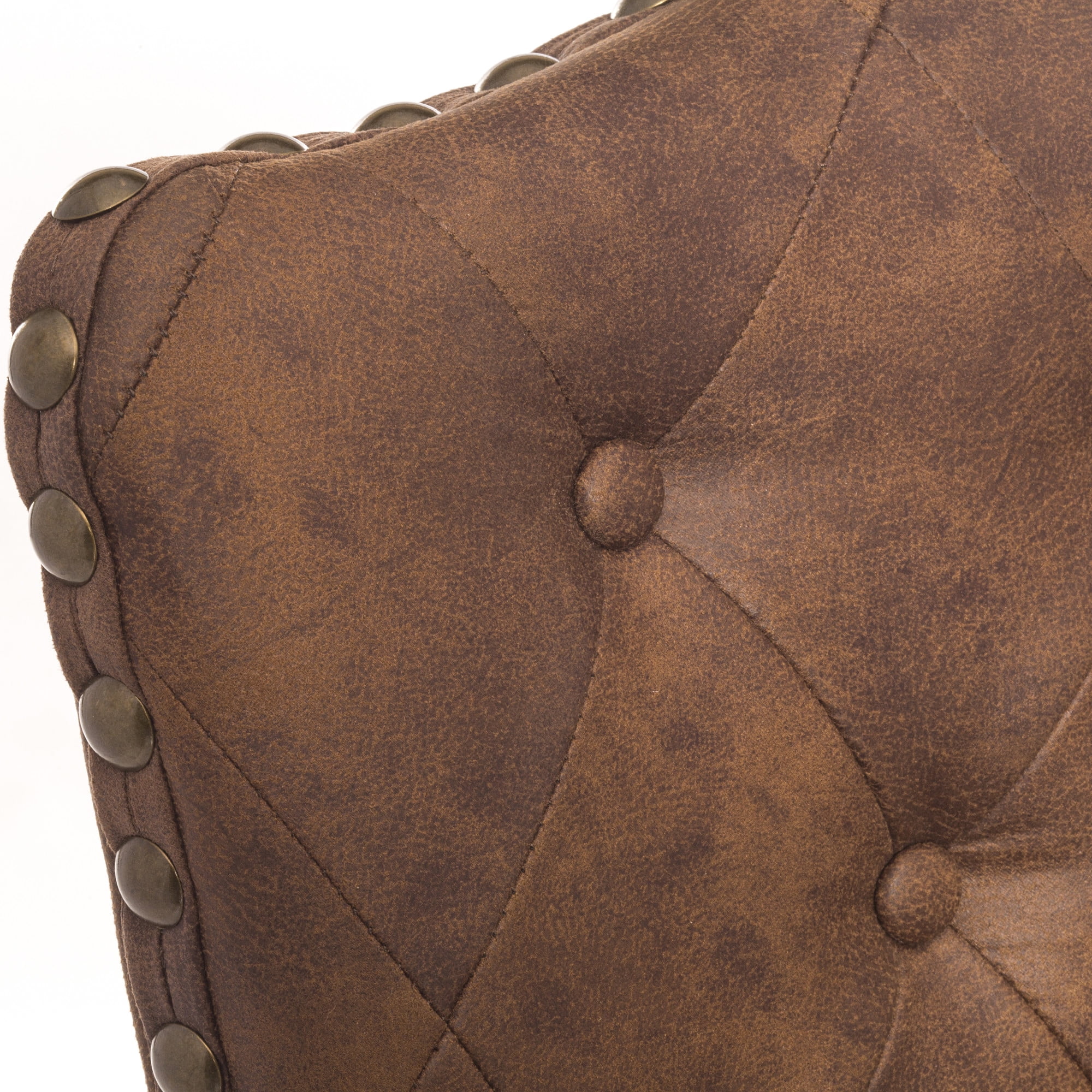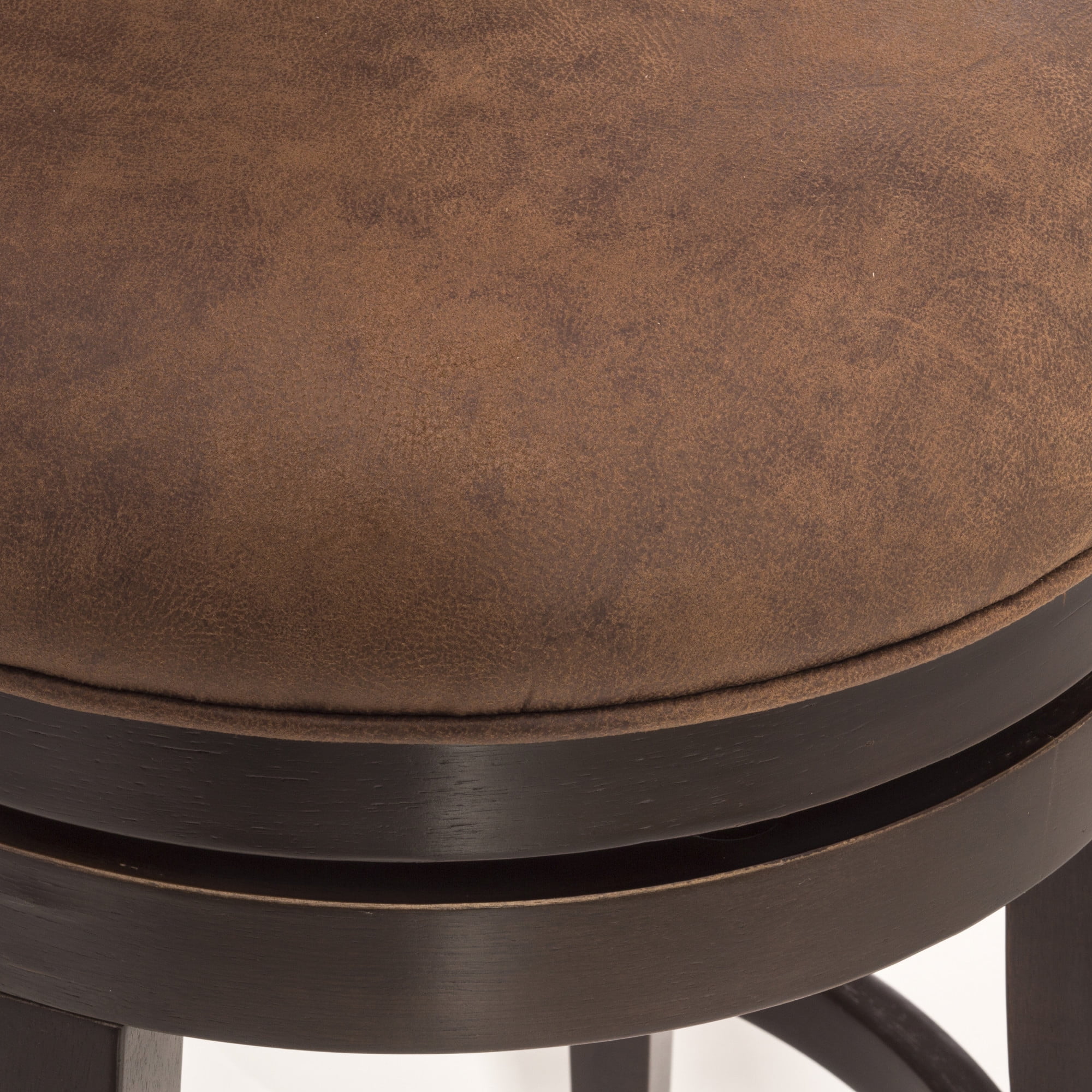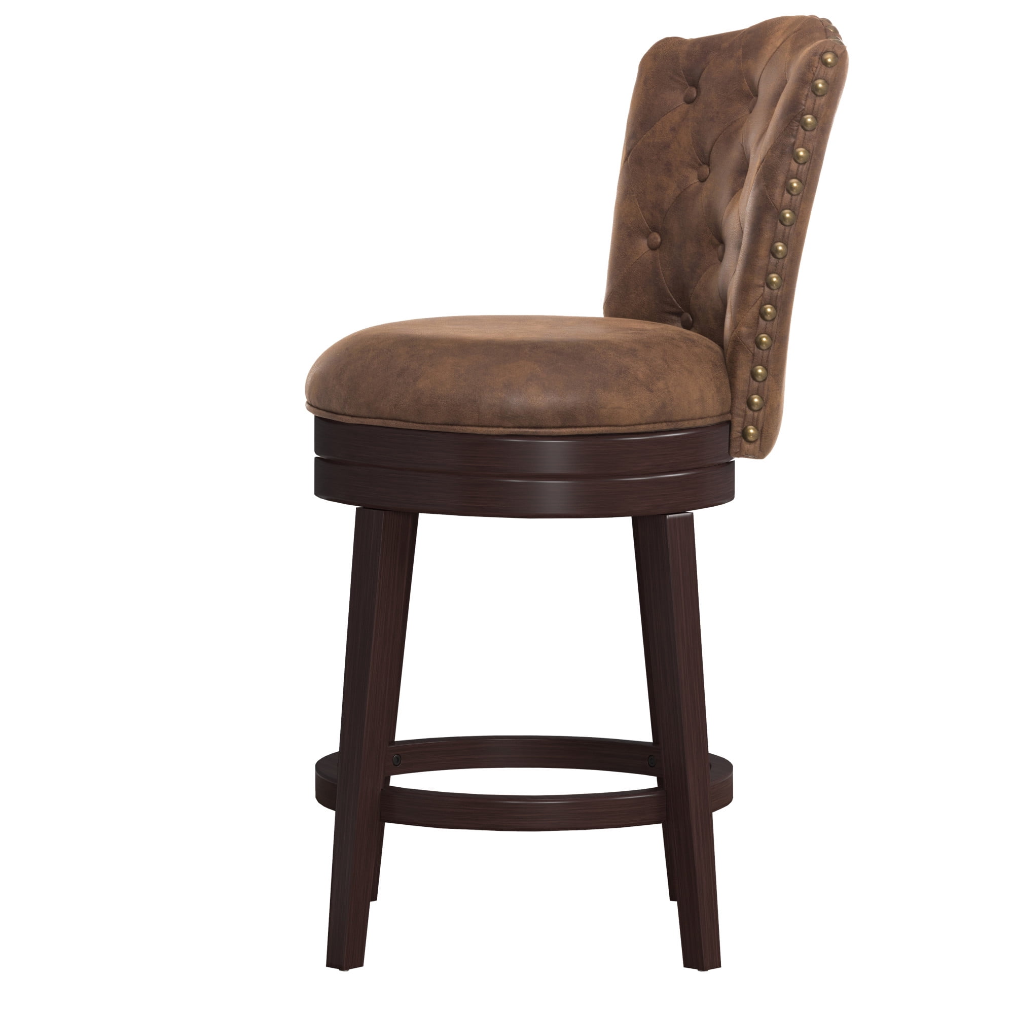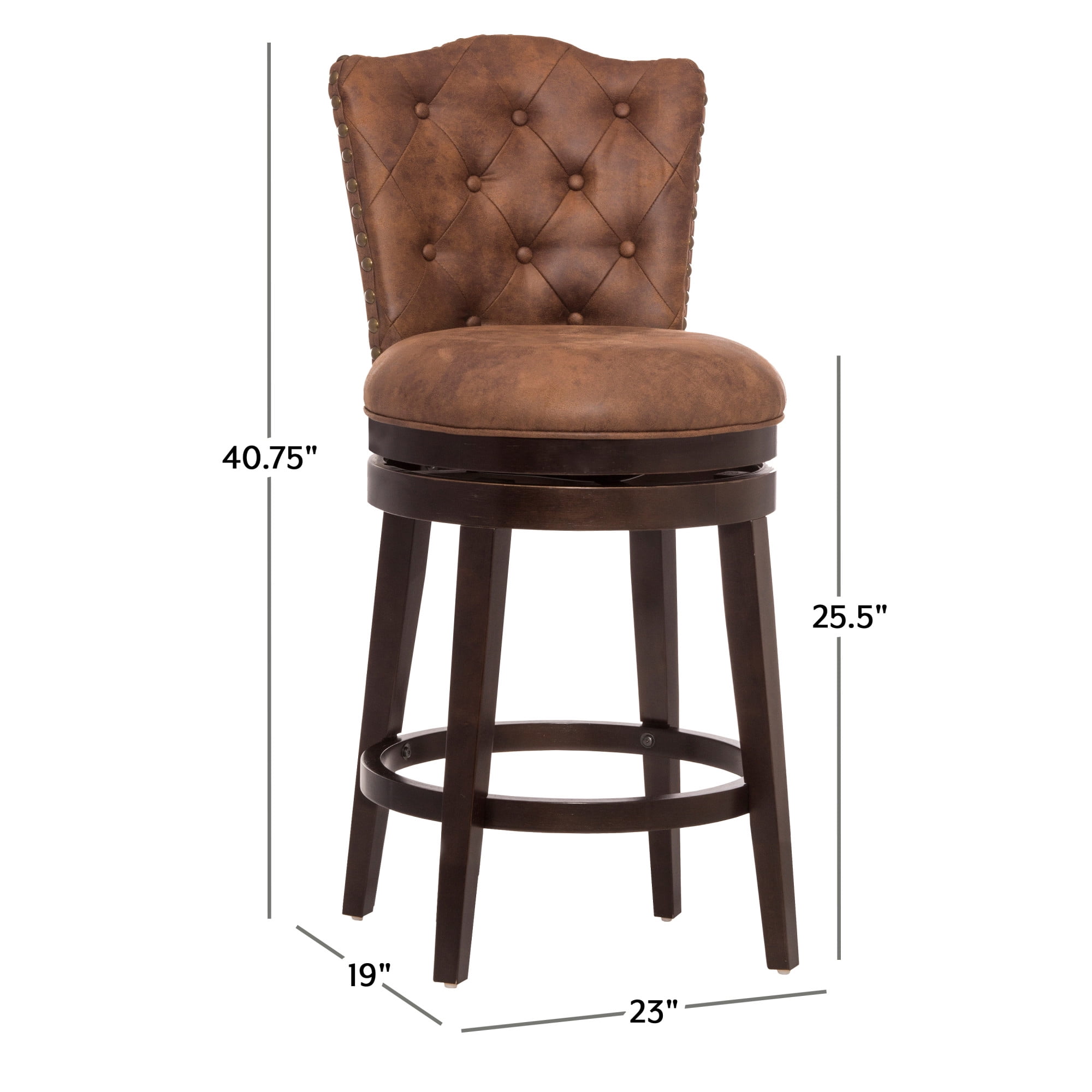 Elegant wood swivel counter height stool with arch back and nail head accents Chocolate Brown wood counter stool with compound arch back The round 360 degree swivel seat is upholstered in a chestnut faux leather Overall Dimensions: 40.75H x 19W x 23D; Seat Height: 25.5H; Seat Diameter: 19.75W Assembly required Crafted from Rubberwood hardwood and 100% vinyl upholstery Works best with counters that are 34-38 inches in height Recommend Weight Limit: 250 lbs. Item Ships in One Box Dust and polish with non-abrasive cleaners as needed