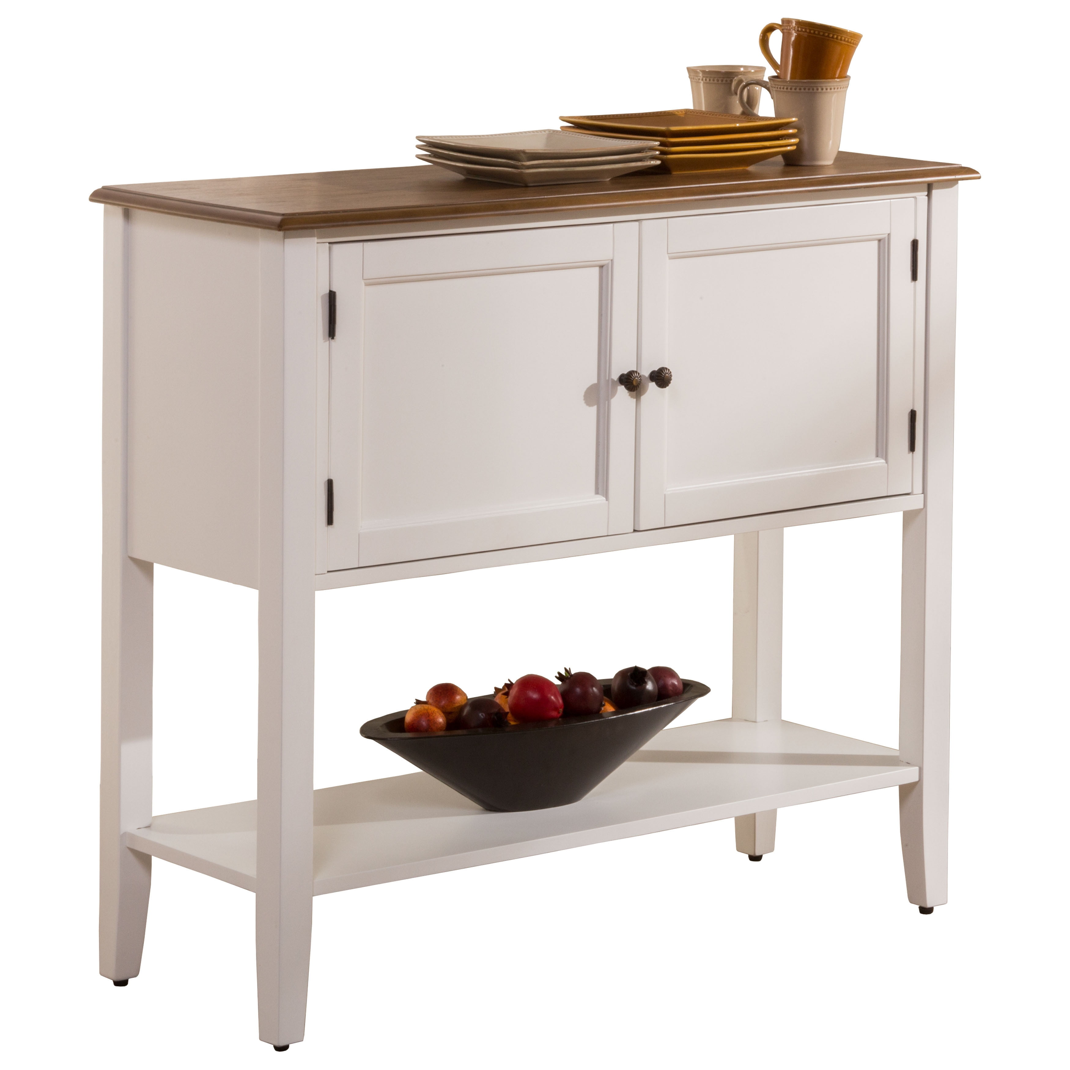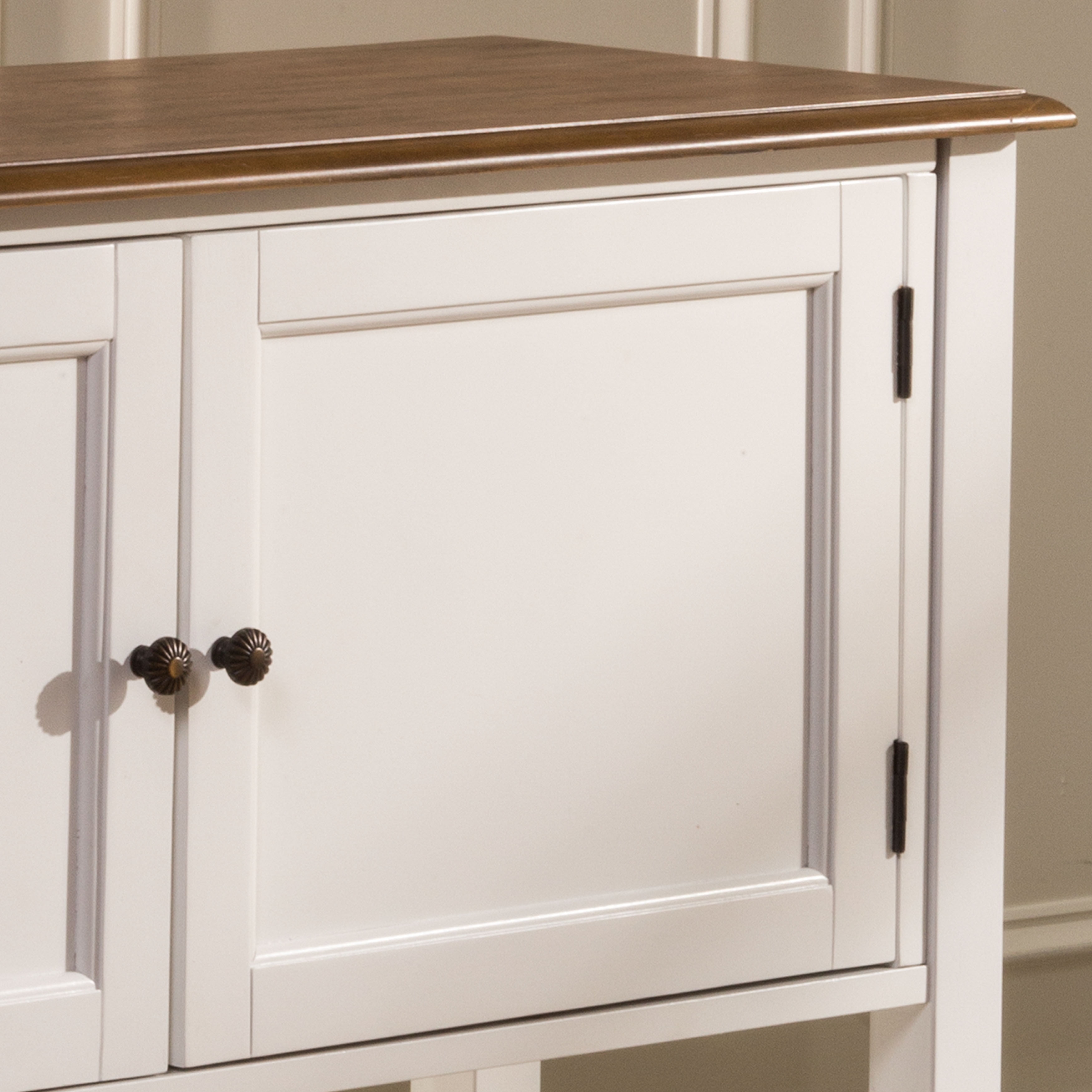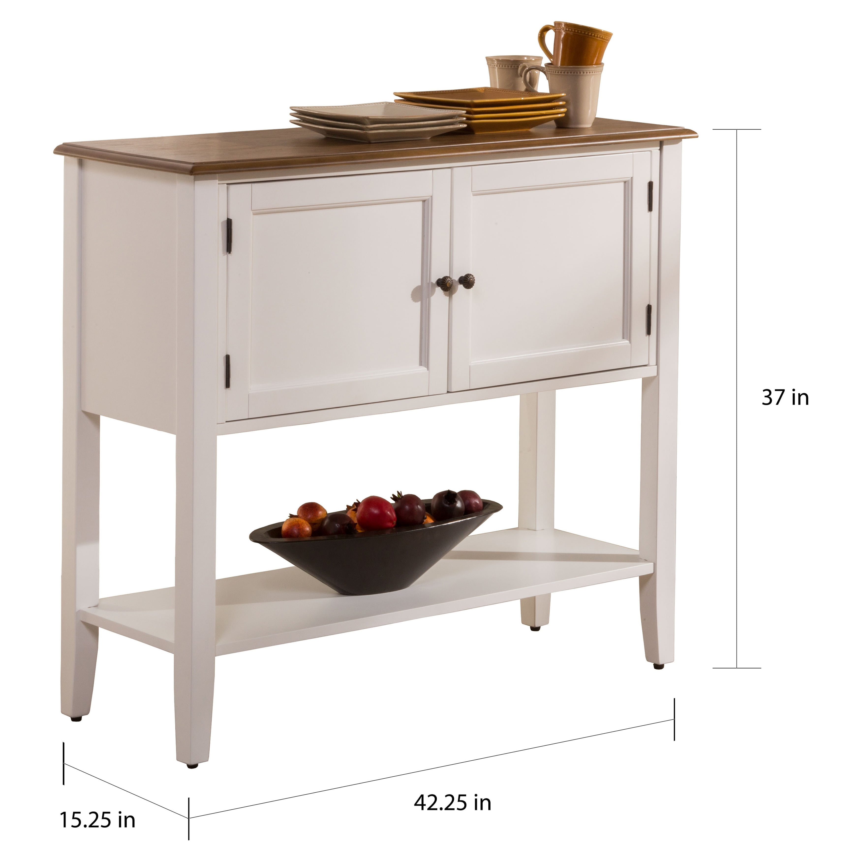 Casual farmhouse server in a two-toned white and wood finish 2 cabinet spaces plus 1 fixed lower shelf for ample storage Solidly constructed from rubberwood for durable usage Overall Dimensions: 37H X 42.25W X 15.25D Assembly required Crafted from solid woods and climate-controlled wood composites Residential use only Dust and polish with non-abrasive cleaners Recommended Weight Limit: 250lbs