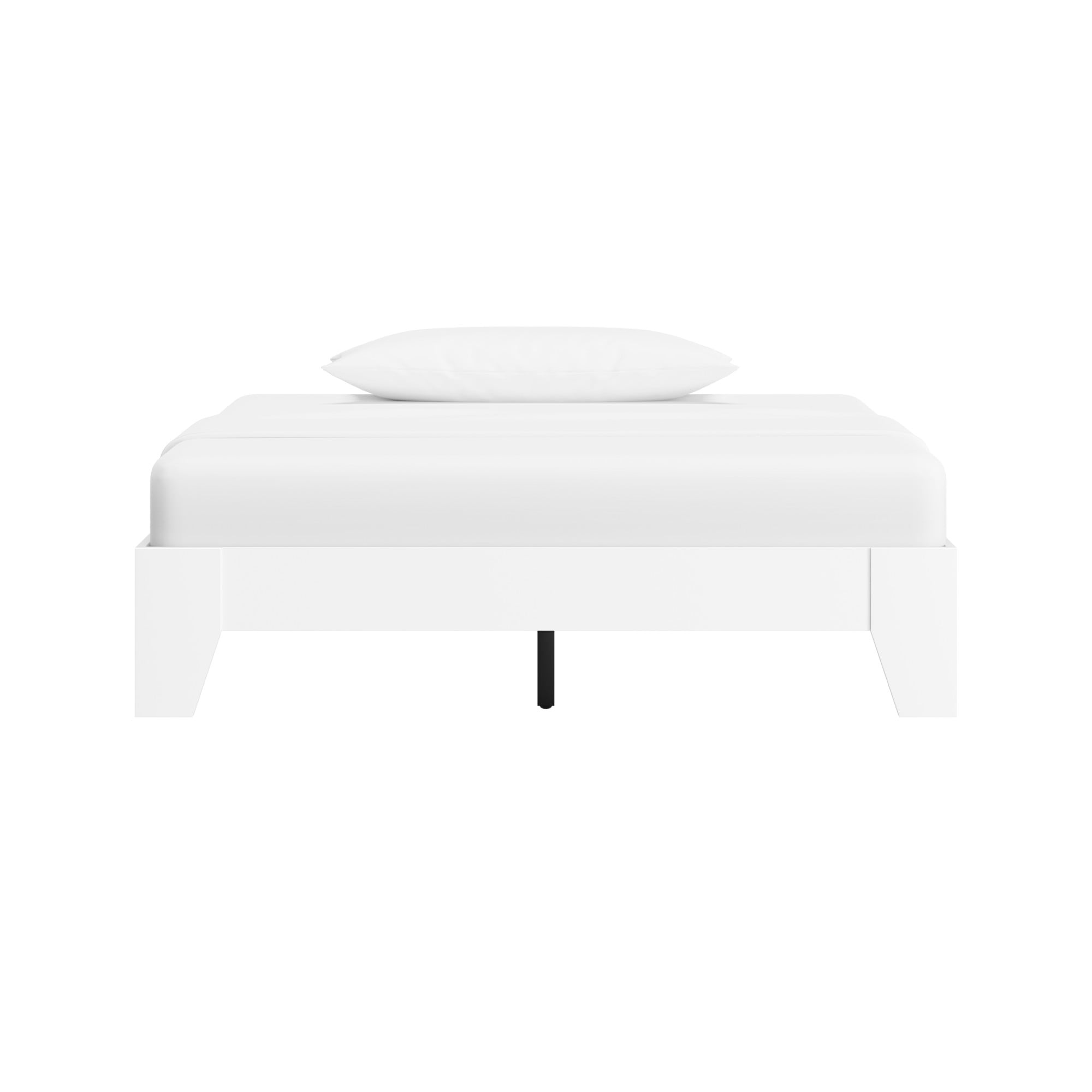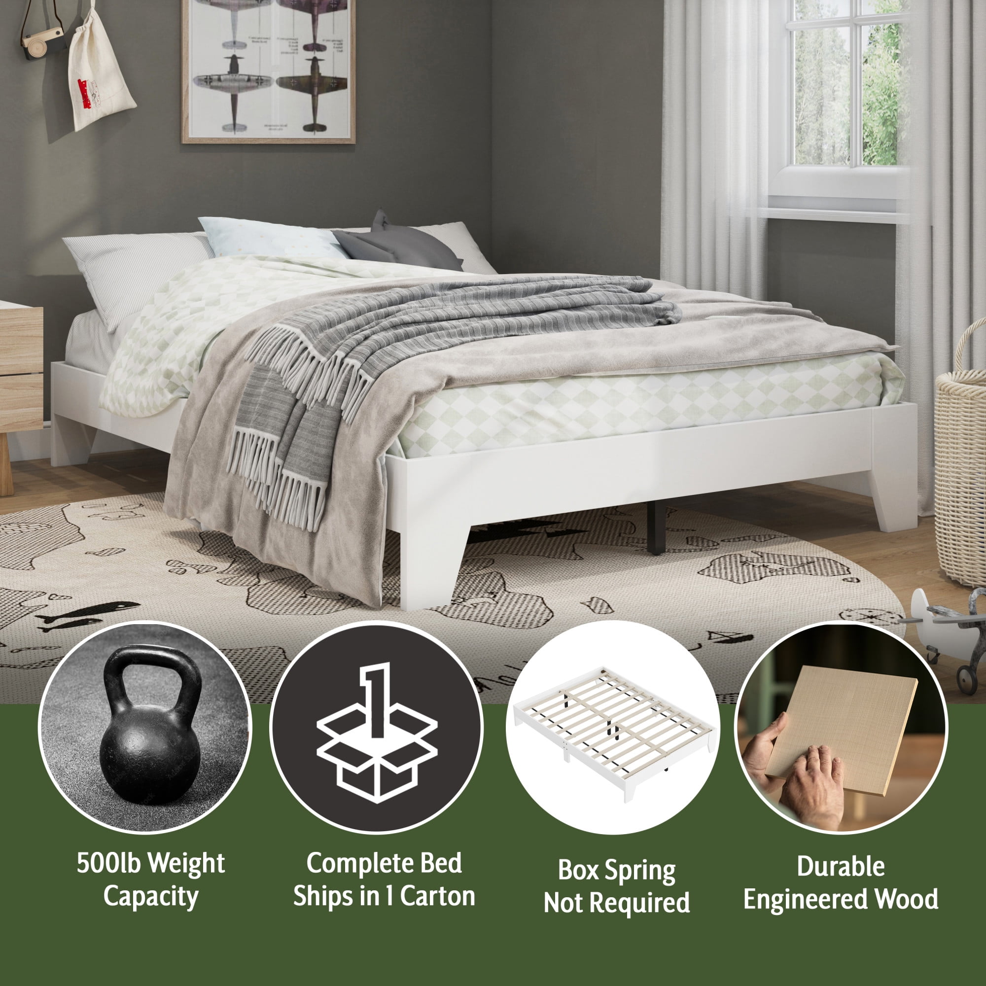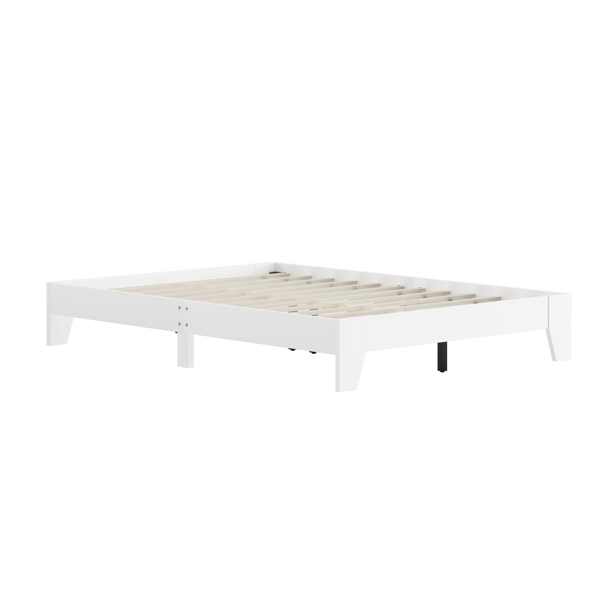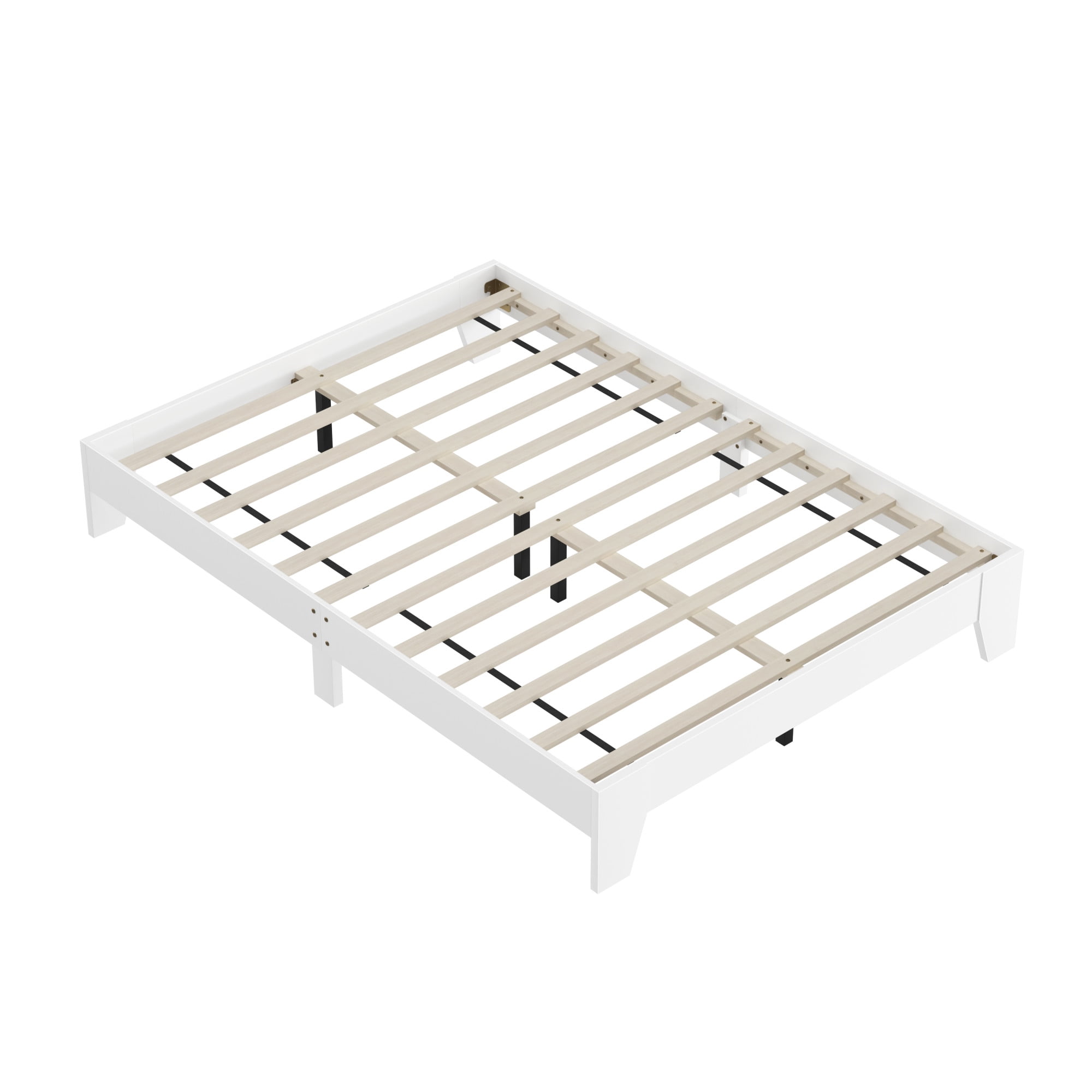 Hillsdale casual full bed frame with no headboard in a white finish Platform bed with slats sits low to the floor Constructed with sturdy wood for durable usage Overall Dimensions: 11.75H x 56.5W x 78D Assembly required Item will ship in one box Recommended weight limit: 250lbs For residential use only Wipe clean with dry cloth No box spring required