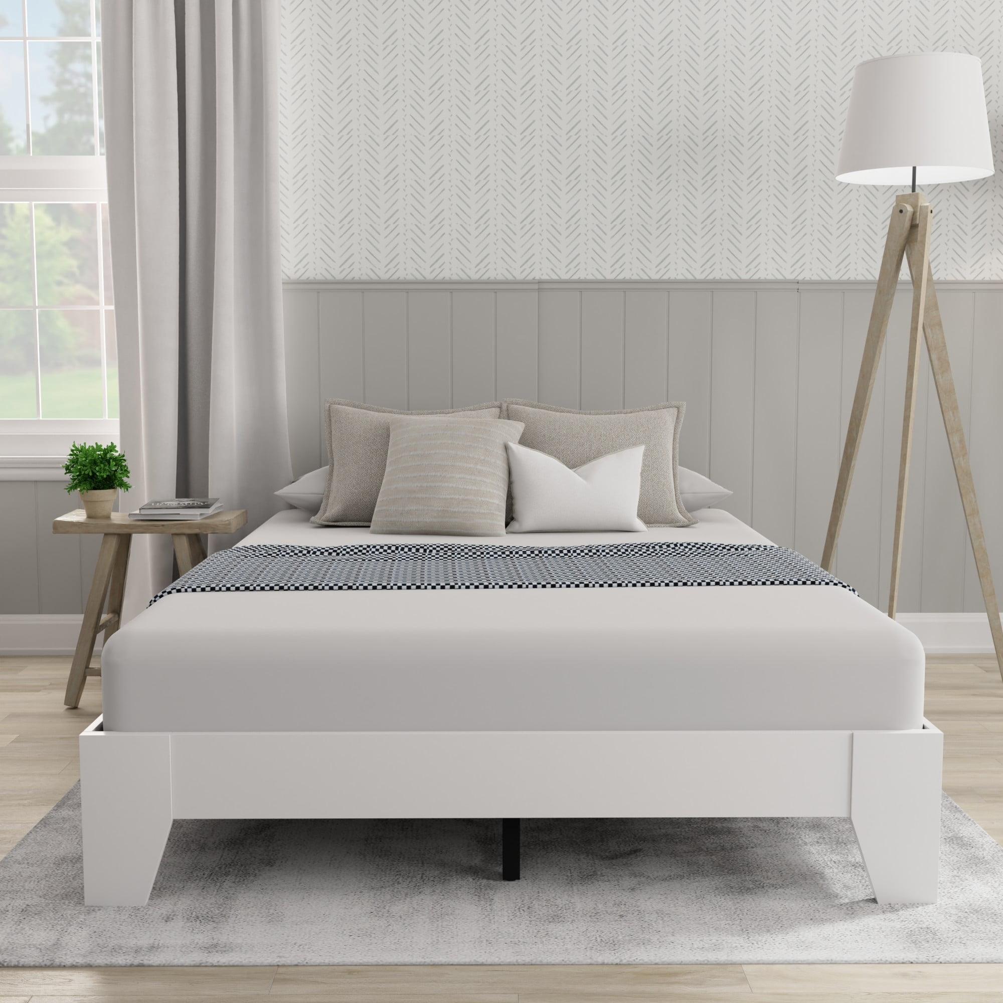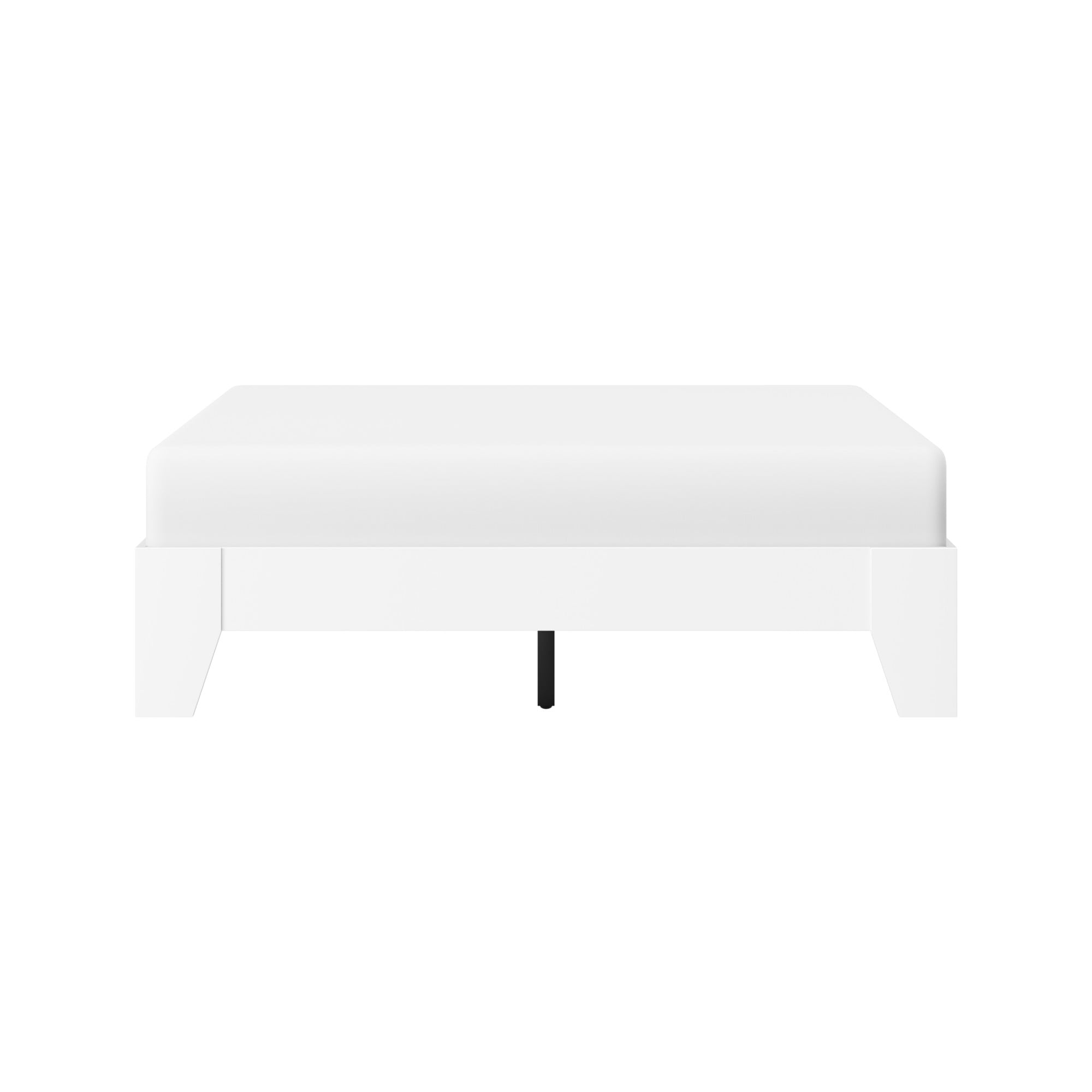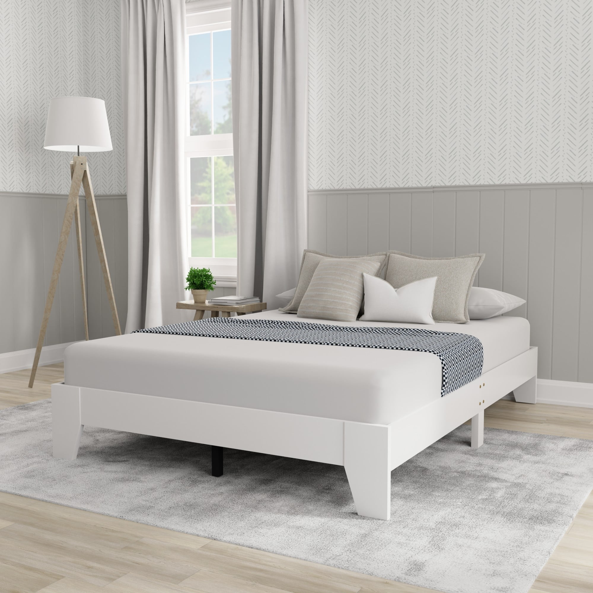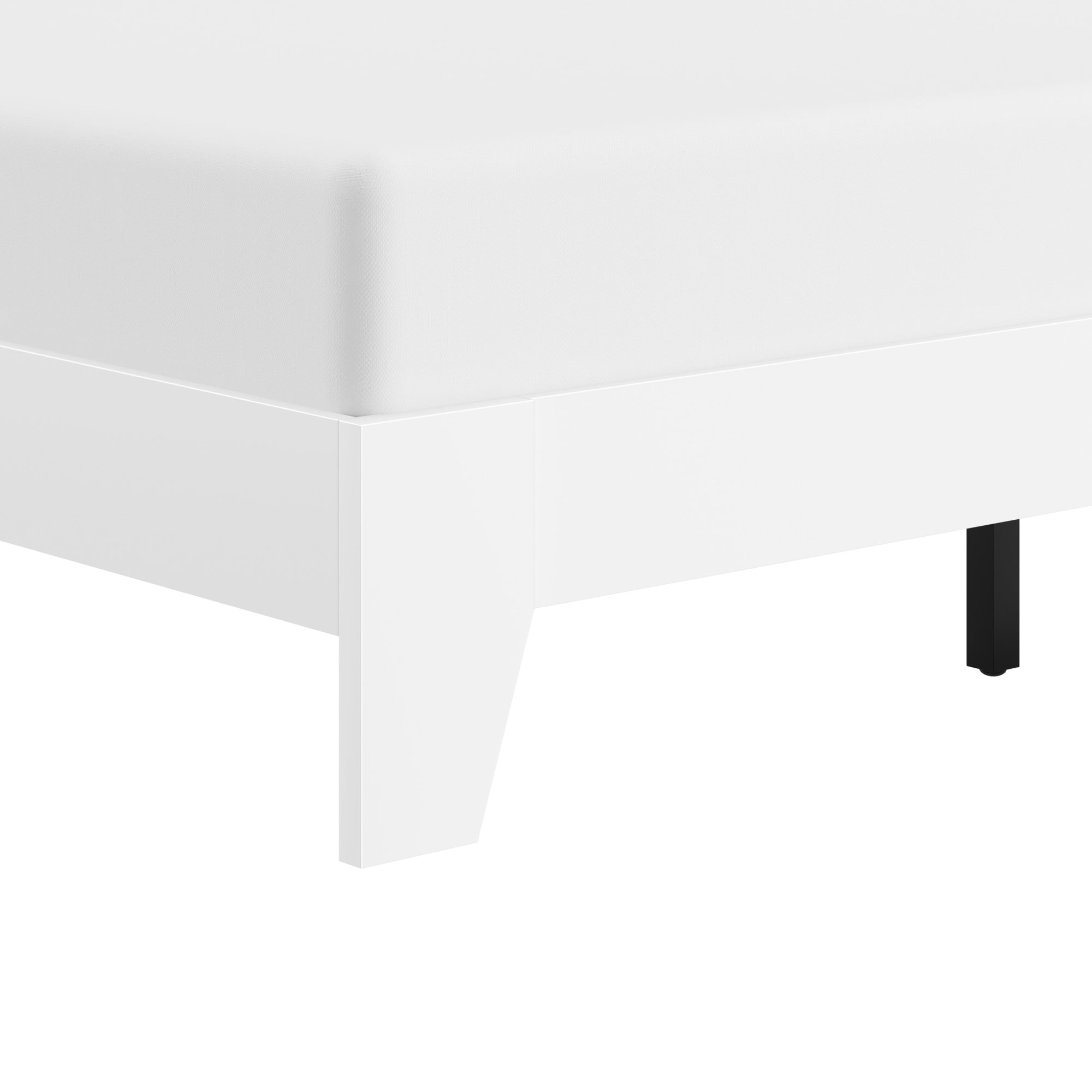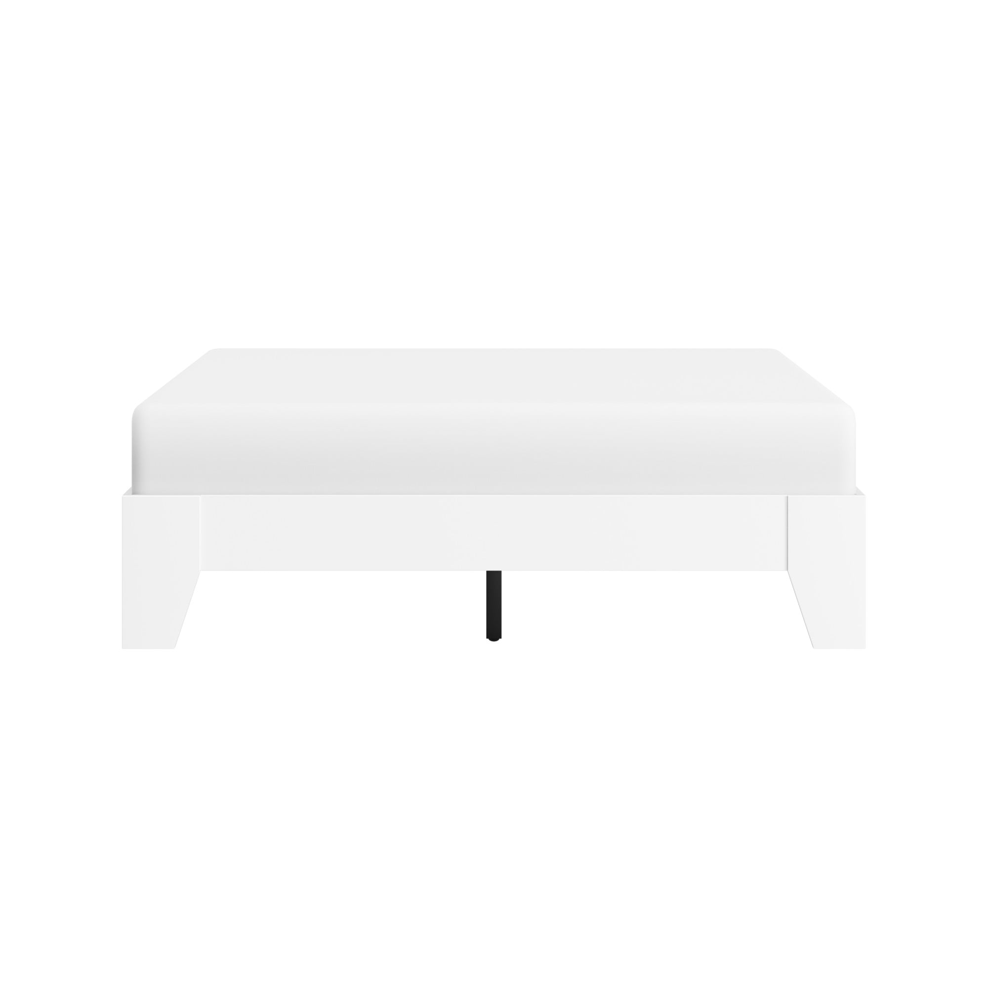 Hillsdale casual full bed frame with no headboard in a white finish Platform bed with slats sits low to the floor Constructed with sturdy wood for durable usage Overall Dimensions: 11.75H x 56.5W x 78D Assembly required Item will ship in one box Recommended weight limit: 250lbs For residential use only Wipe clean with dry cloth No box spring required