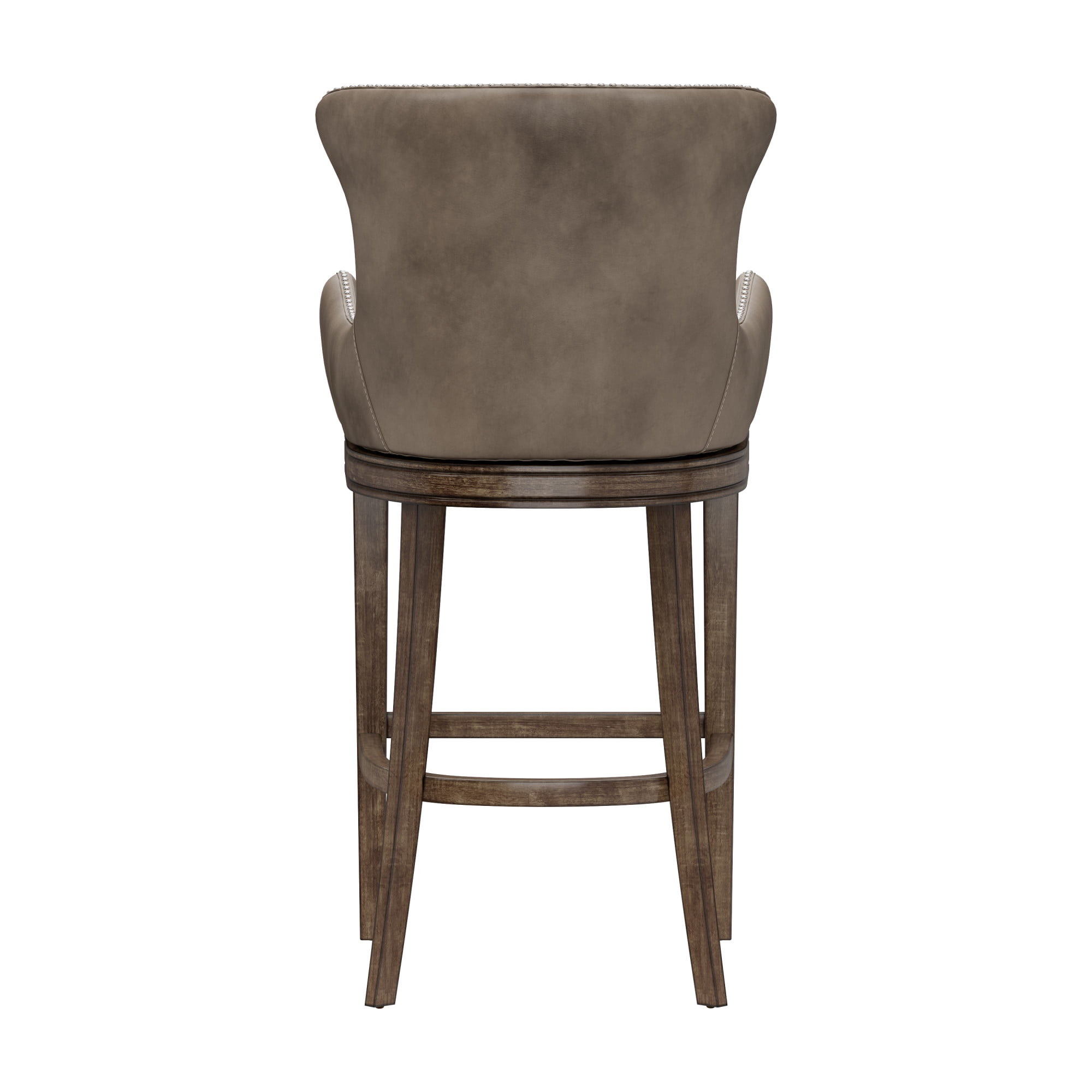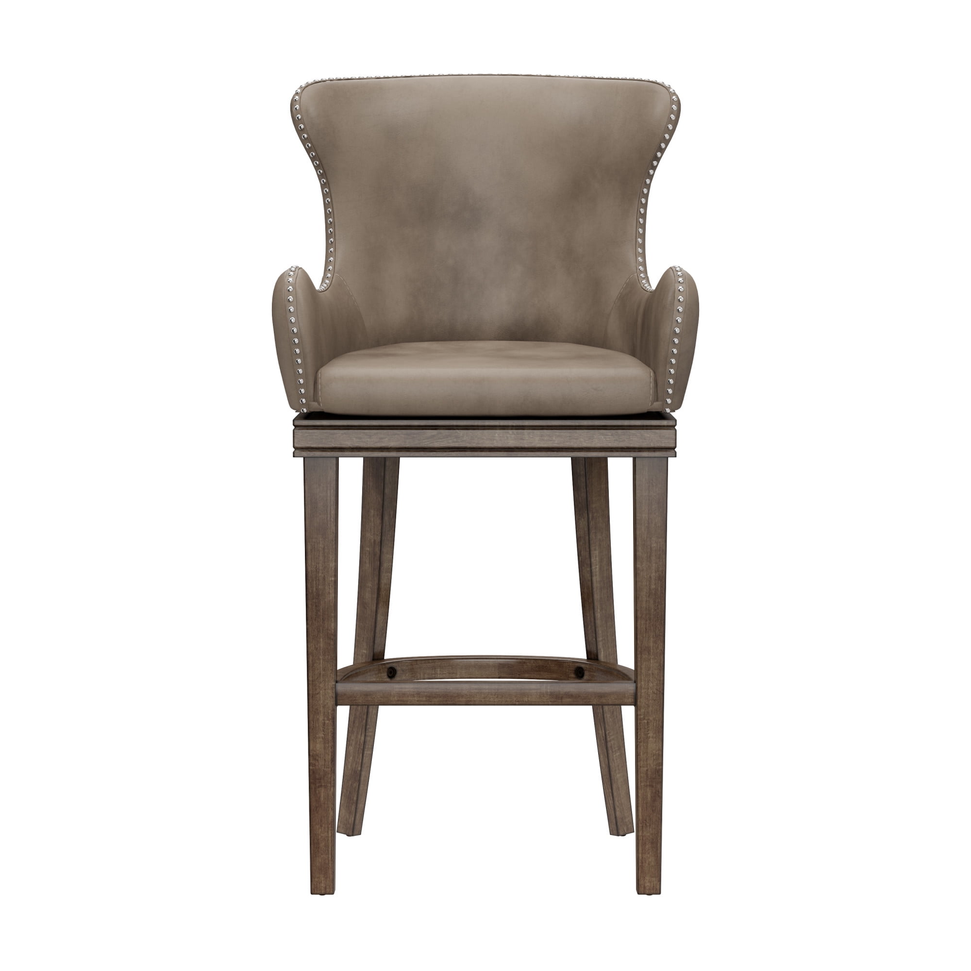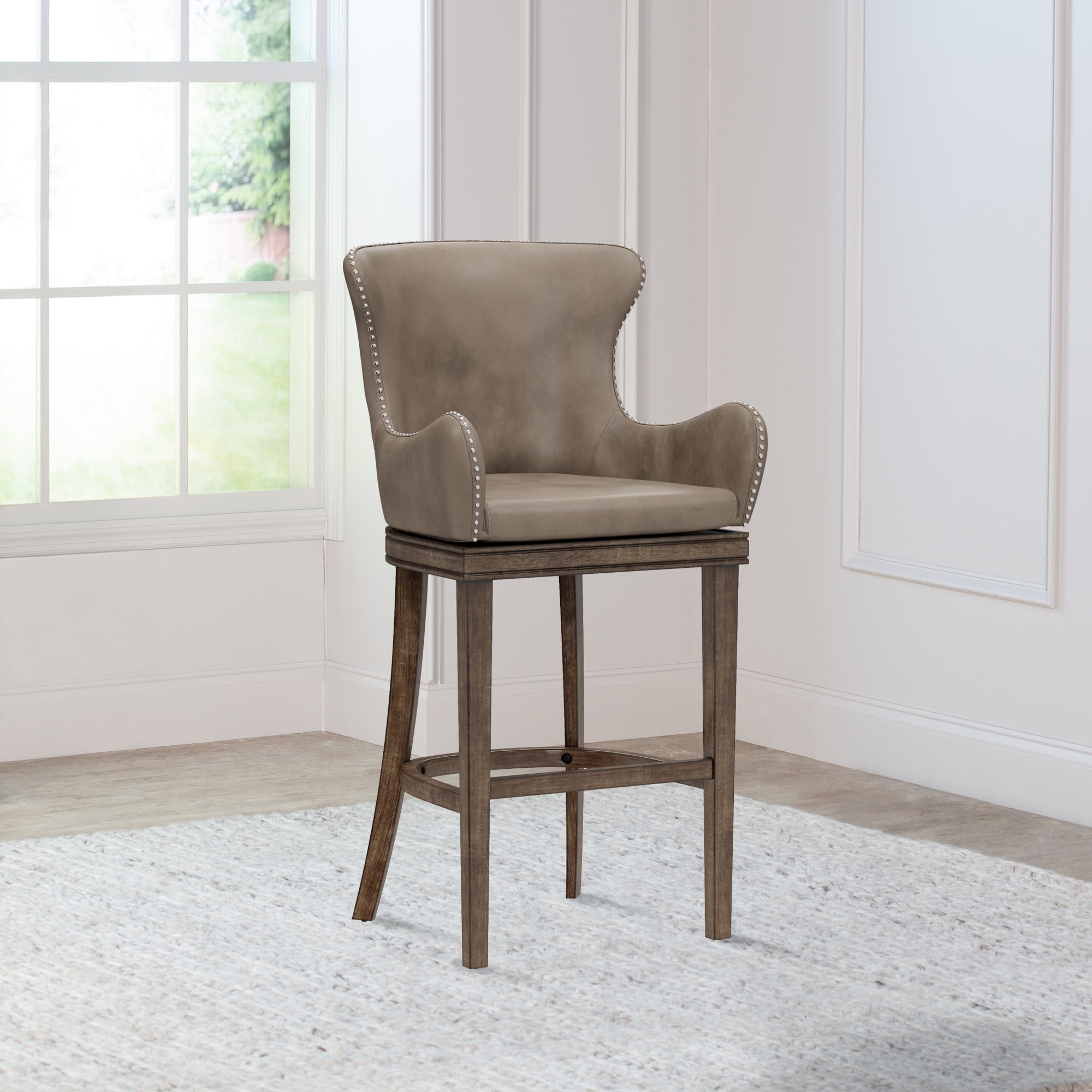 Traditional style memory return wood bar height stool with a classic wingback design Rustic Gray wood bar stool with wingback design, featuring weathered taupe faux leather upholstery and nail head trim The classic stool features a 180 degree memory return Overall Dimensions: 44.25H x 23W x 22.5D; Seat Height: 30H; Seat Dimensions: 19W x 17D Assembly required Crafted from Rubberwood hardwood and 100% polyurethane Bar stools work best with counters or bars that are 40-44 inches in height Recommend Weight Limit: 250 lbs. Item Ships in One Box Dust and polish with non-abrasive cleaners as needed