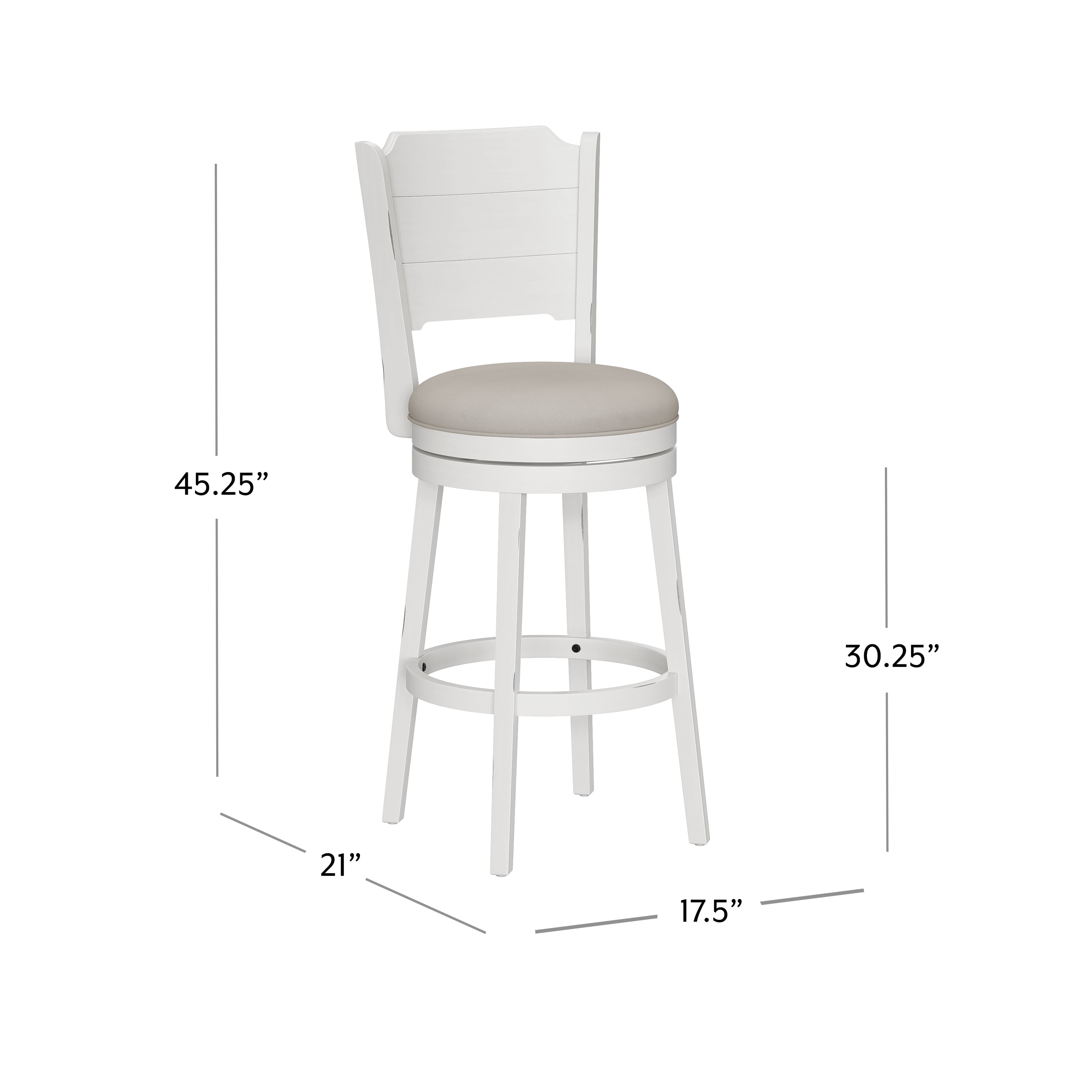 Charming wood swivel bar height stool with slat back design Sea White wood bar stool with slat back, featuring Fog Gray upholstery with welt piping trim and 360° swivel seat The round 360 degree swivel seat is upholstered in a fog gray fabric Overall Dimensions: 45.25H x 17.5W x 21D; Seat Height: 30.25H; Seat Diameter: 17W Assembly required Crafted from Rubberwood hardwood, manufactured wood and 100% polyester upholstery Bar stools work best with counters or bars that are 40-44 inches in height Recommend Weight Limit: 250 lbs. Item Ships in One Box Dust and polish with non-abrasive cleaners as needed