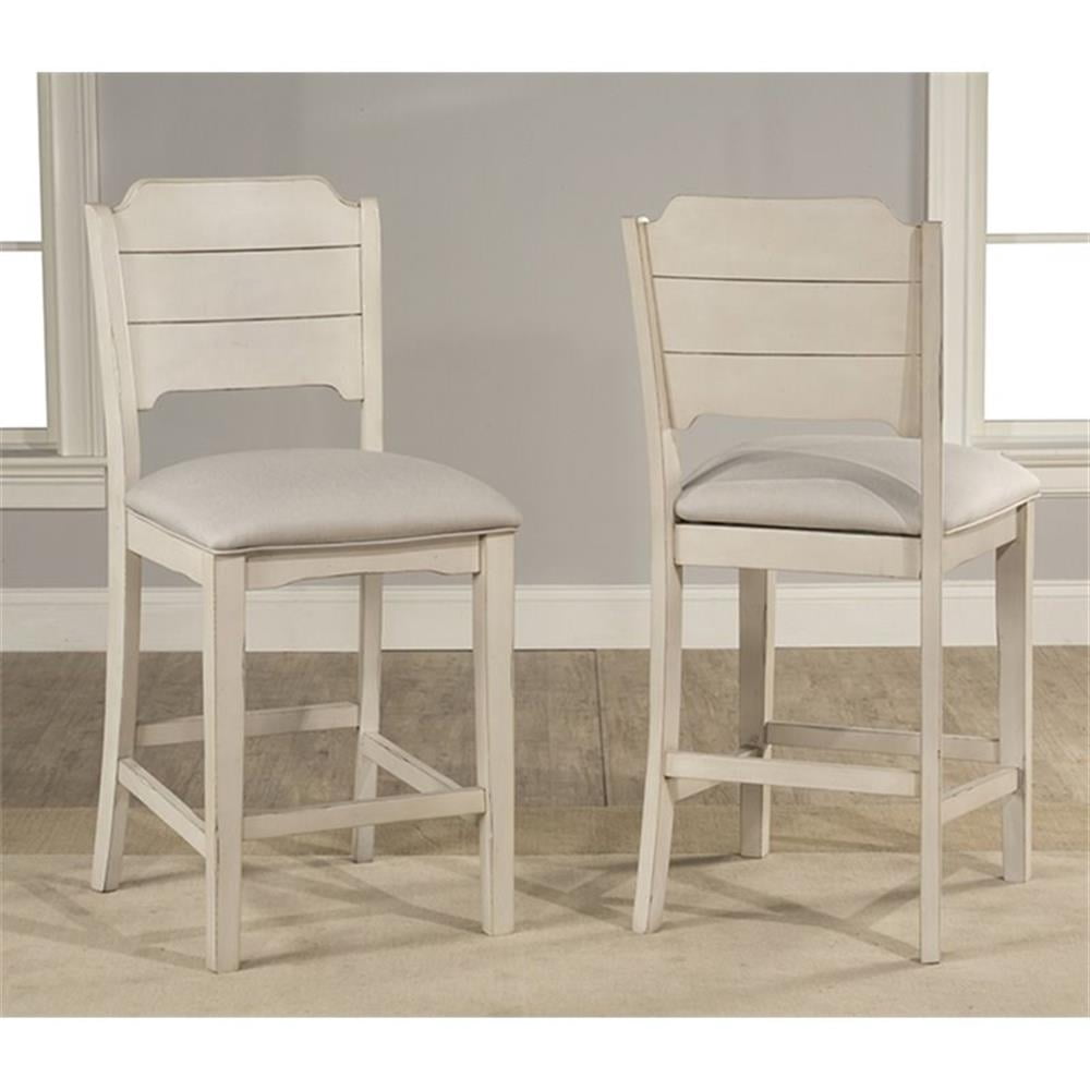 A modern farmhouse classic, Hillsdale Furniture’s Clarion non-swivel wood, planked back, counter stools are the perfect solution for your transitional or cottage decor. Constructed of wood and painted in a sea white with a versatile fog upholstered seat, the Clarion chairs are highlighted by casual elegance, clean lines, and a fresh finish combination. Ideal for an eat in kitchen or dining room, these stools will compliment any transitional decor to create a cool, casual and comfortable look. Shipped in sets of two, these chairs are composed of hardwood, wood composites, and veneers, and assembly will be required.