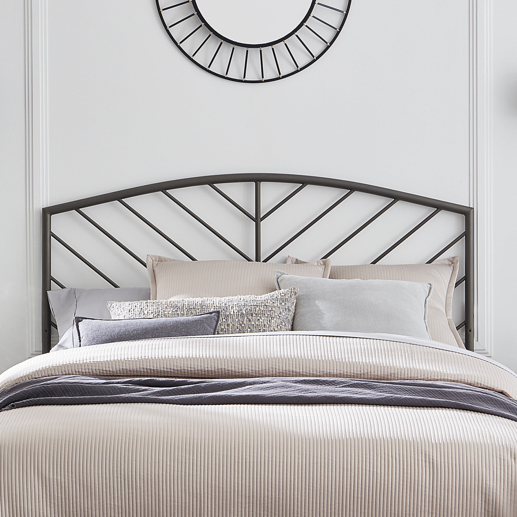 Chic modern queen-size arched headboard with chevron spindles Gray bronze finish lends an antique feel to a modern silhouette Durable fully welded metal construction ideal for daily use or your guest room Headboard Dimensions: 51.25H x 60.75W x 1.25D Assembly required Headboard will ship in one box Includes headboard only; frame, box spring and mattress required, not included Wipe clean with dry cloth Traditional design with a touch of modern flair complements any décor For residential use only