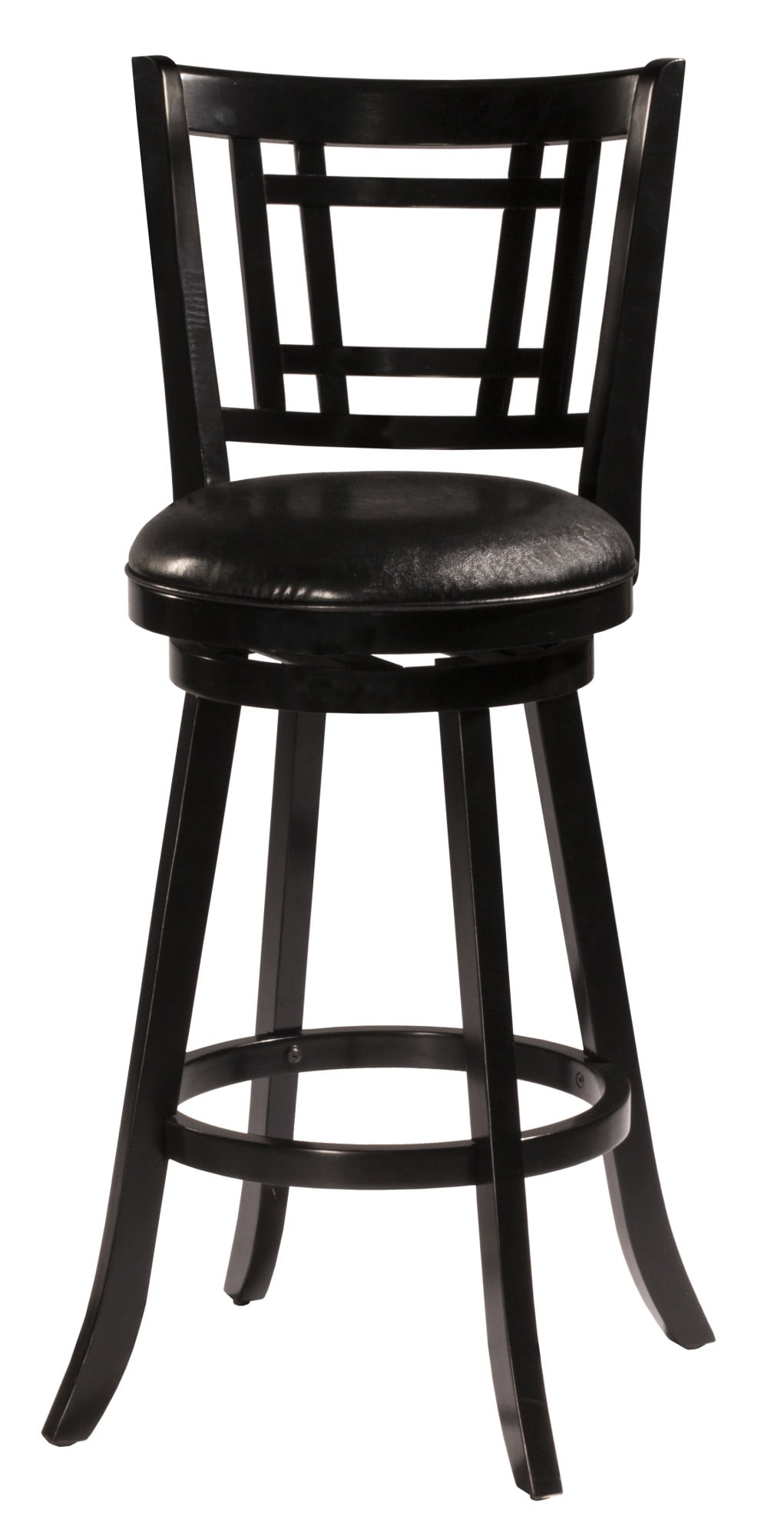 Casual bar height swivel stool with rectangular lattice chairback design Padded 360 degree round swivel seat covered in black faux leather upholstery Classic silhouette with solid rubberwood construction in a bold black finish Overall Dimensions: 43.5H x 18.5W x 20D; Seat Height: 30.5H Assembly required Ships one stool in one box Works best with counters or bars that are 40-44 inches in height Spot or wipe clean Recommended weight limit: 250lbs For residential use only