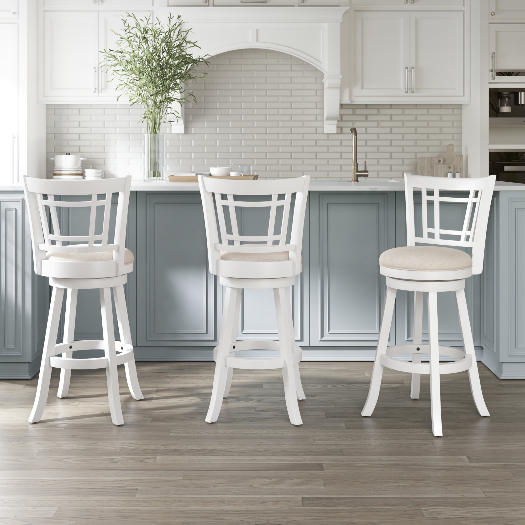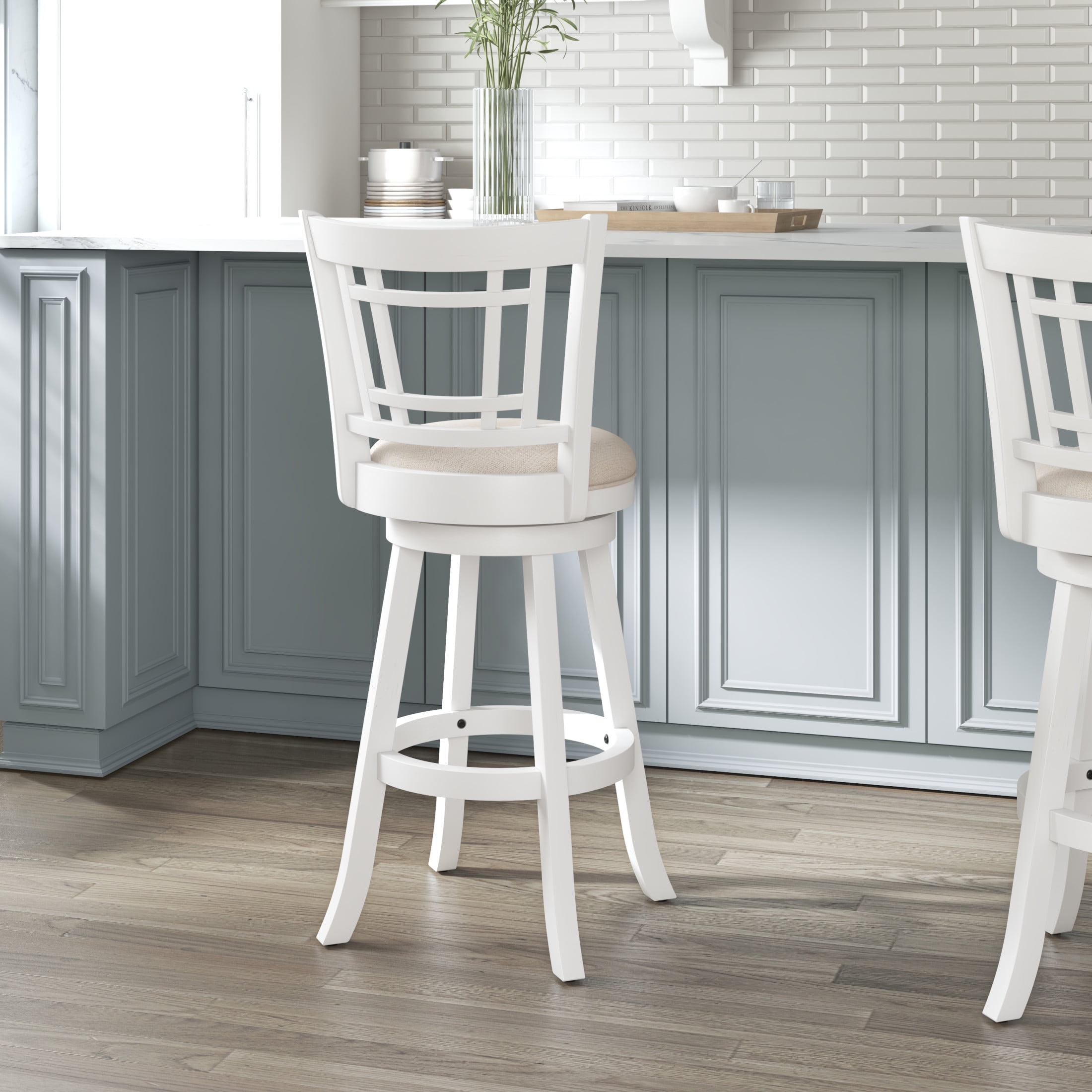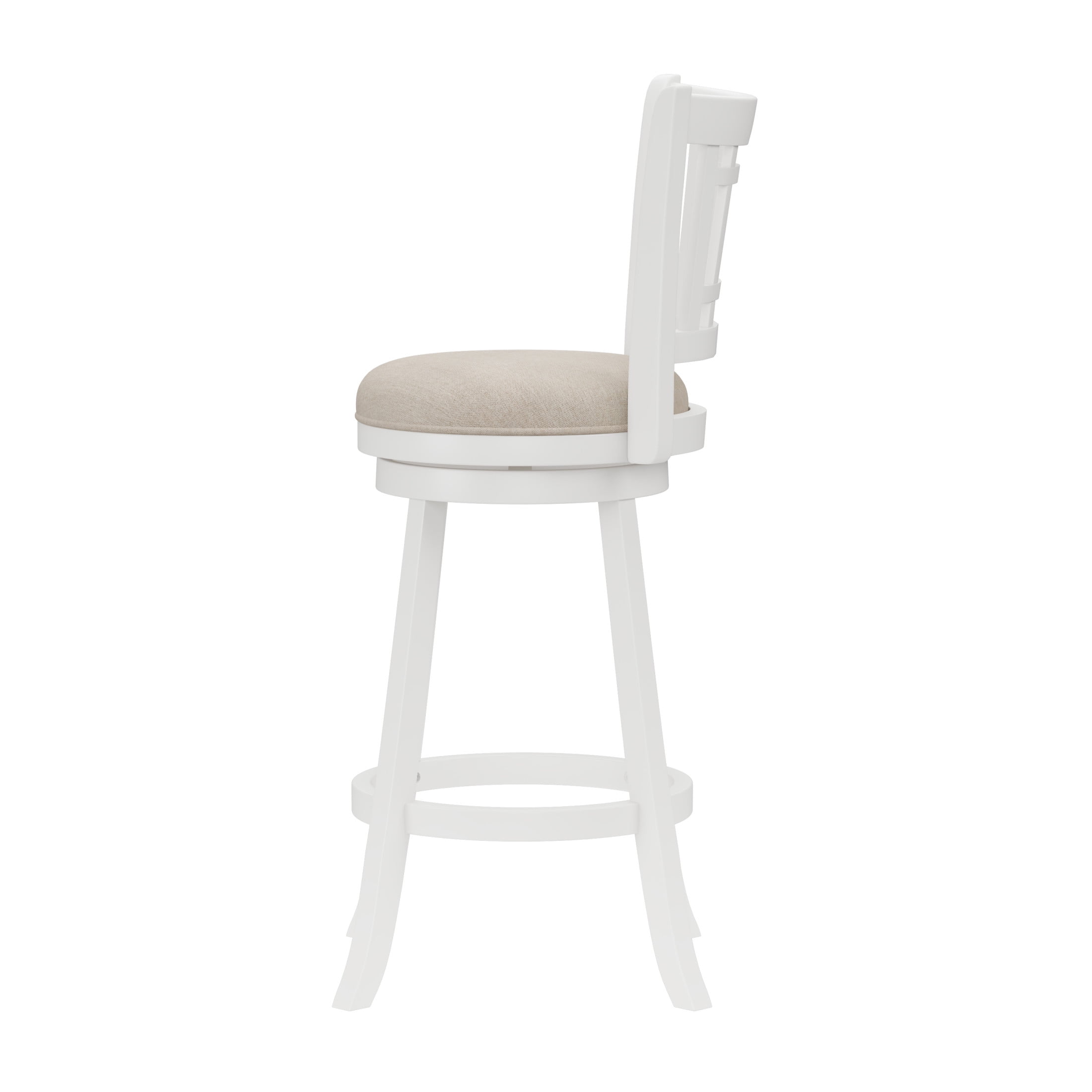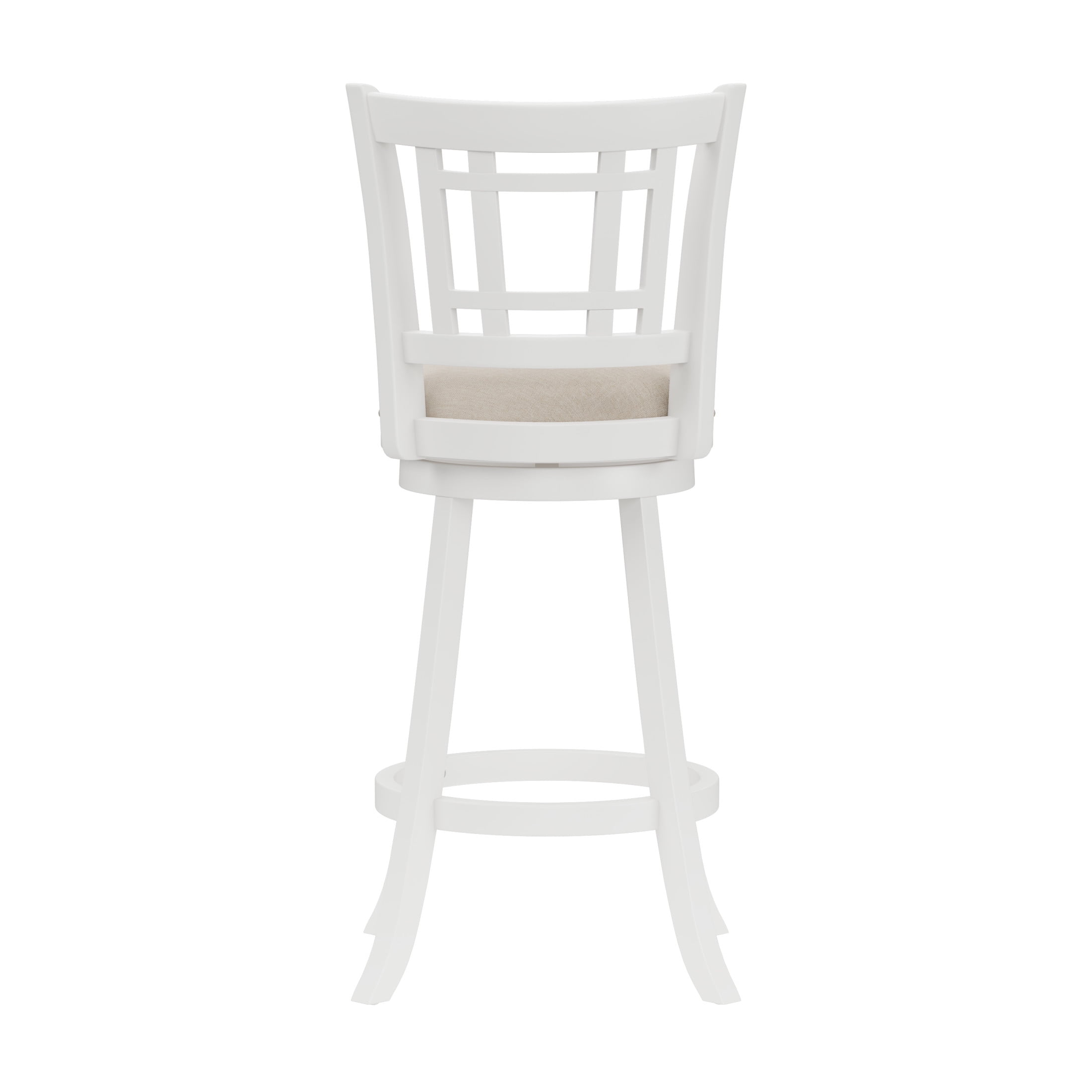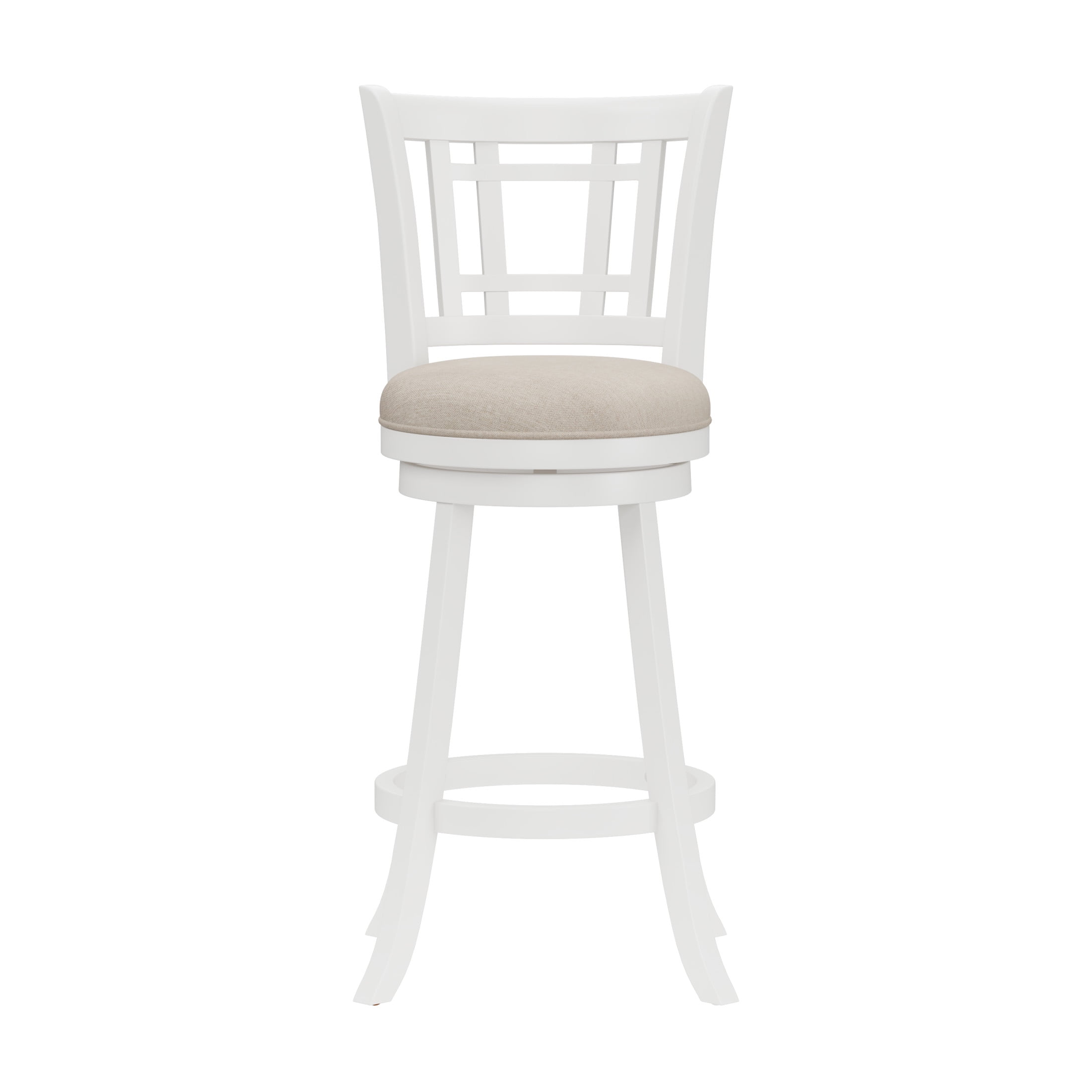 Casual bar height swivel stool with rectangular lattice chairback design Padded 360-degree round swivel seat upholstered in 100% polyester light beige fabric Classic silhouette with rubberwood, MDF construction in a white finish Overall Dimensions: 43.5H x 18.5W x 20D; Seat Height: 30.5H Assembly required Ships one stool in one box Complements any casual interior décor Spot or wipe clean 250 Lb. Recommended weight capacity For residential use only