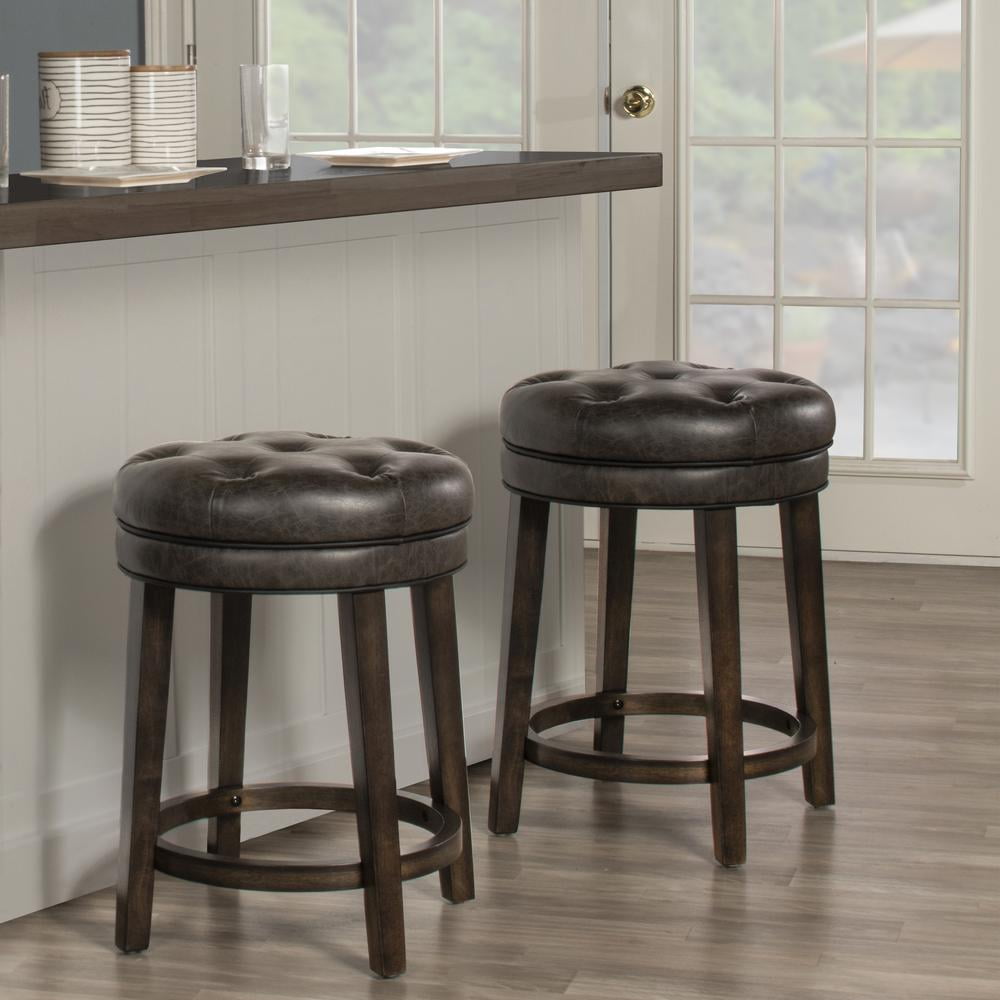 Sharing stories and making new memories seated together at a bar top with family and friends is a timeless experience. And with this backless wood Bar Stool, what you’re seated on is just as timeless. Crafted with clean, classic lines, this bar stool features a wooden base in a dark brown finish, plus a tufted, 360-degree swivel seat upholstered in charcoal gray faux leather that gives this piece a traditional-yet-modern monochromatic touch—allowing it to be versatile enough for many types of dining and entertaining spaces for years to come. Assembly required.