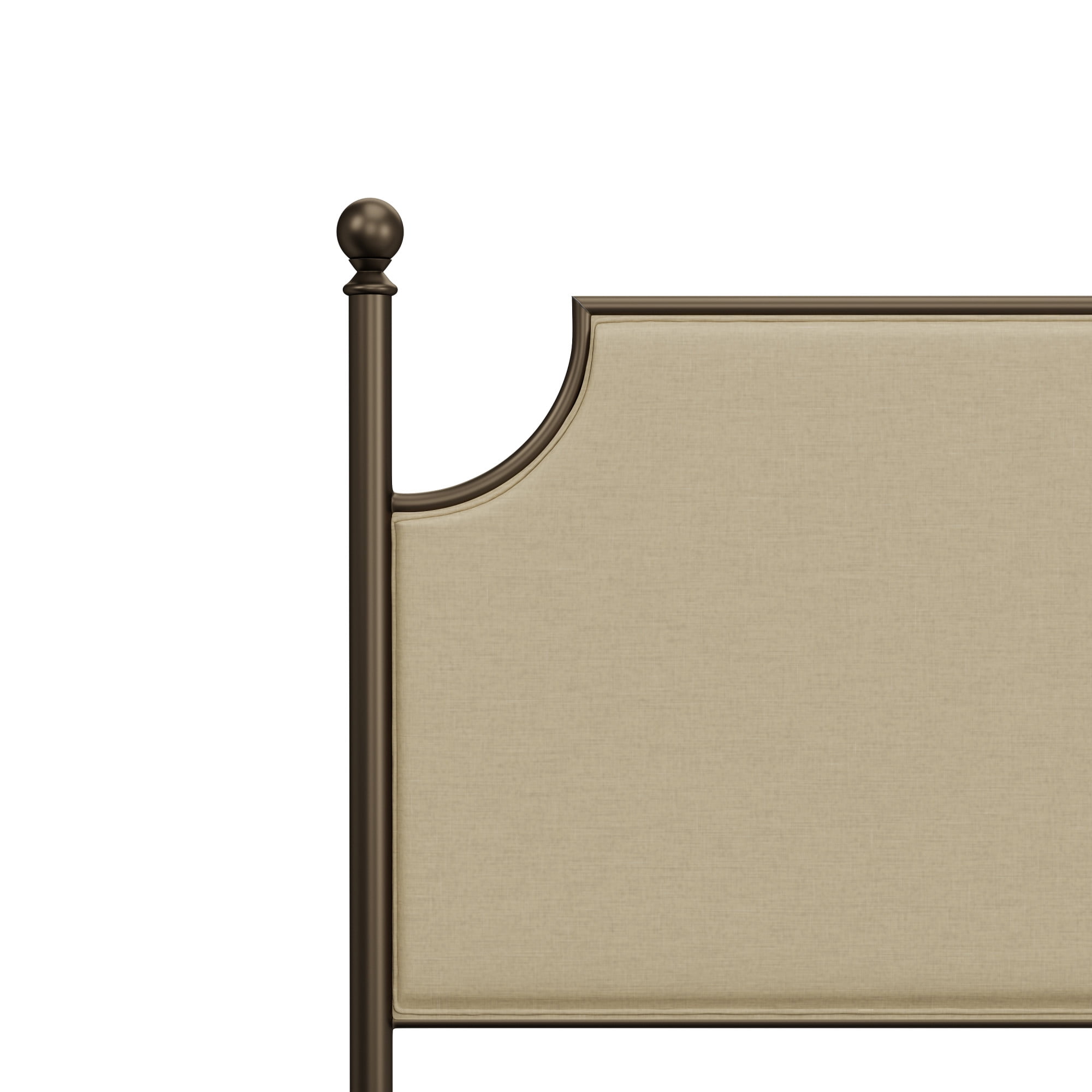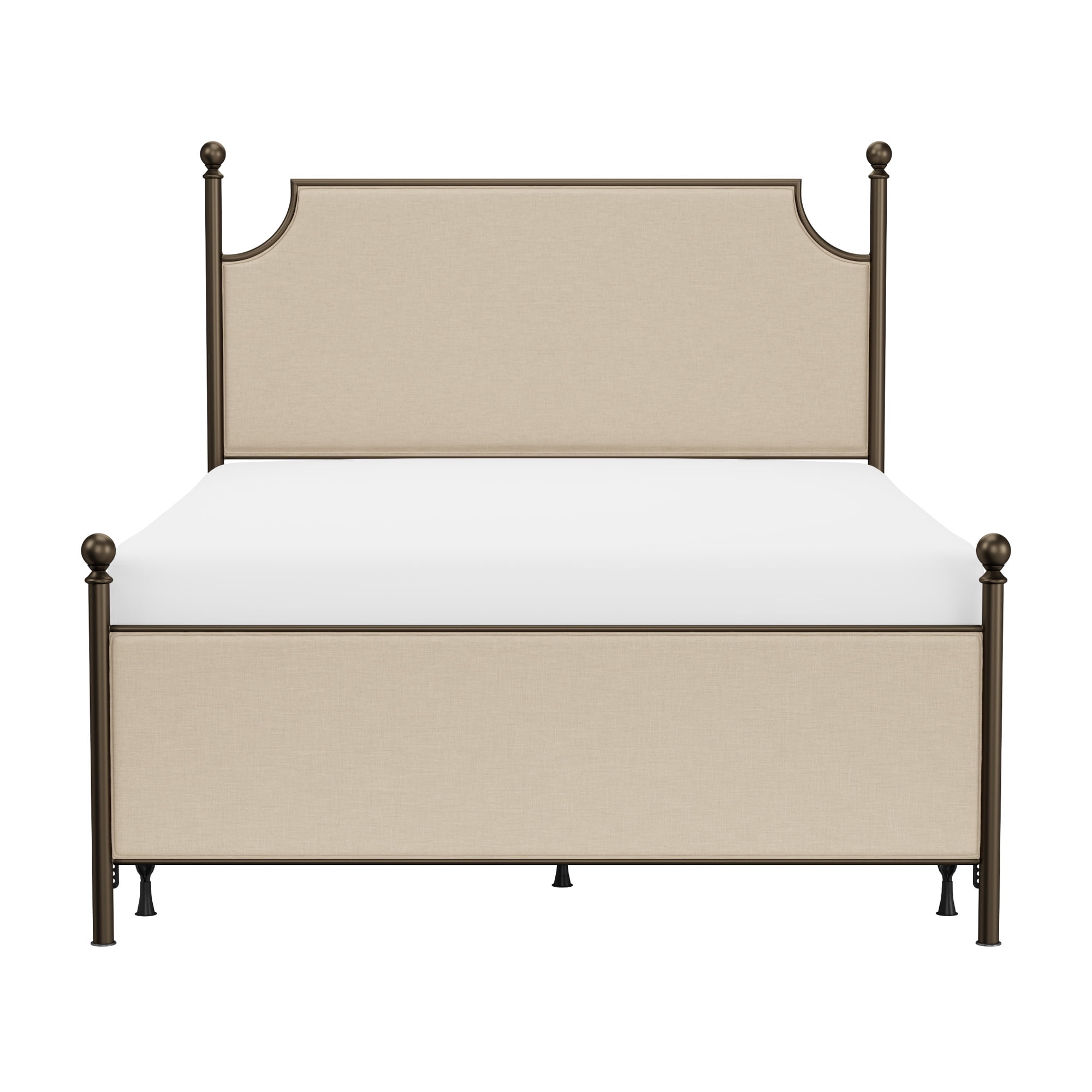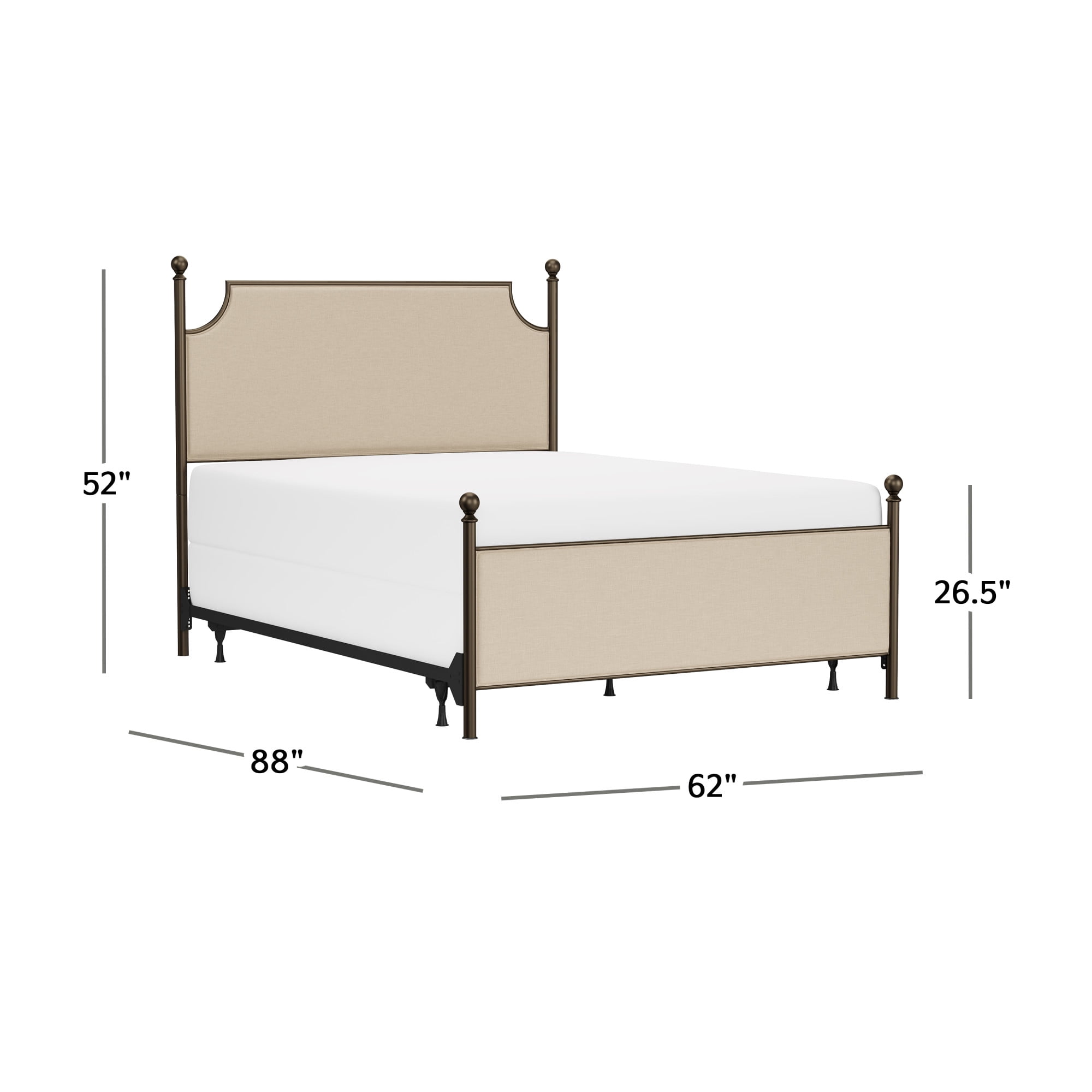 Elegant and Romantic Queen bed with upholstered panels featuring subtle arches and a metal post frame with accenting finials The Bronze metal frame perfectly compliments the Linen Stone fabric Includes Headboard, footboard and bed frame; Box spring and Mattress required; not included Overall Dimensions: 52 H X 62 W X 88 L; Footboard Height: 26.5H; Floor to Bottom of Frame: 7.5 H Assembly Required Constructed of metal and fabric Item will ship in two boxes; which may arrive separately Spot check fabric prior to cleaning Residential Use Only Recommended Weight Limit: 500 lbs