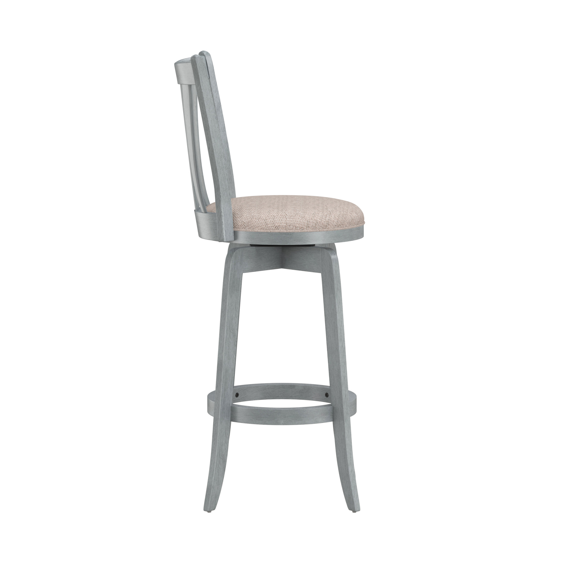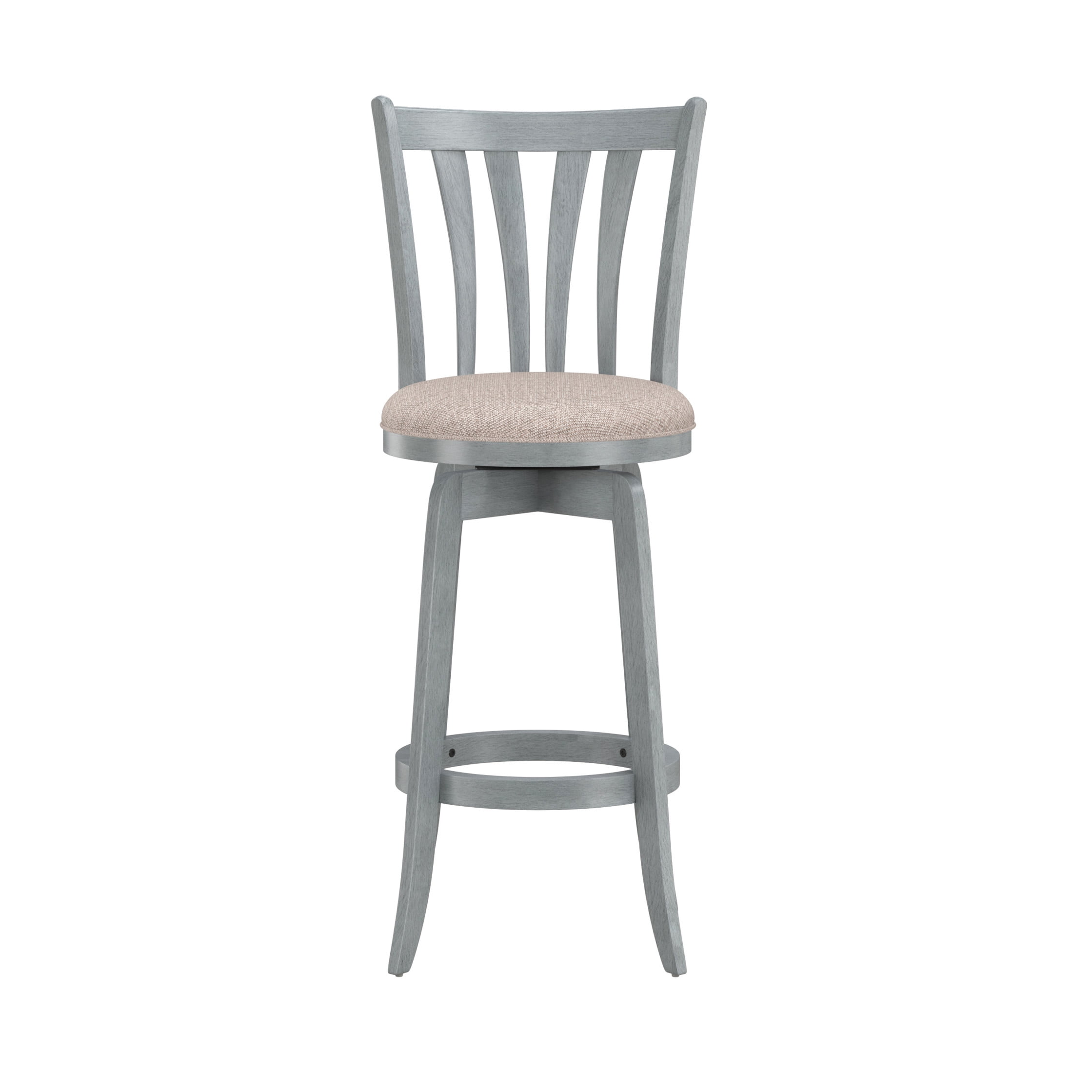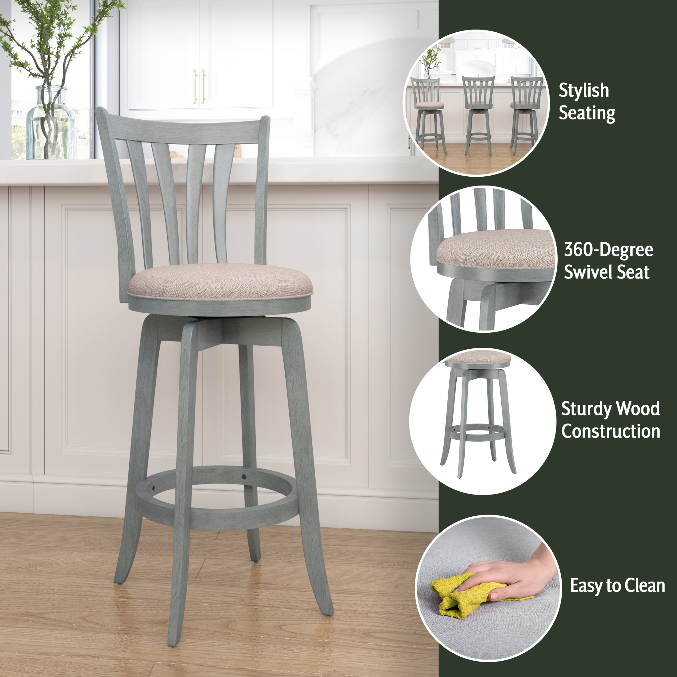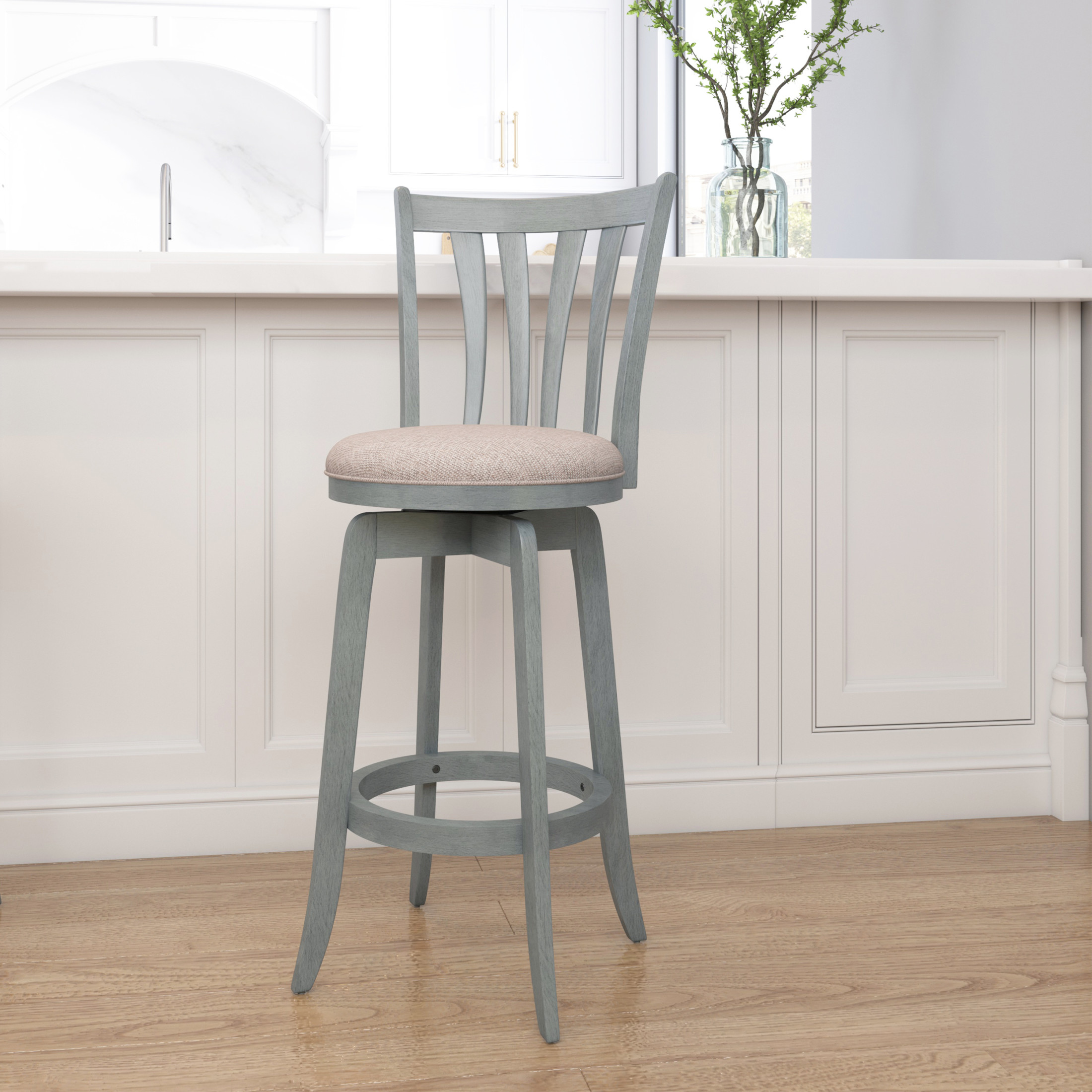 Curate an inviting entertainment space with this playful twist on a bar classic. The backrest of this bar-height swivel stool features a curved vertical slat design, complemented by flared legs to complete the look. Simple, yet refreshing, these stools add a touch of elegance to any casual home bar space. The 360-degree swivel seat adds functionality without compromising style, enveloped in a cream fabric to match the blue wire brush finish of the wood. The bar-height wood stool is a versatile addition to your home, requiring minimal maintenance and offering a casual transitional ambience. Assembly required.