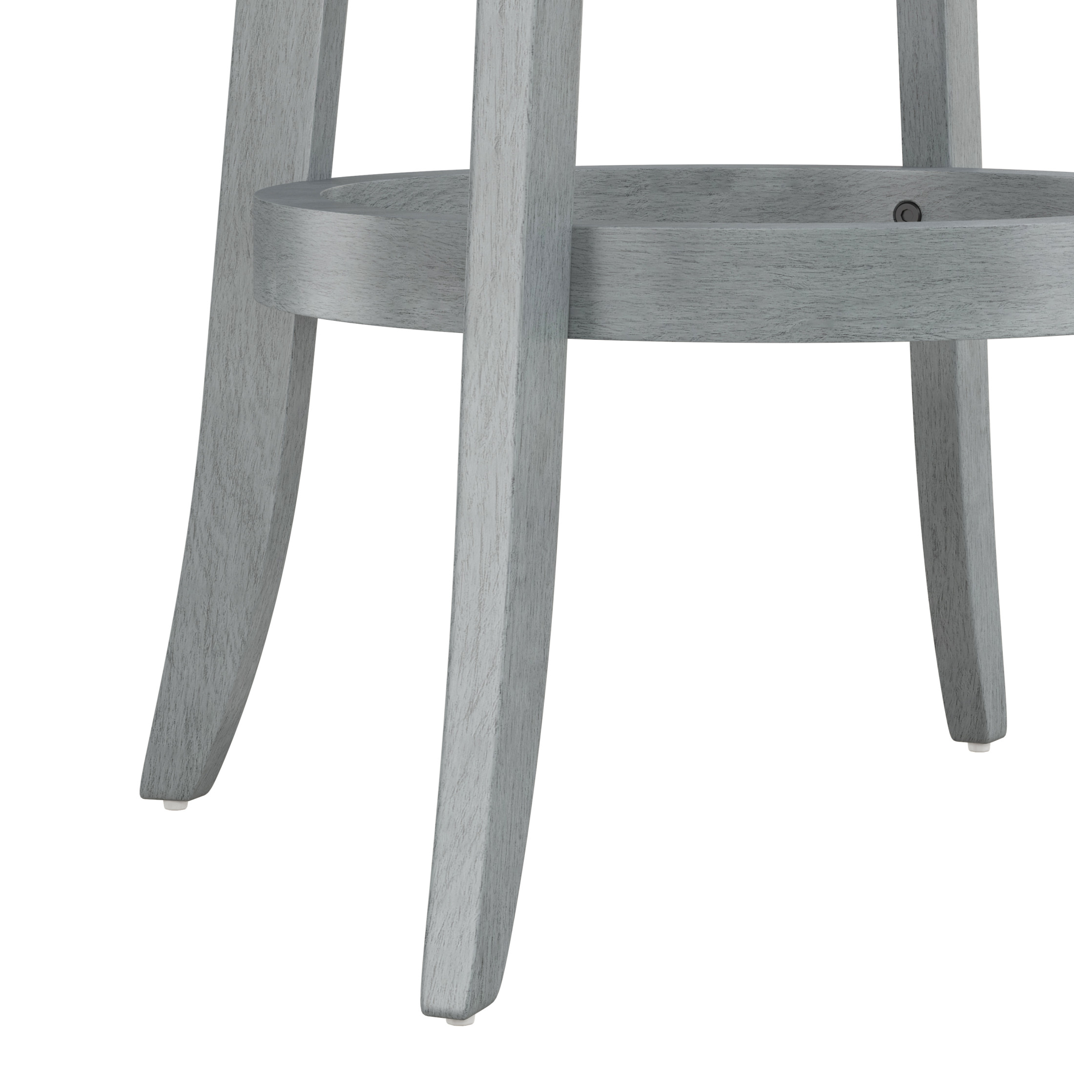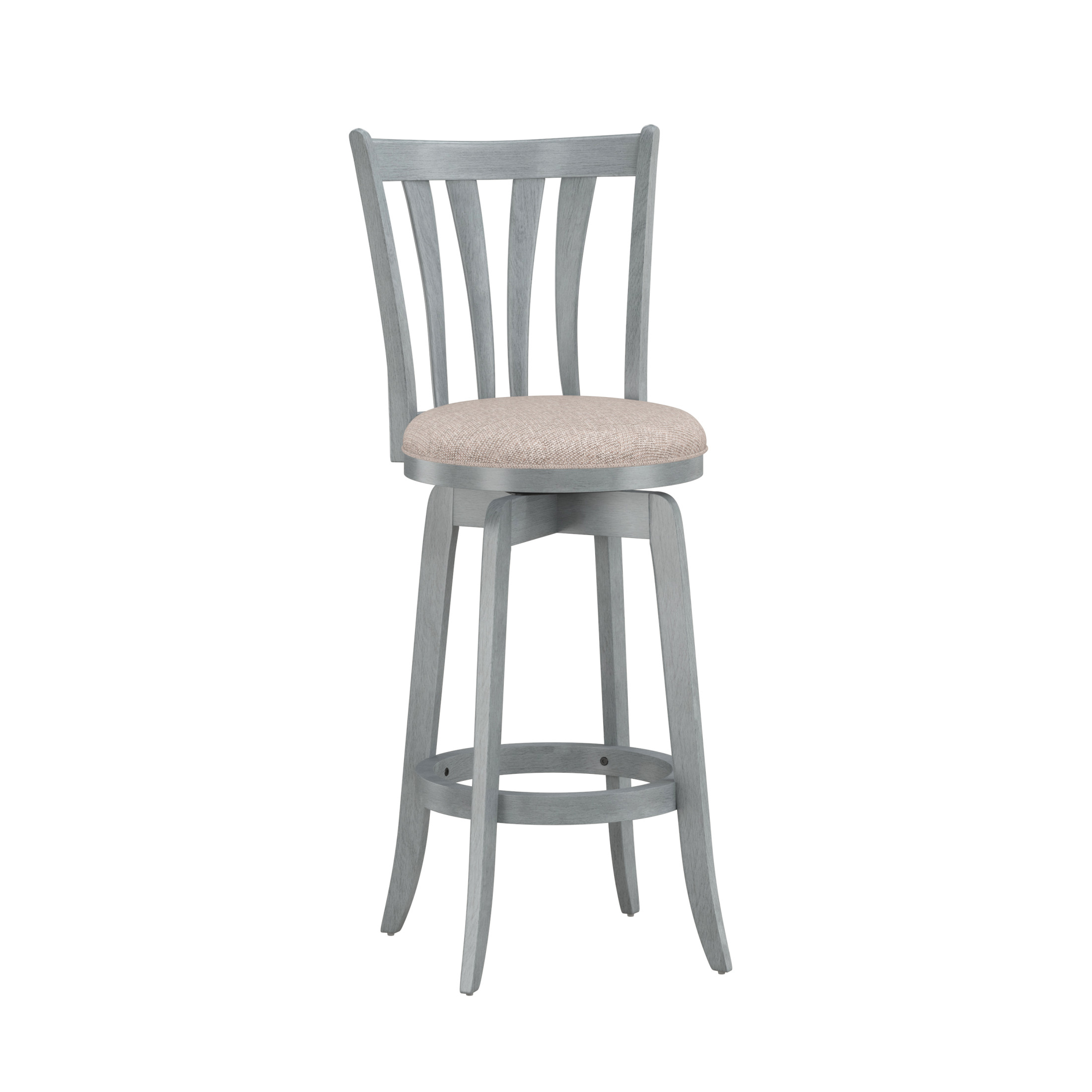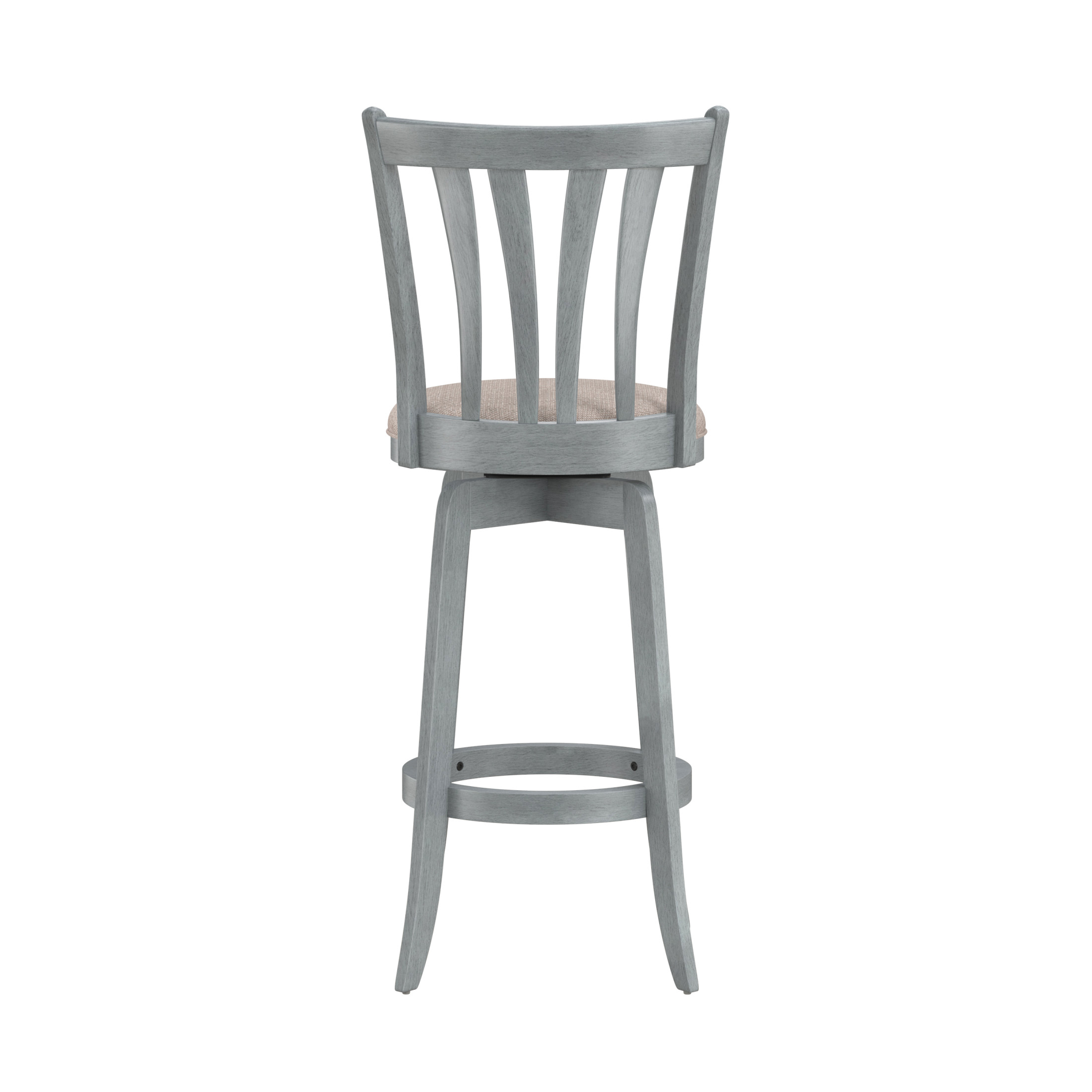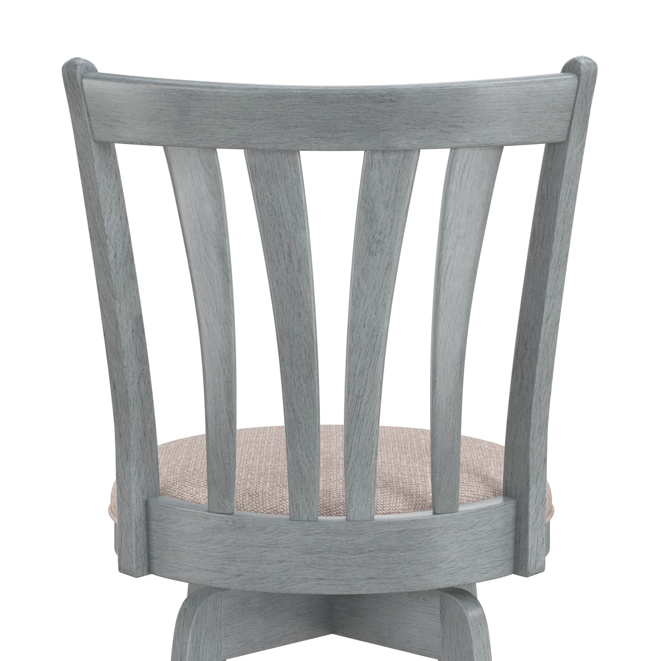 Curate an inviting entertainment space with this playful twist on a bar classic. The backrest of this bar-height swivel stool features a curved vertical slat design, complemented by flared legs to complete the look. Simple, yet refreshing, these stools add a touch of elegance to any casual home bar space. The 360-degree swivel seat adds functionality without compromising style, enveloped in a cream fabric to match the blue wire brush finish of the wood. The bar-height wood stool is a versatile addition to your home, requiring minimal maintenance and offering a casual transitional ambience. Assembly required.