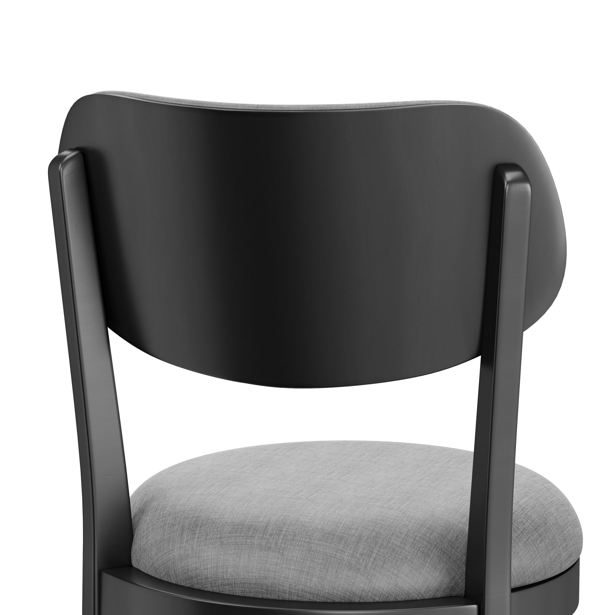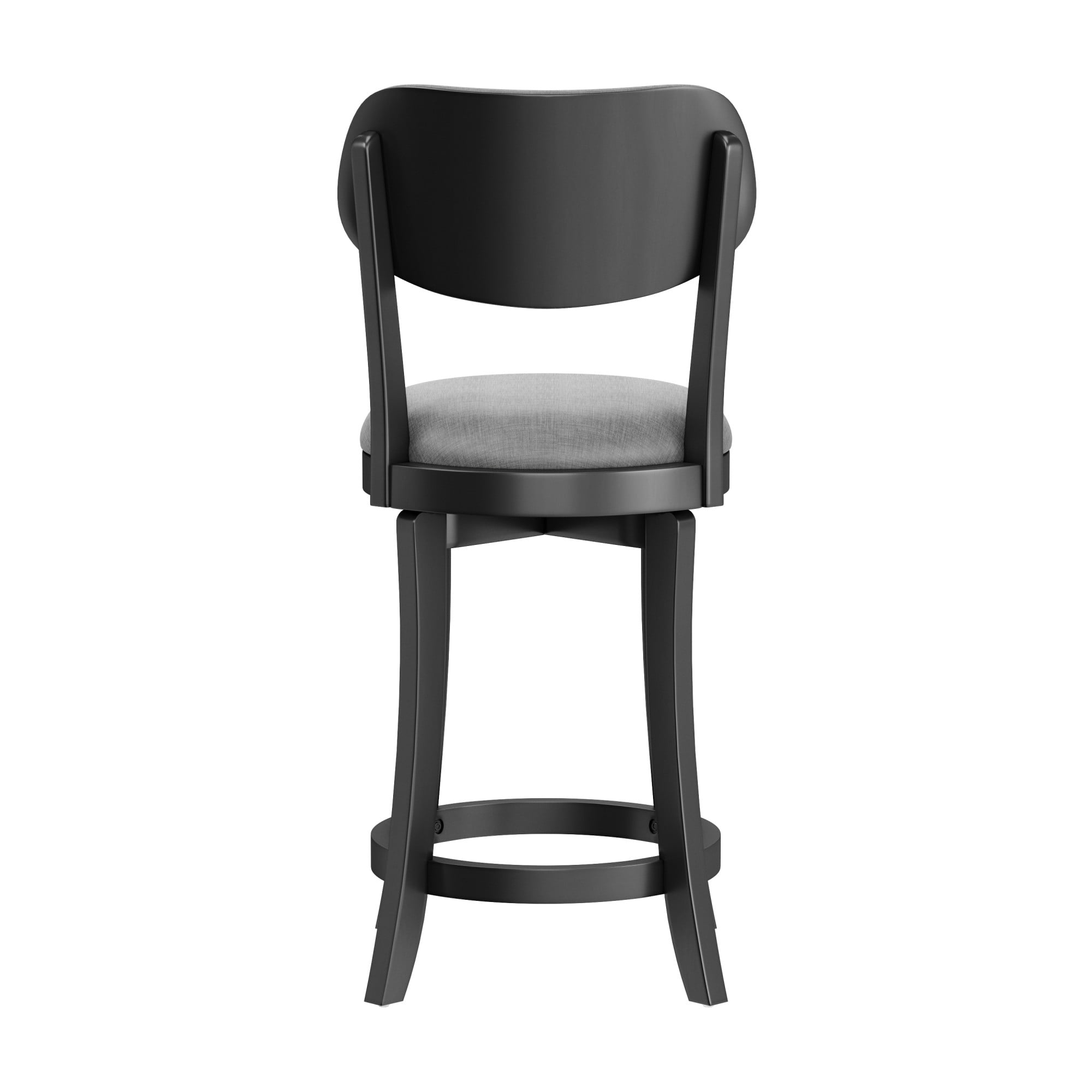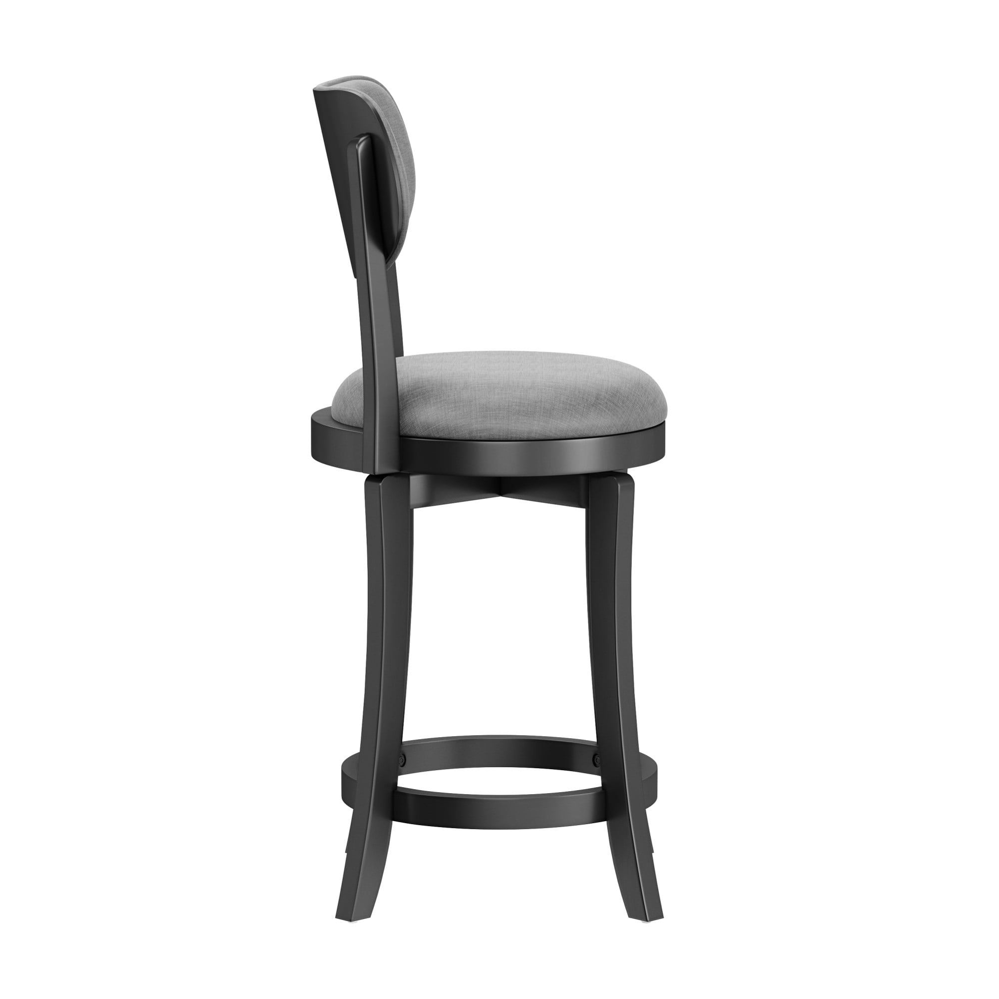 Casual wood swivel counter height stool with rounded upholstered back and seat The simple wood frame features a rich black finish The round 360 degree swivel seat is upholstered in a slate gray fabric Overall Dimensions: 38.25H x 20W x 17.5D; Seat Height: 25.5H Assembly required Ships one stool in one box Works best with counters or tables that are 34-38 inches in height Spot or wipe clean Recommended weight limit: 250lbs For residential use only