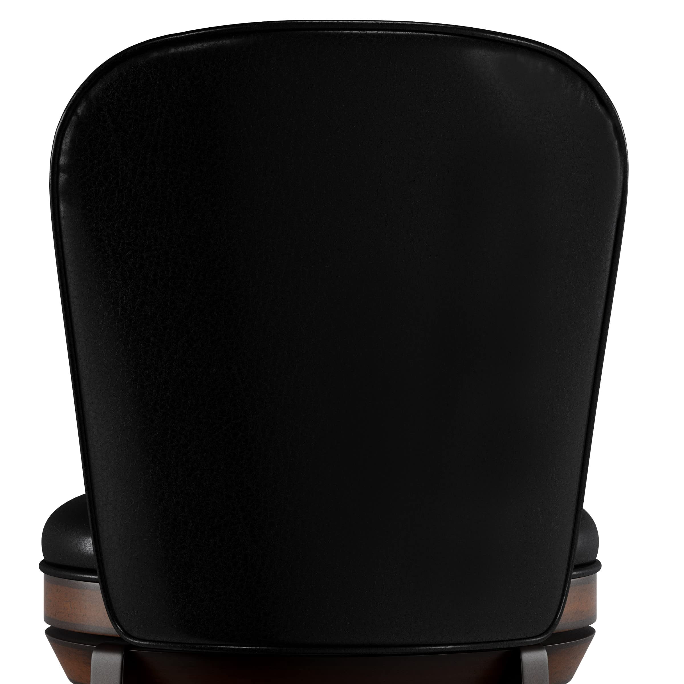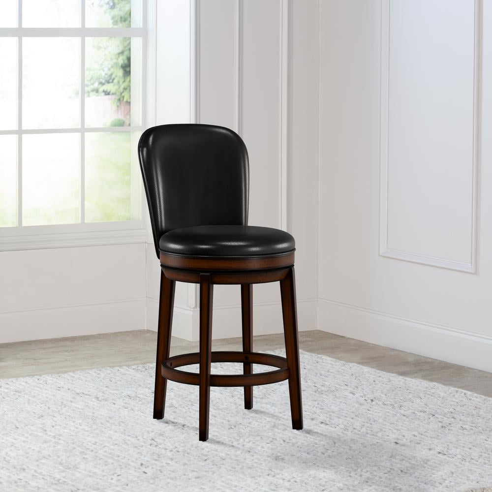 Transitional counter height stool in a dark walnut finish Swivel seat and back fully upholstered in black faux leather Constructed with rubberwood and plywood for durable usage Overall Dimensions: 42H x 19.5W x 23D; Seat Height: 26H Assembly required Ships one stool in one box Works best with counters or tables that are 34-38 inches in height Spot or wipe clean Recommended weight limit: 250lbs For residential use only