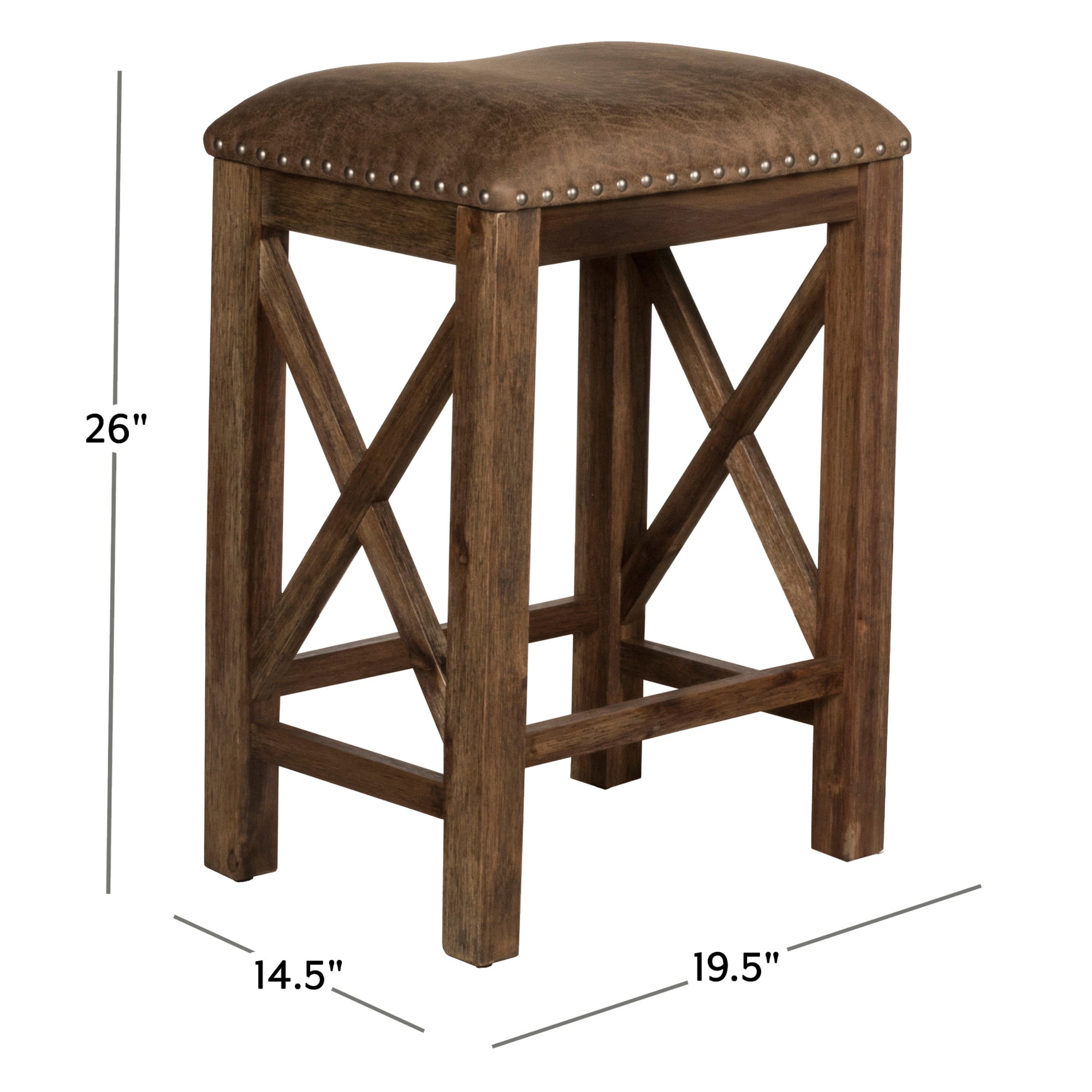 No one likes to eat, drink, and be merry alone. And with this set of two backless Counter Height Stools, you’ll always have an extra seat for company. Crafted from solid wood in a rustic antique walnut finish, the sides of these stationary stools have an X-design that adds visual appeal while providing reinforcement. And with plush seats covered in weathered brown faux leather and brass nail head trim, the rustic stool set gets an added touch of farmhouse flair to give them that best-of-both-worlds quality. Assembly required. Features: Set of 2 rustic counter stools in an antique brown finish Backless with saddle seats in weathered brown faux leather Constructed from durable acacia wood for long-lasting use Overall Dimensions: 26H X 19.5W X 14.5D Assembly Required Two stools ship in one box Works best with counters or tables that are 34-38 inches in height Spot or wipe clean Recommended weight limit: 250lbs For residential use only Specifications: Product Dimensions: 26″H x 19.5″W x 14.5″D Product Weight: 19.75 lbs Weight Capacity: Recommended weight limit: 250 lbs per stool